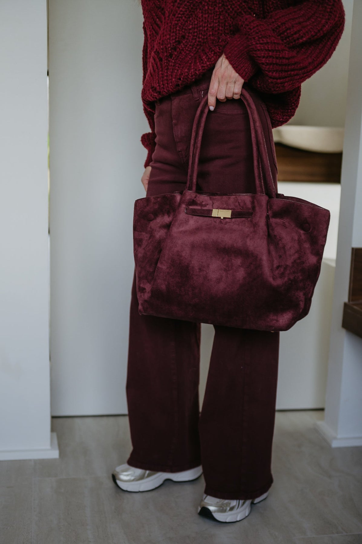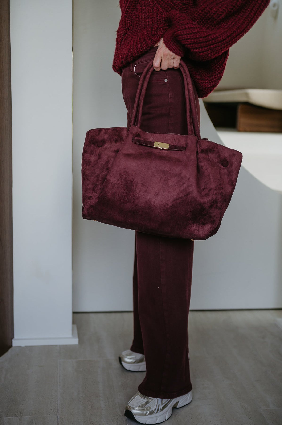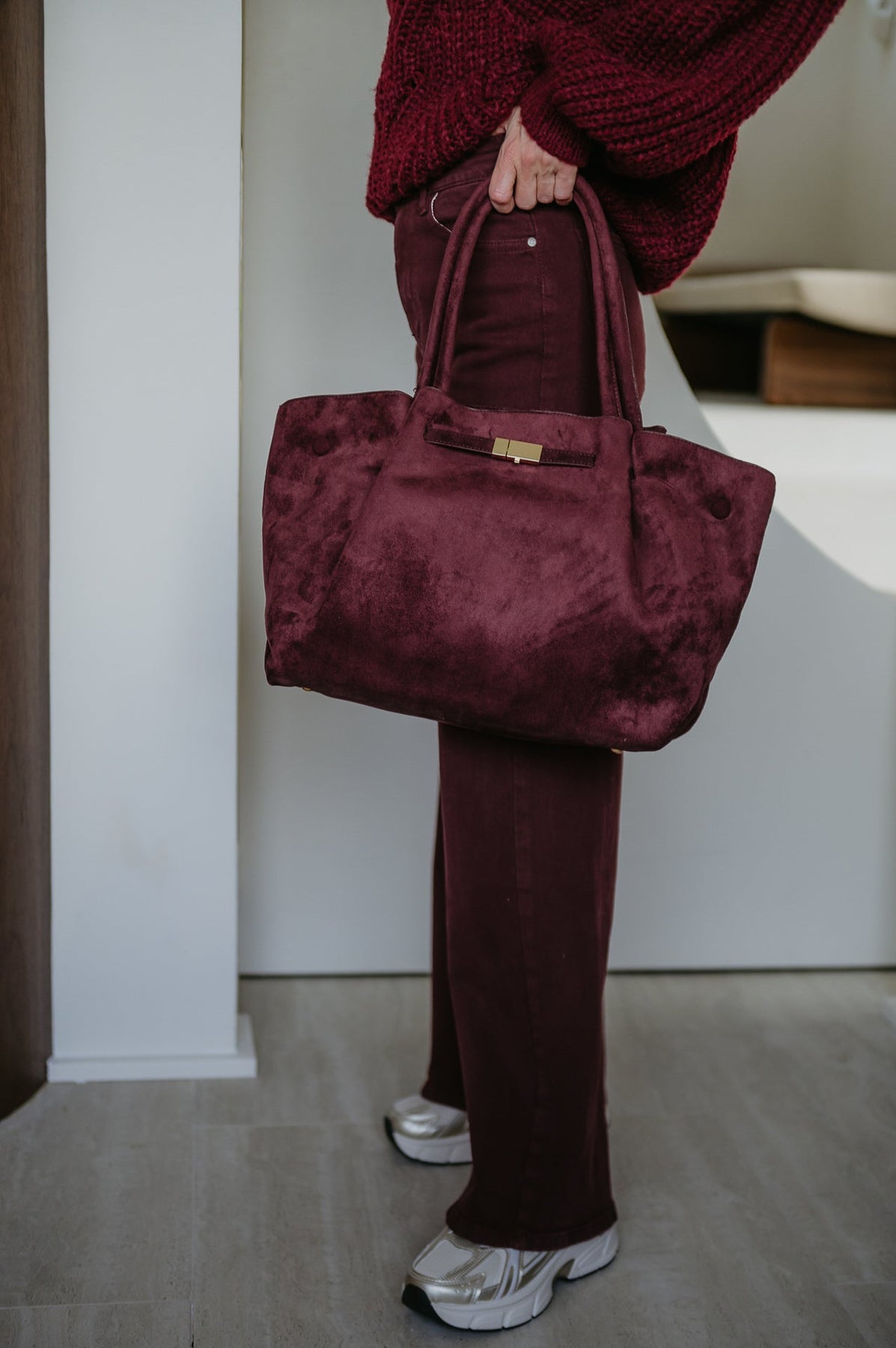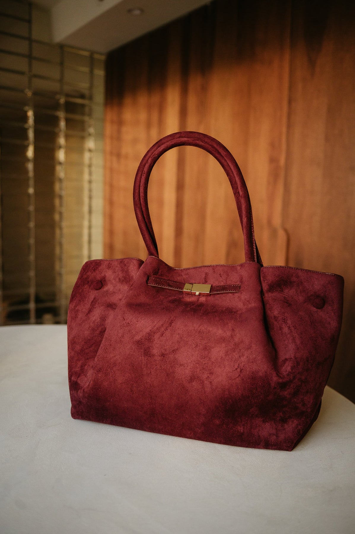 Deze mooie grote handtas in nep suède is een echte eyecatcher.