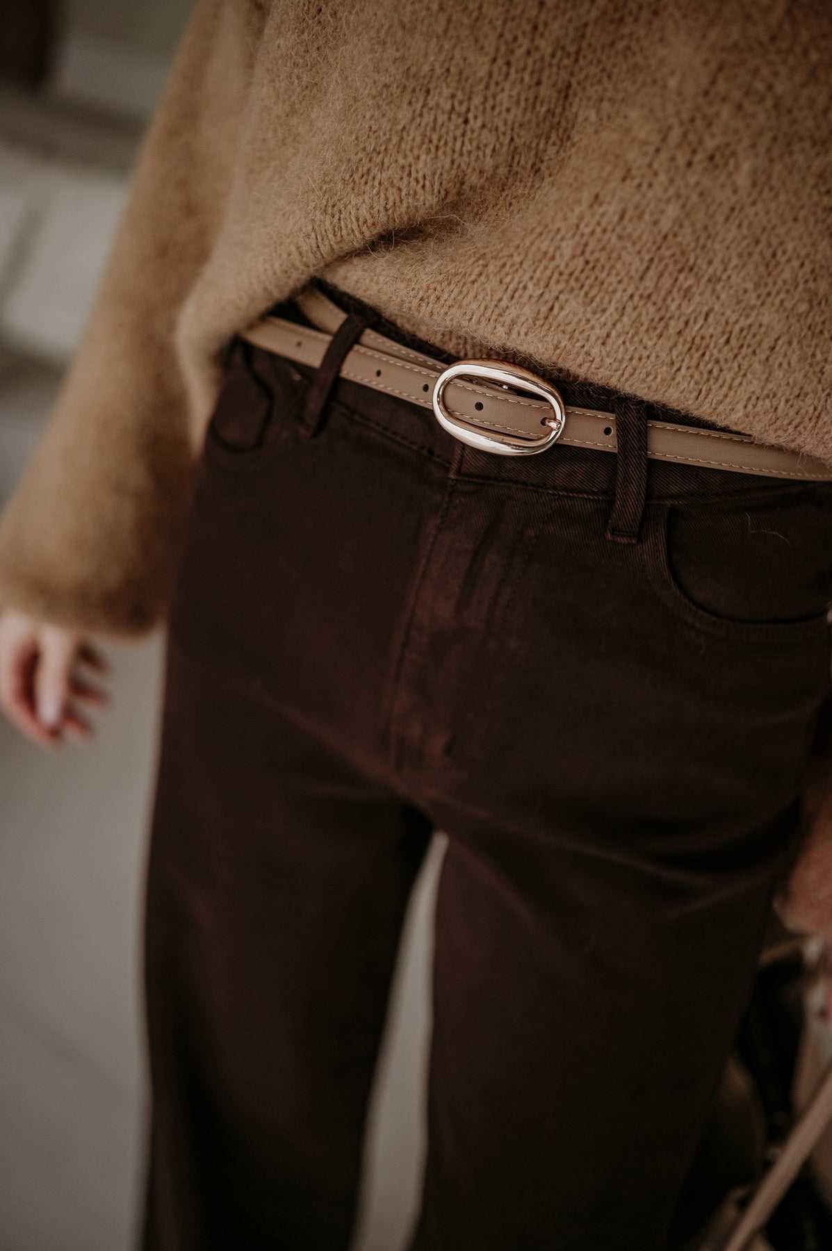 Dun taupe riempje dat elke outfit een subtiele, stijlvolle touch geeft.