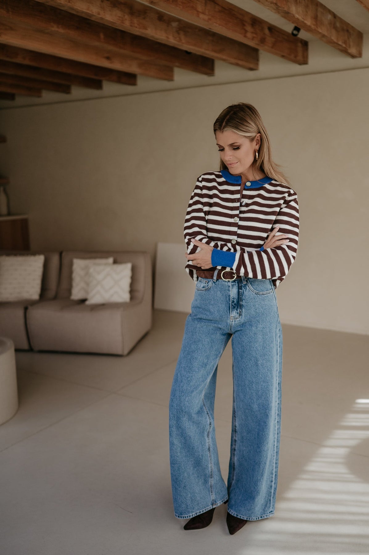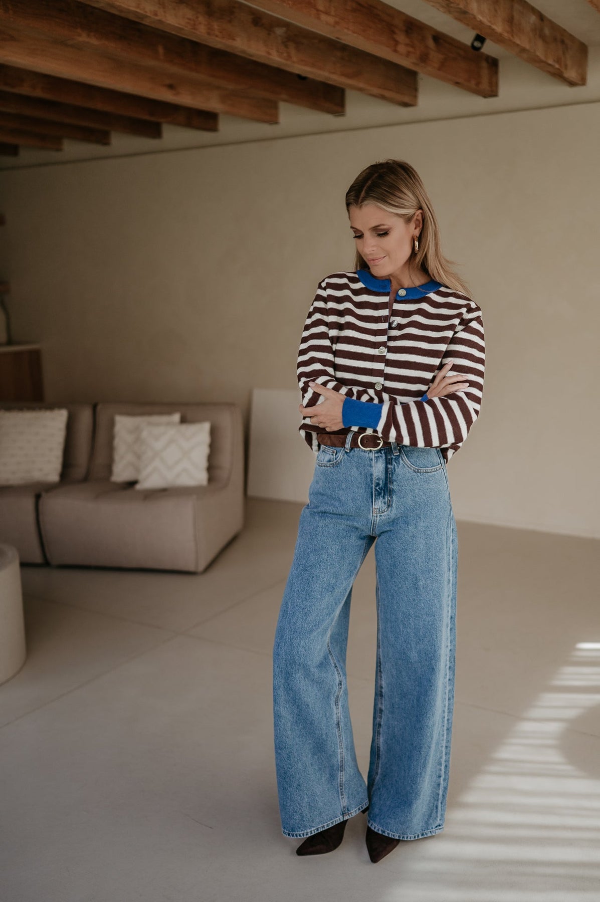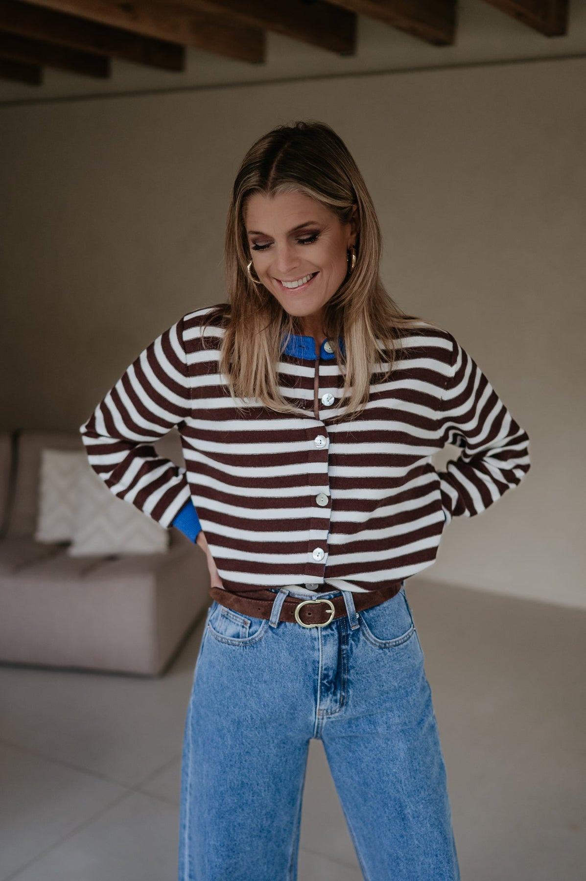 Deze prachtige cardigan combineert chocoladebruine en ecru strepen met kobaltblauwe accenten aan de hals en mouwen.