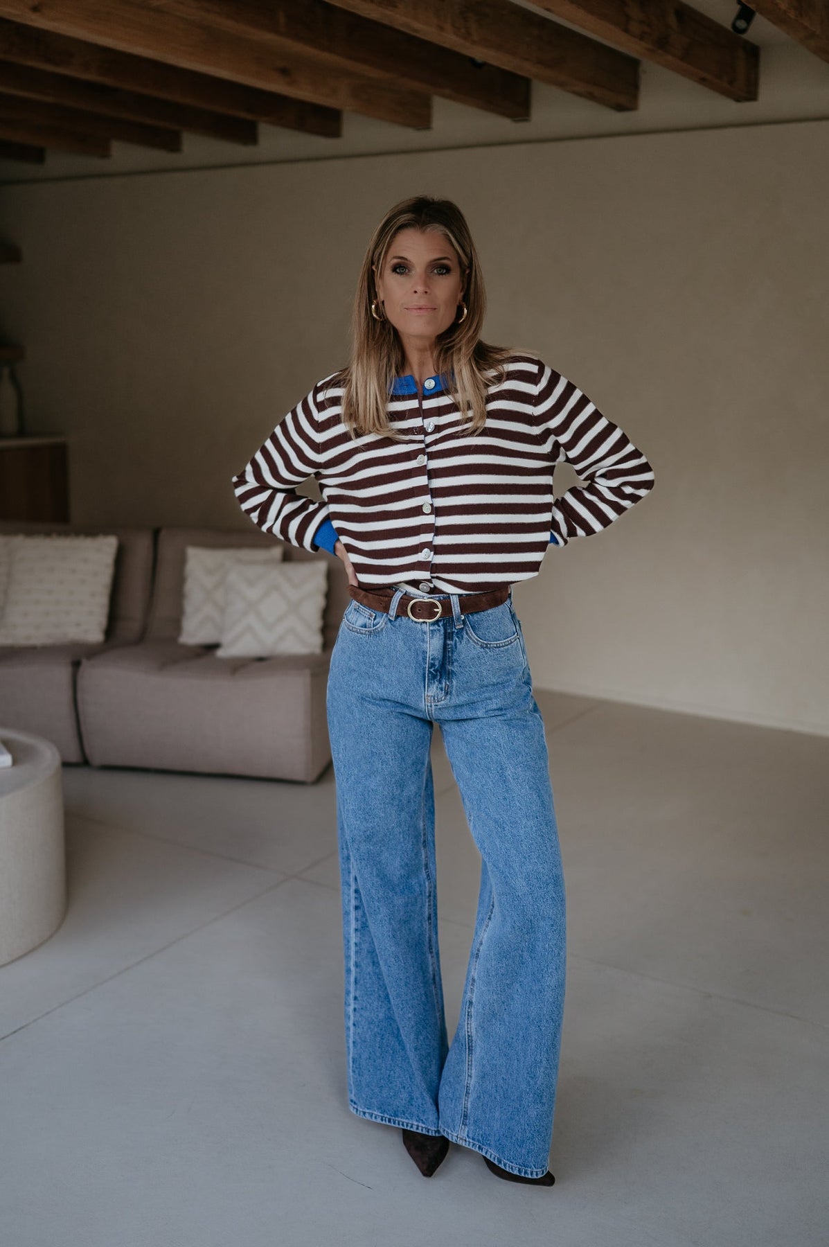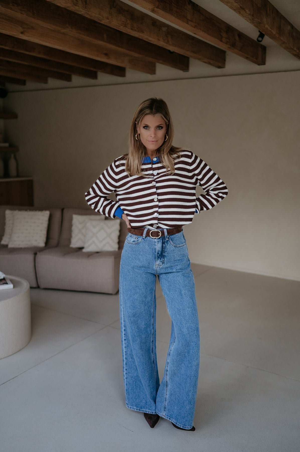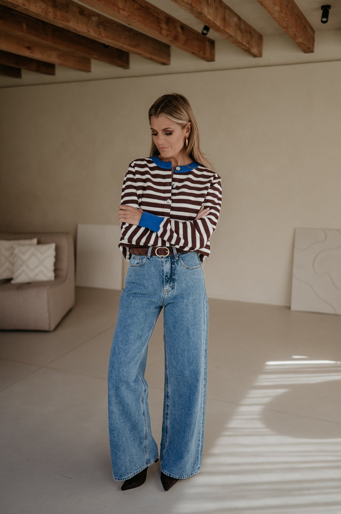 Deze prachtige cardigan combineert chocoladebruine en ecru strepen met kobaltblauwe accenten aan de hals en mouwen.