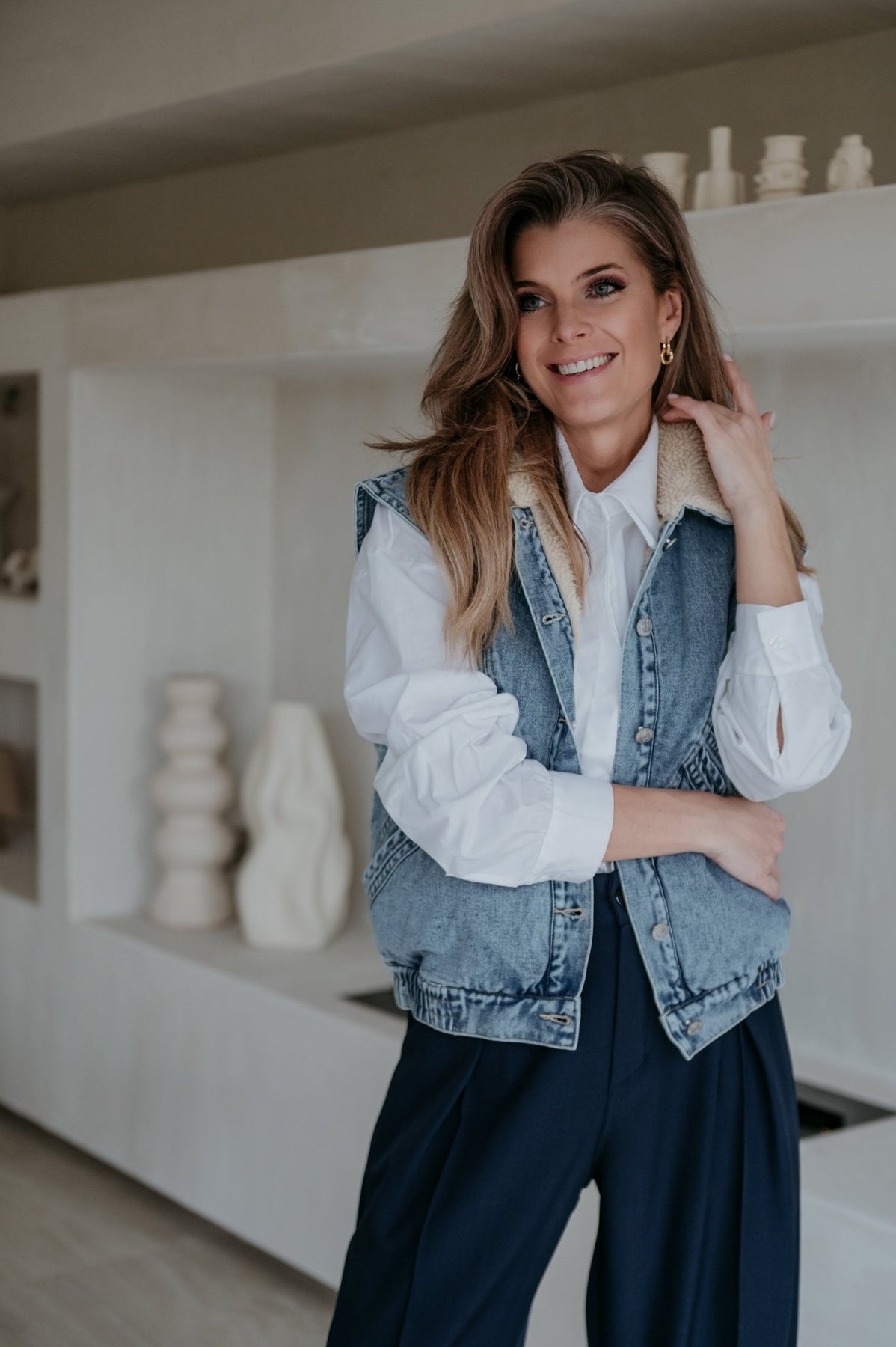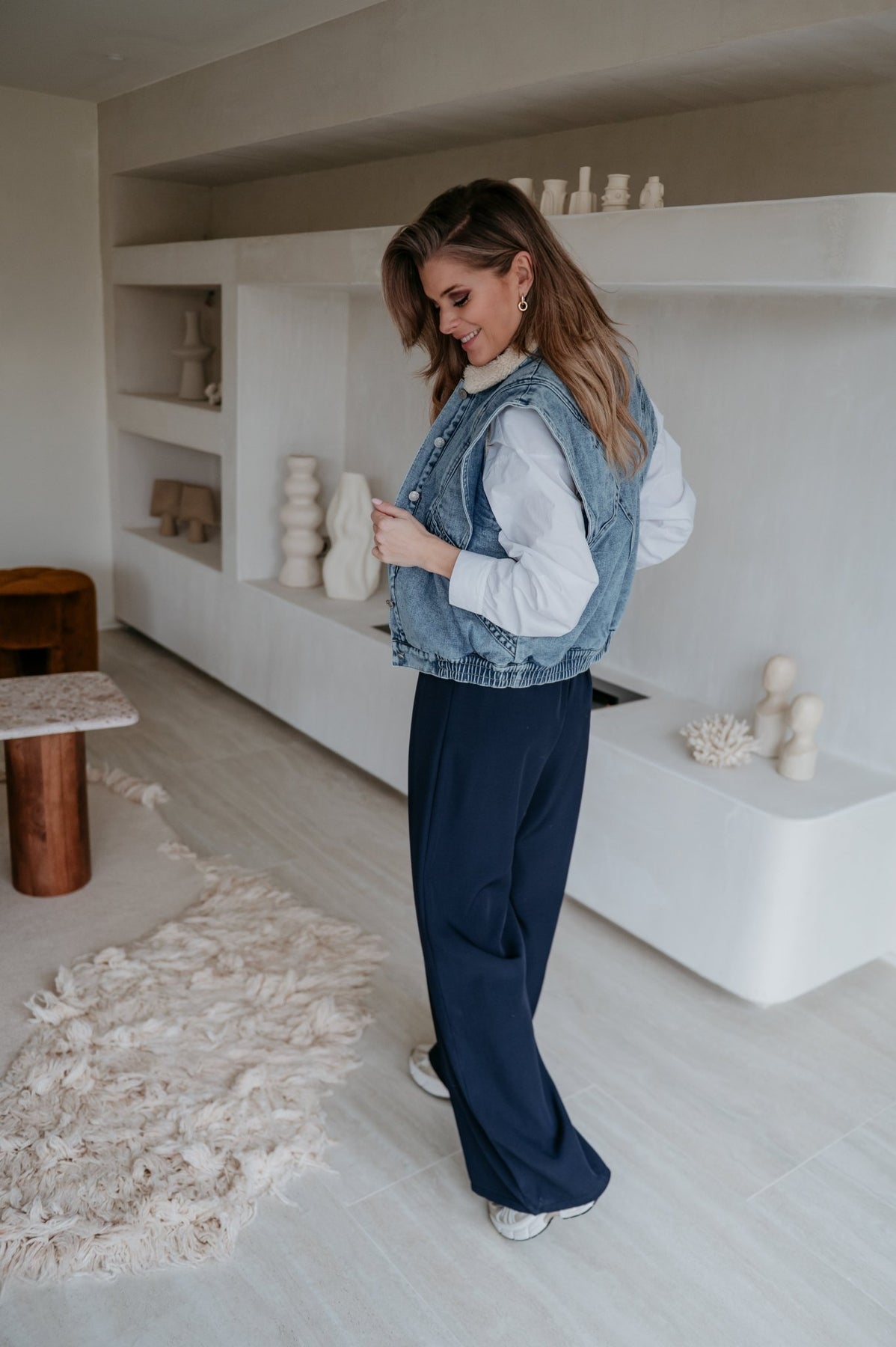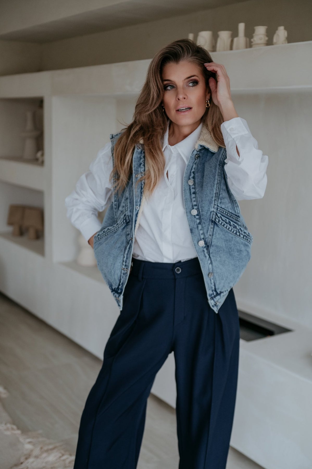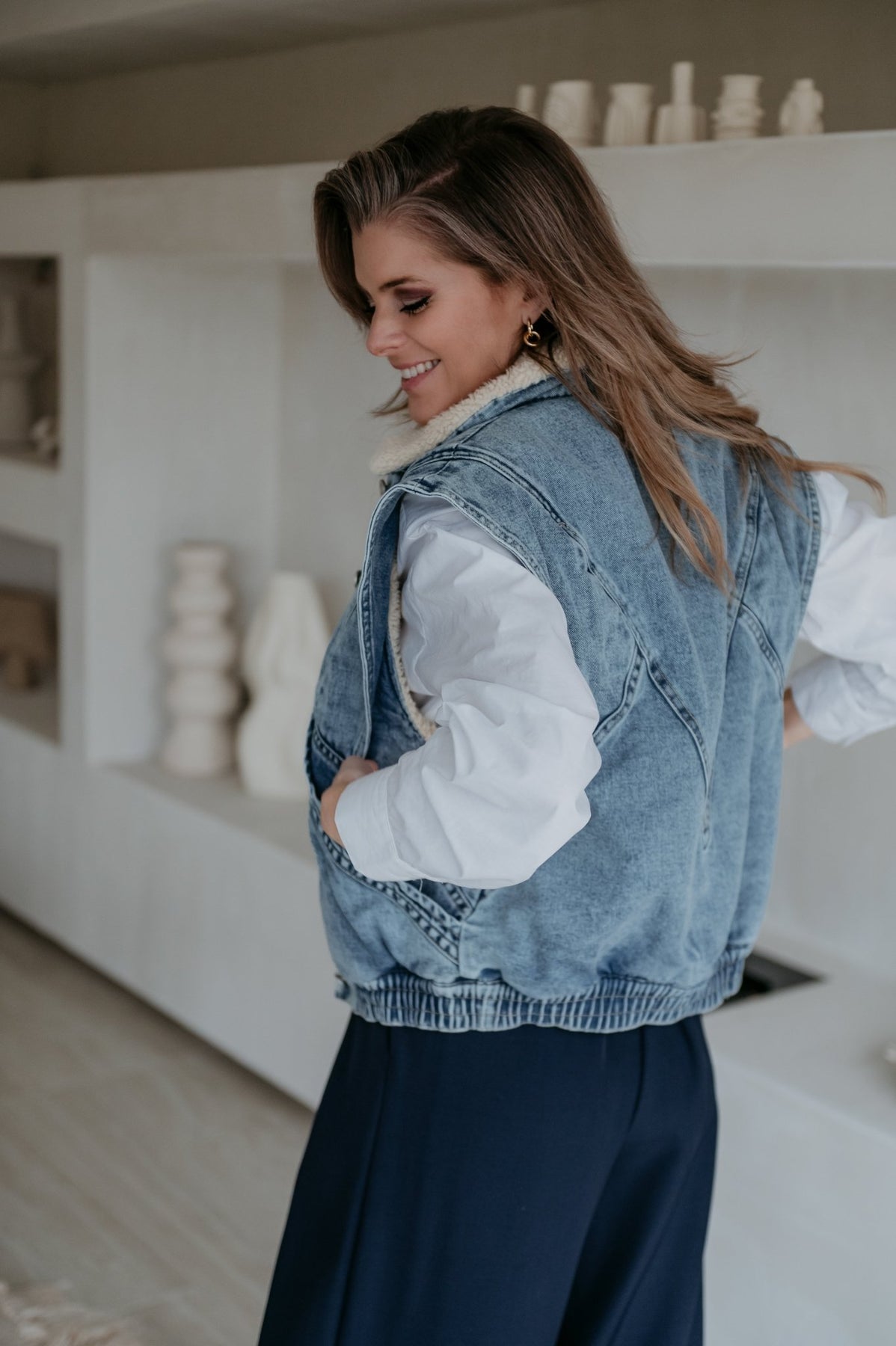 Kei toffe jeans gilet met een zacht beige pelsje aan de binnenkant, ideaal voor de koelere dagen.