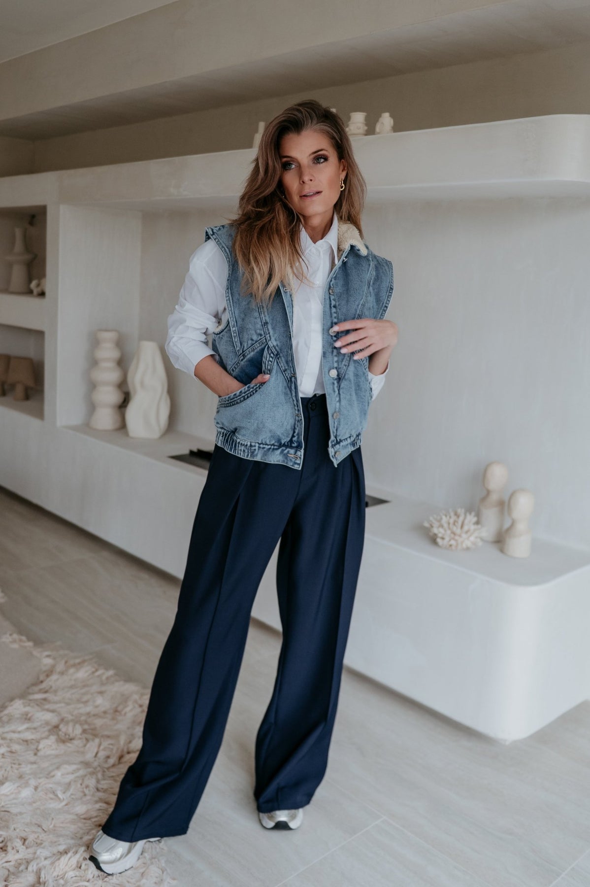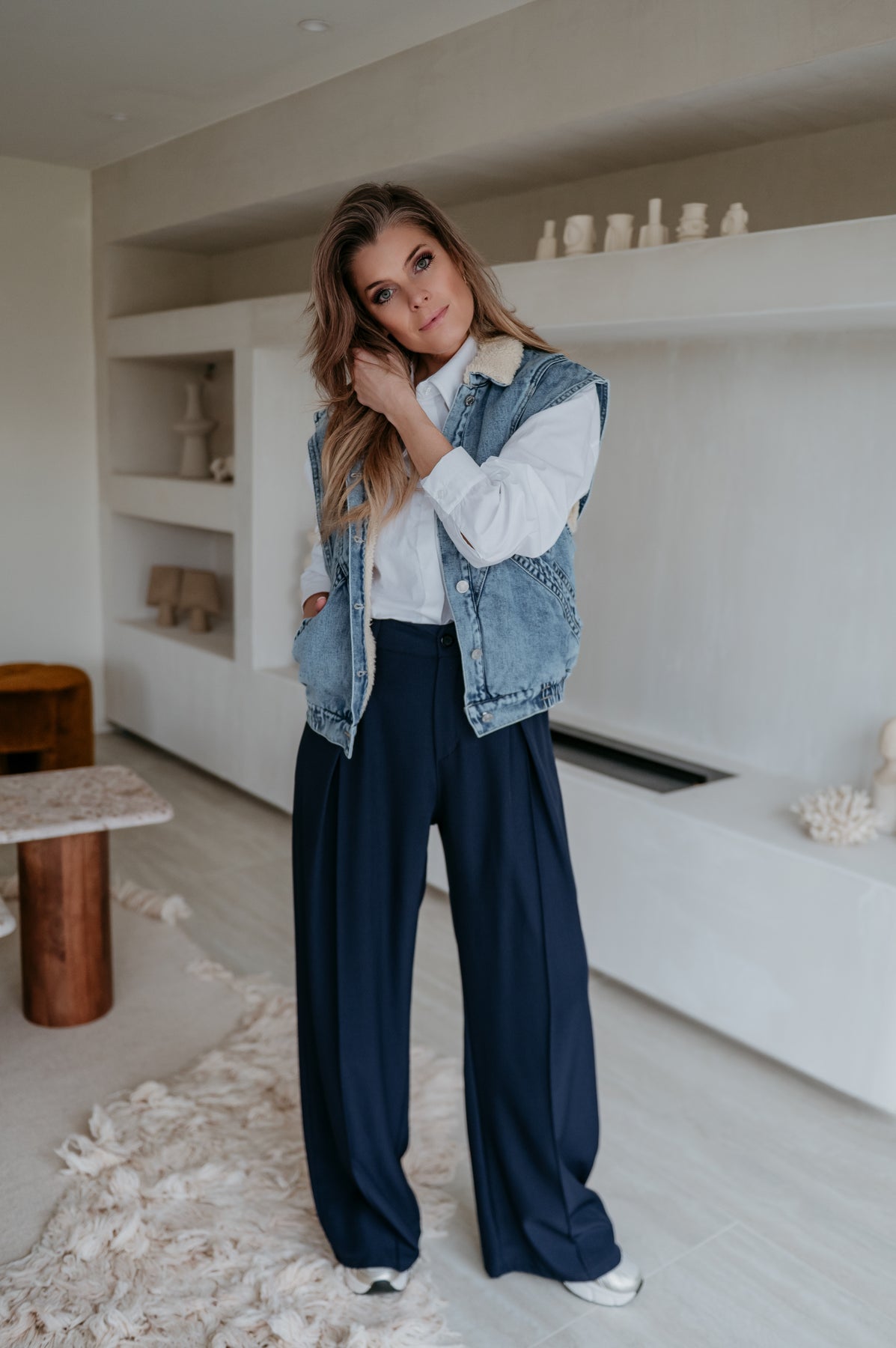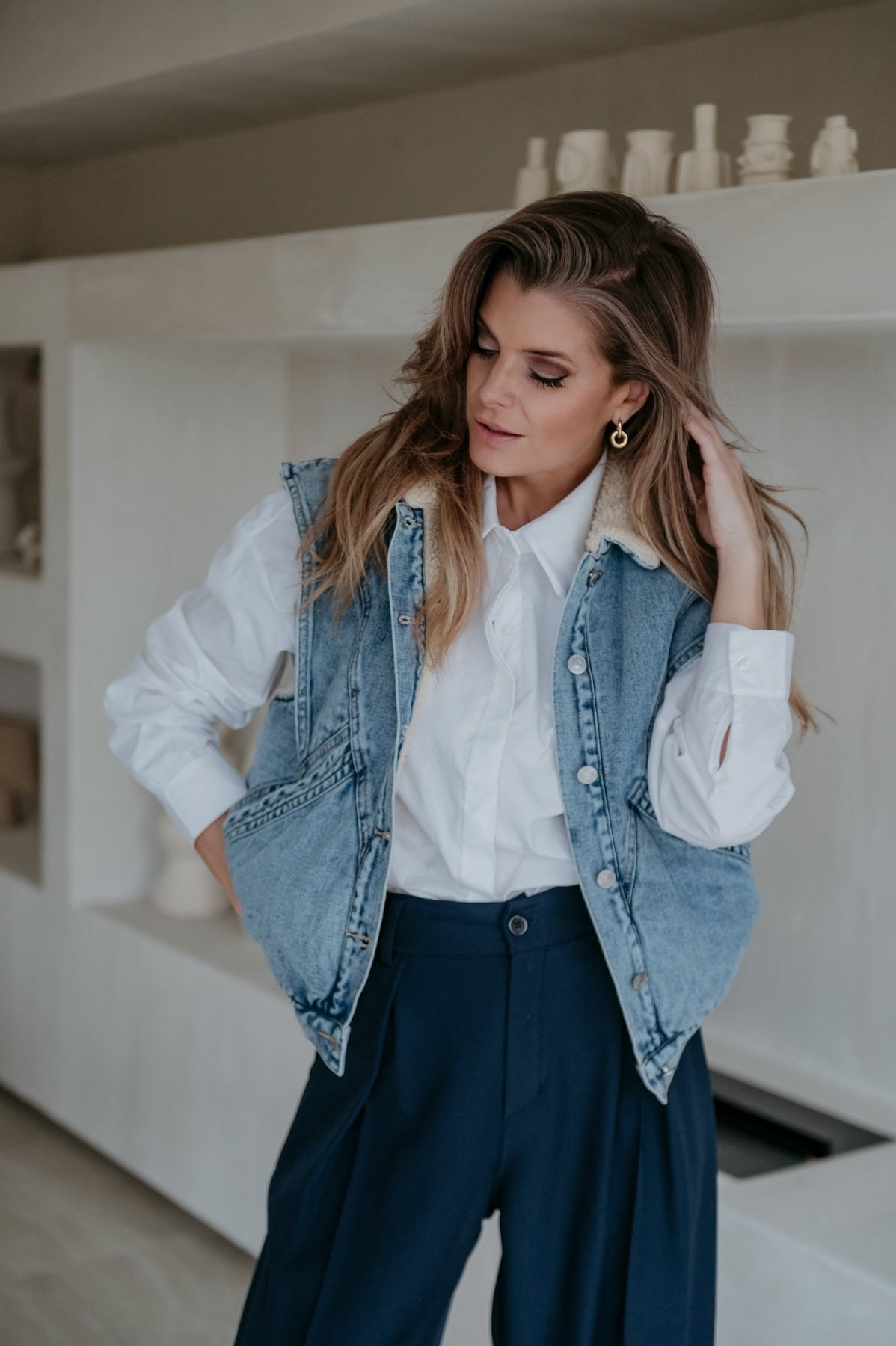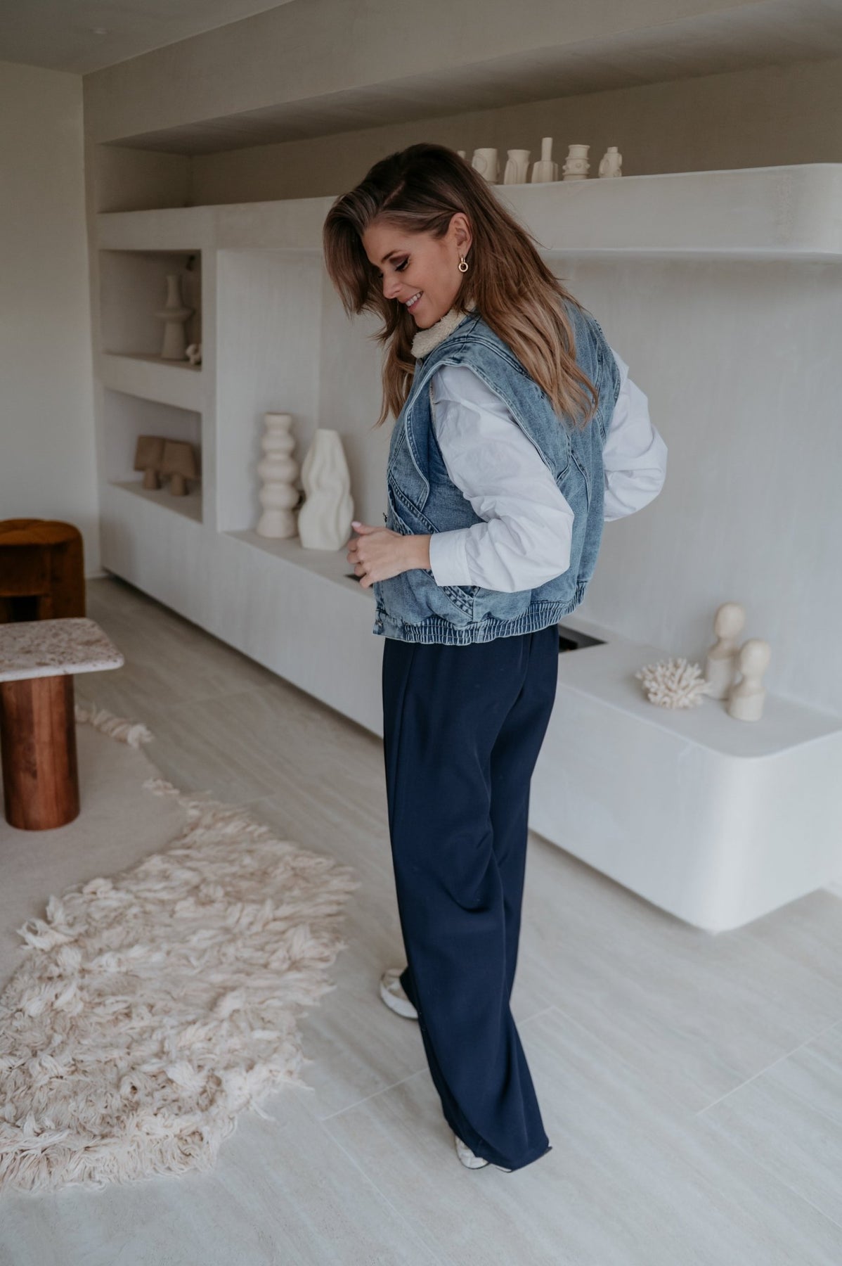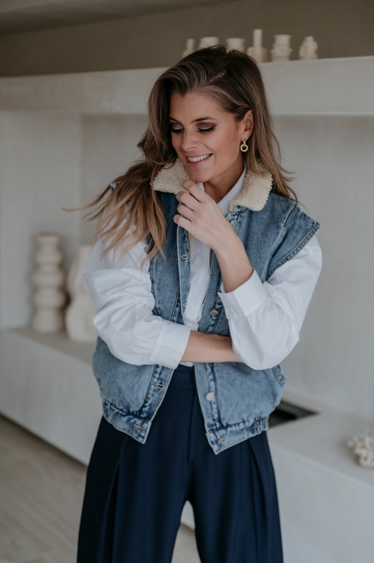 Kei toffe jeans gilet met een zacht beige pelsje aan de binnenkant, ideaal voor de koelere dagen.