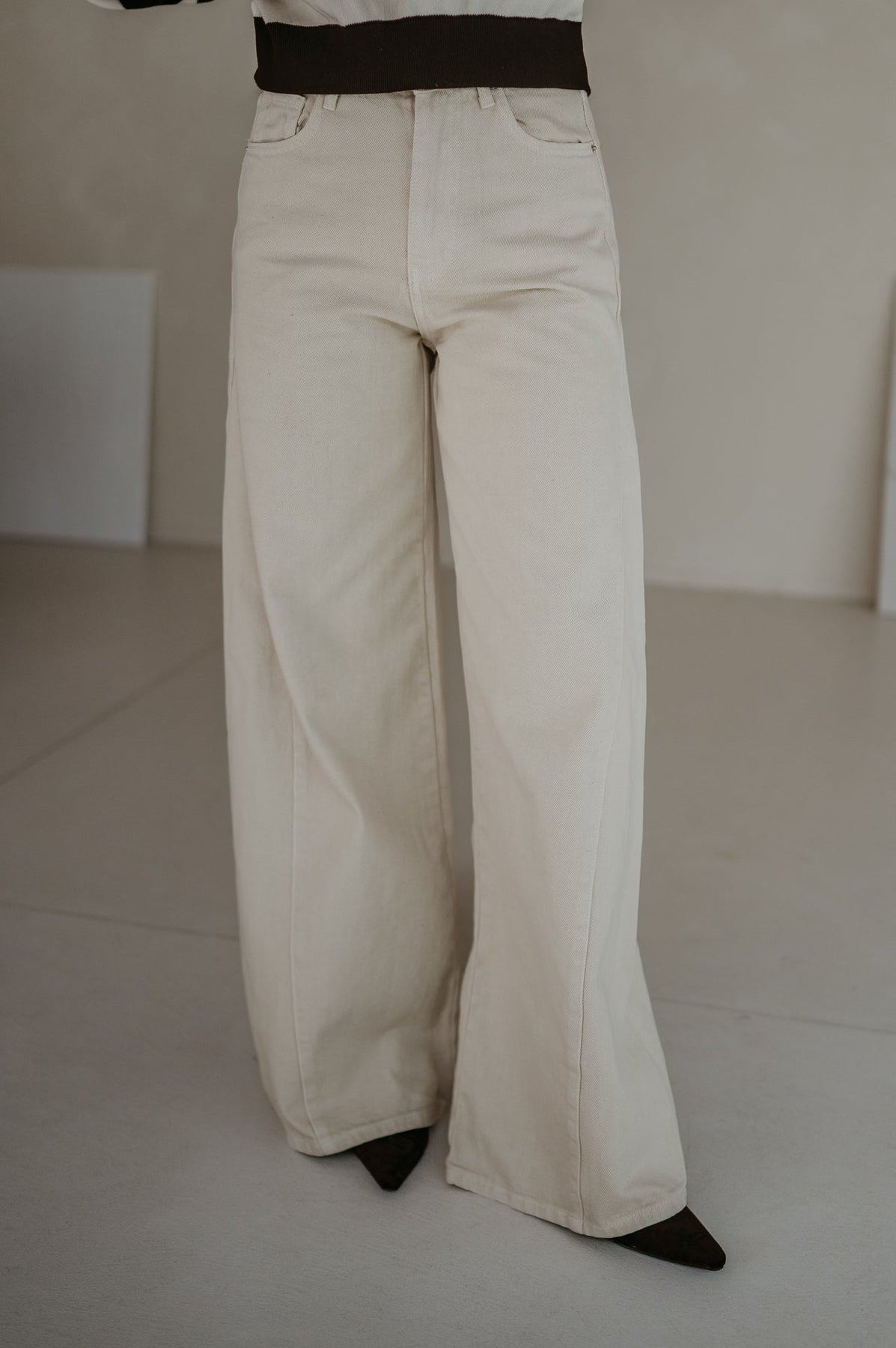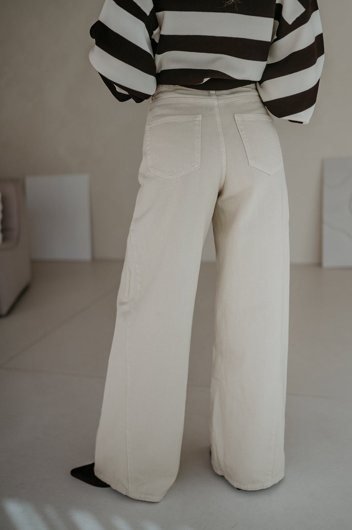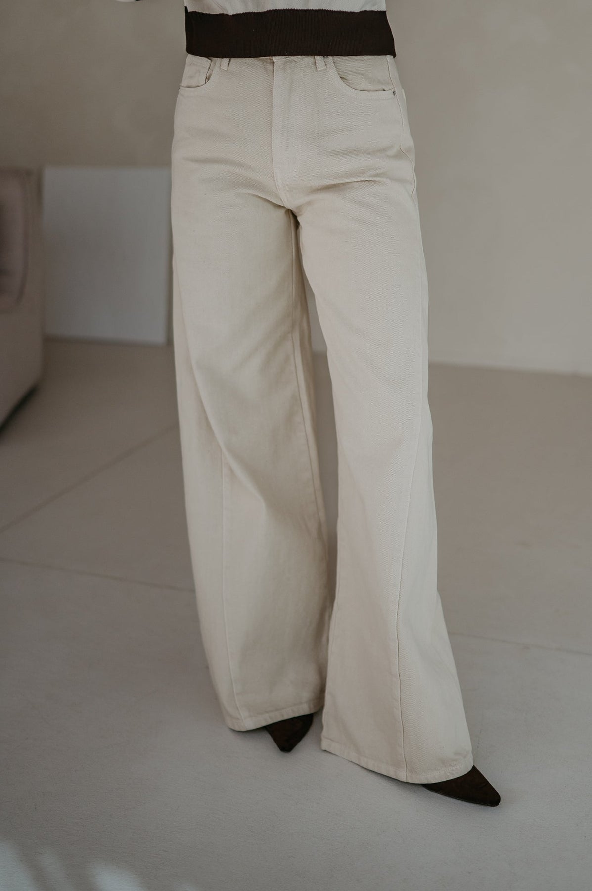 Deze prachtige beige brede jeans moet je echt hebben voor de herfst.