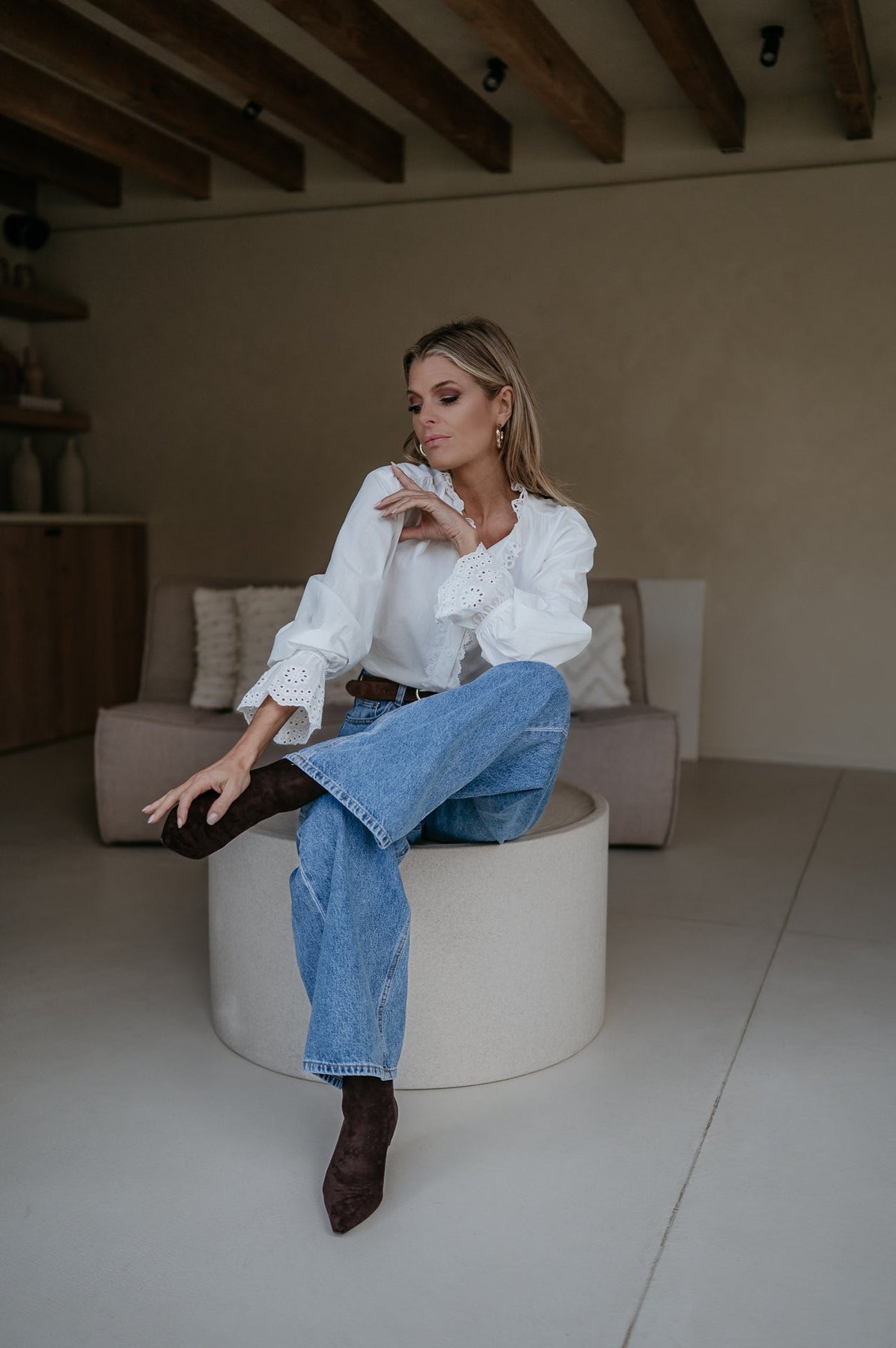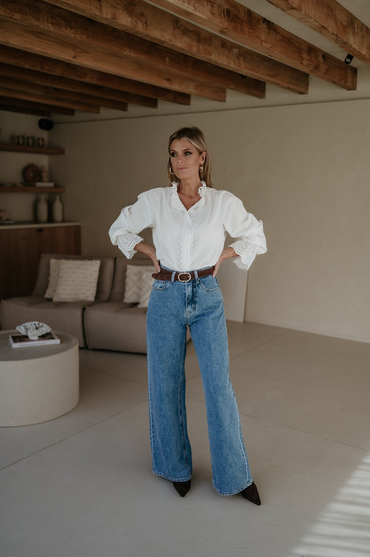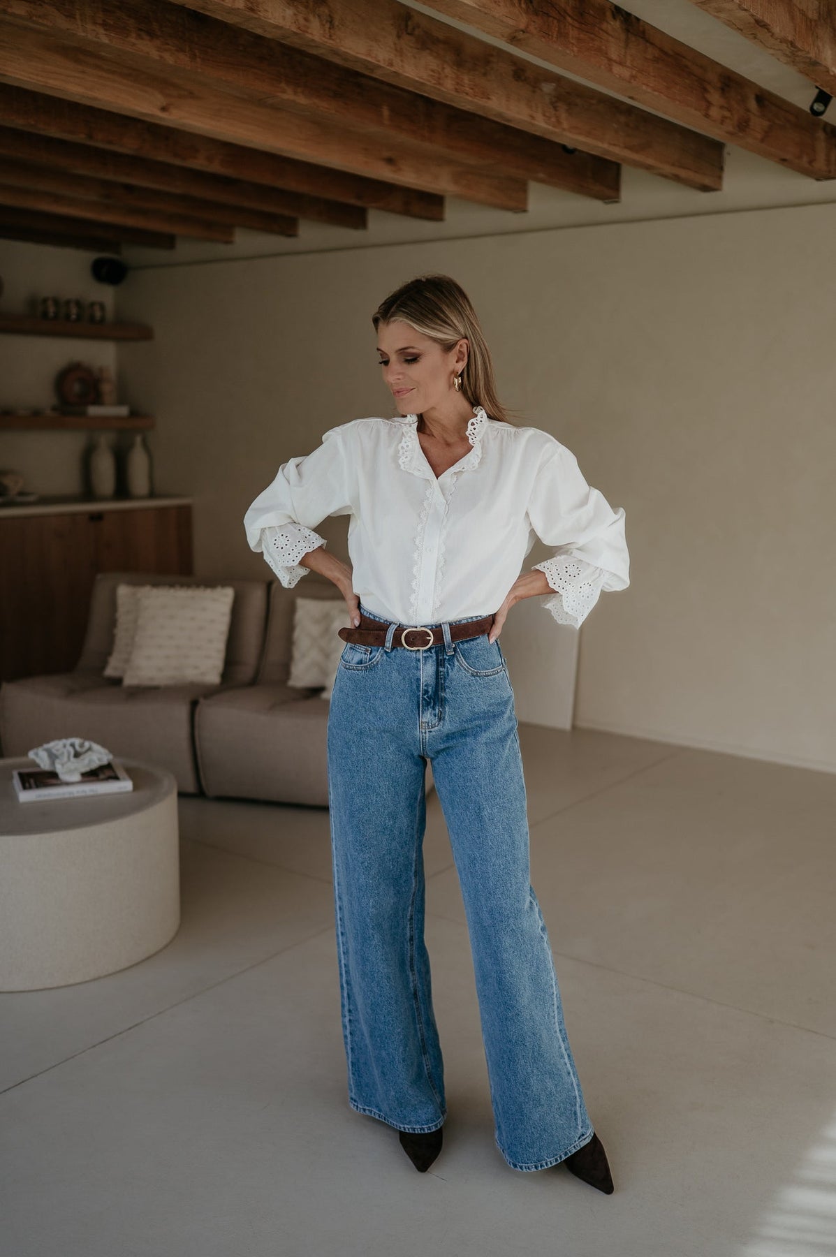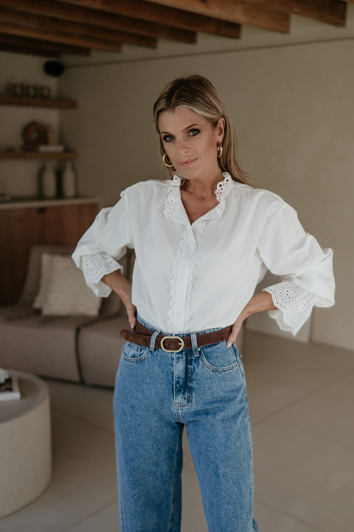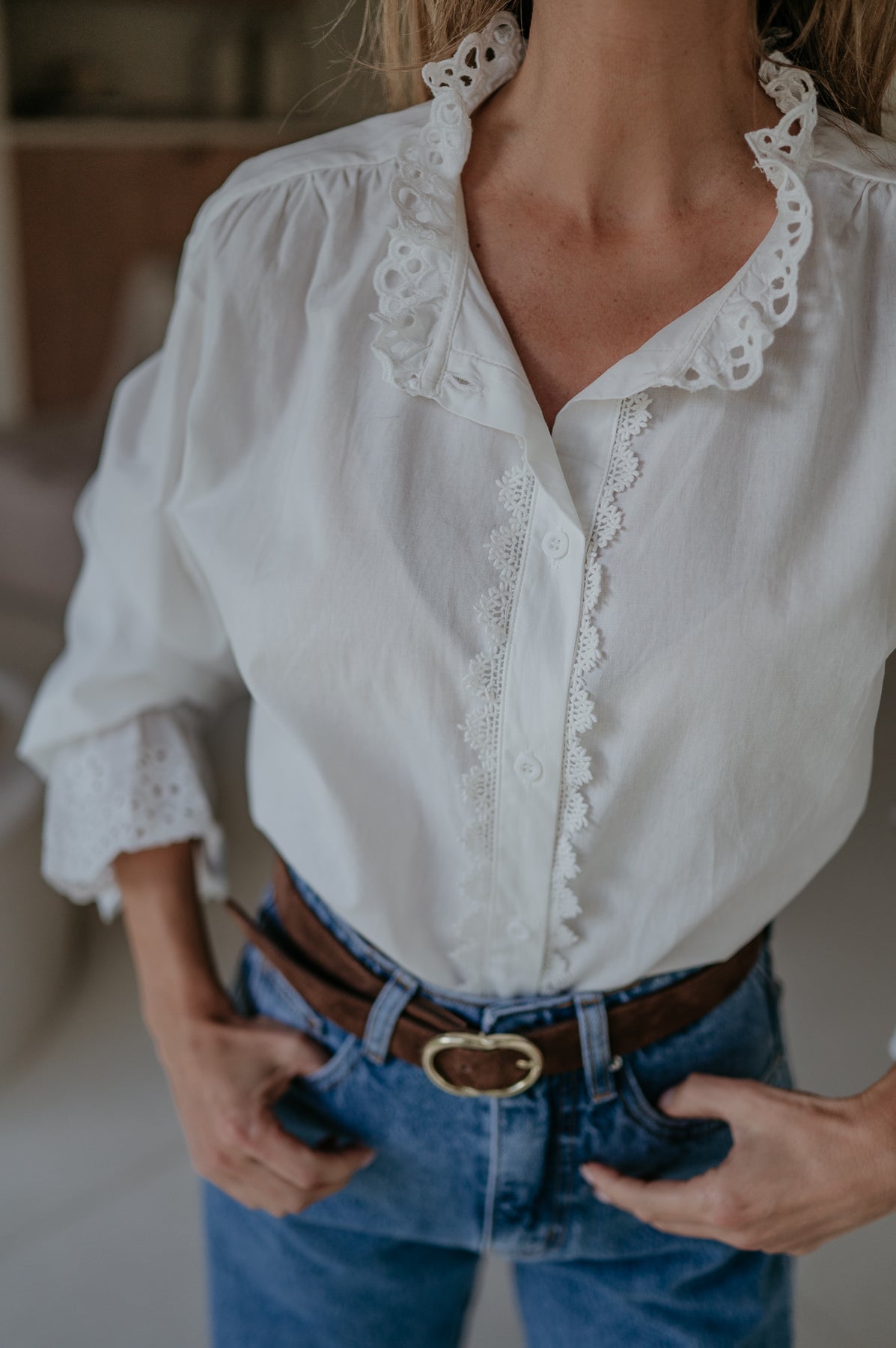 Deze witte blouse met prachtige kanten details aan de mouwen straalt pure elegantie uit. De subtiele afwerking geeft een romantische en stijlvolle touch, waardoor dit item perfect is voor zowel casual als geklede gelegenheden.