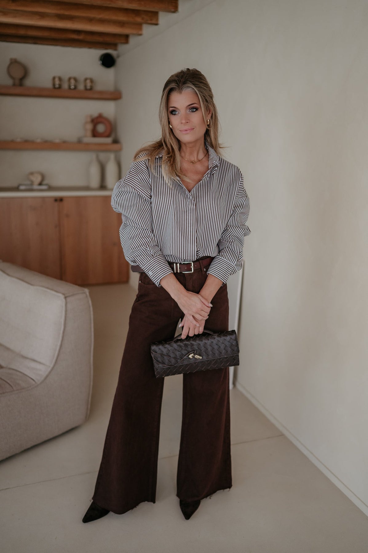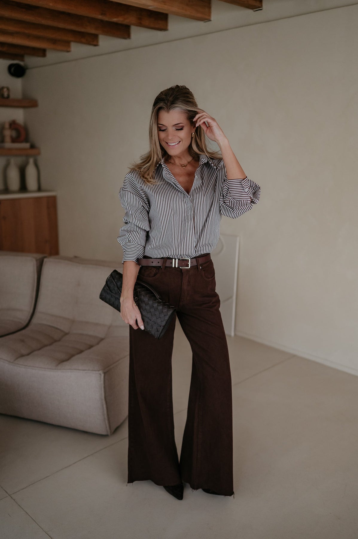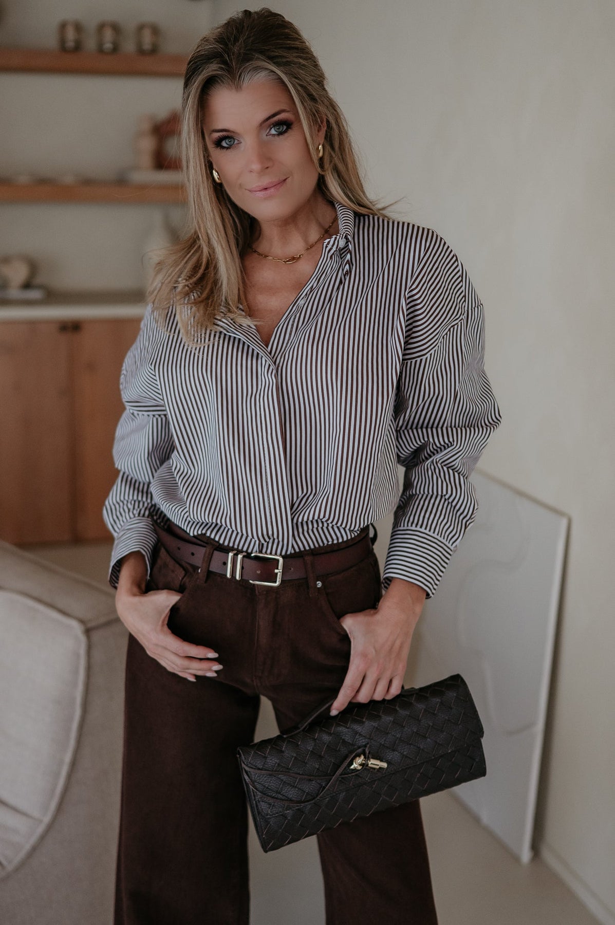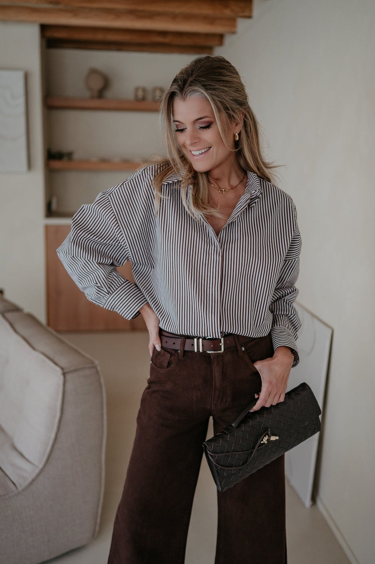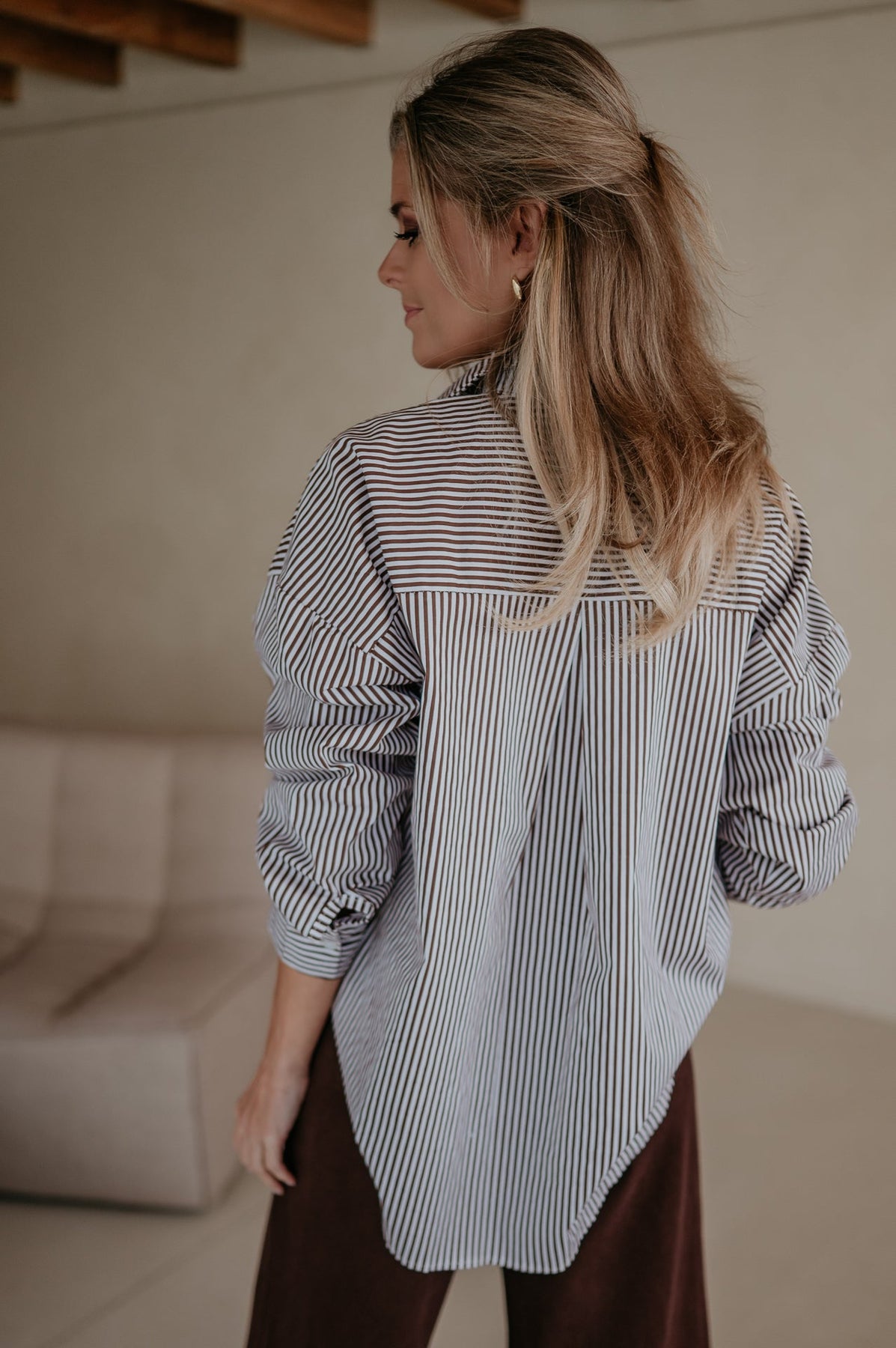 Dit prachtige hemd met chocolade bruine-witte streepjes is een echte essential voor je garderobe.