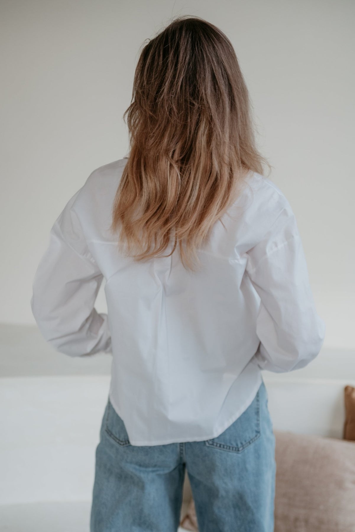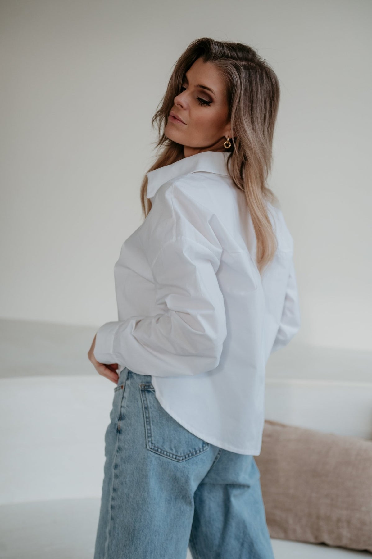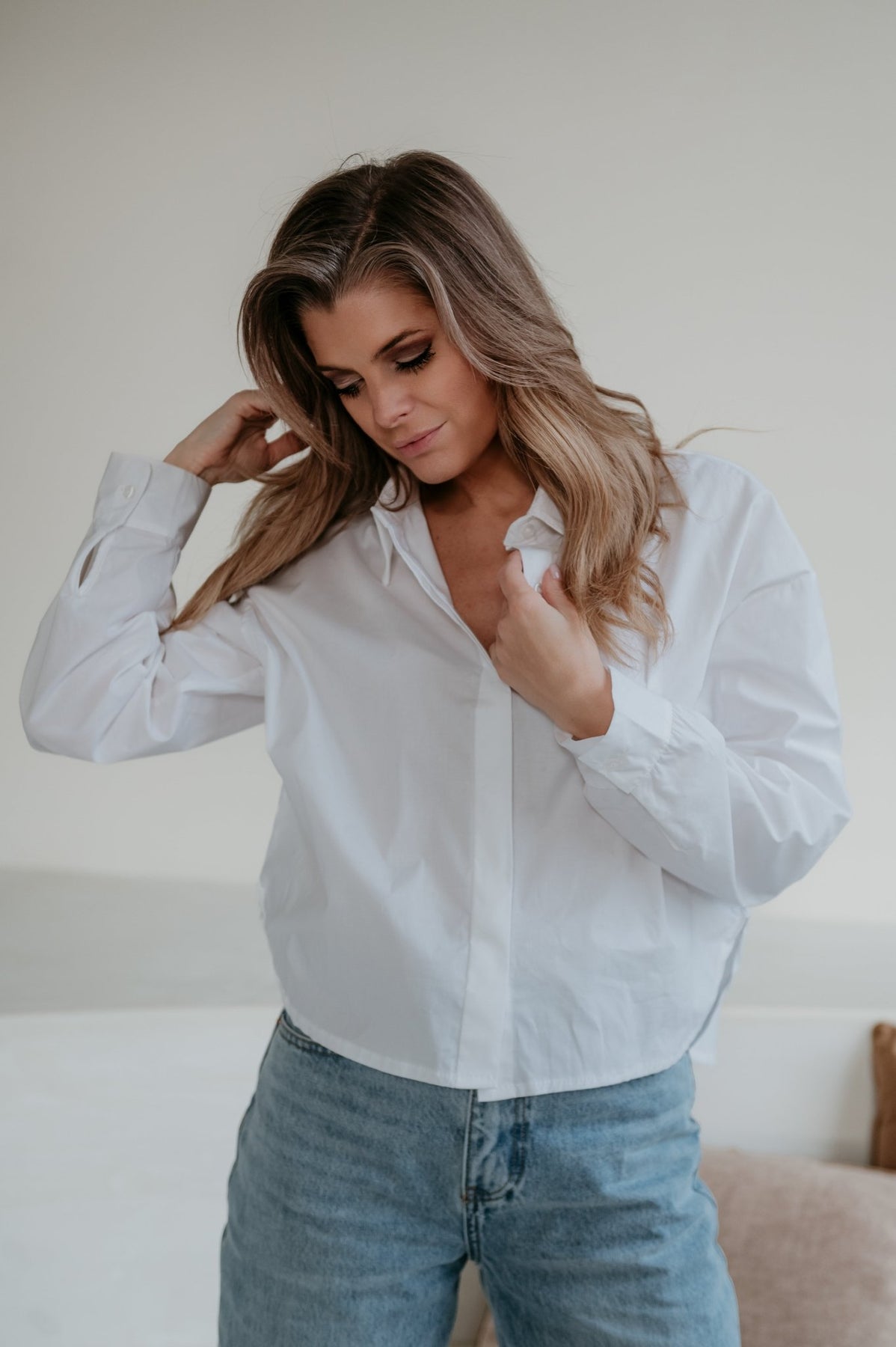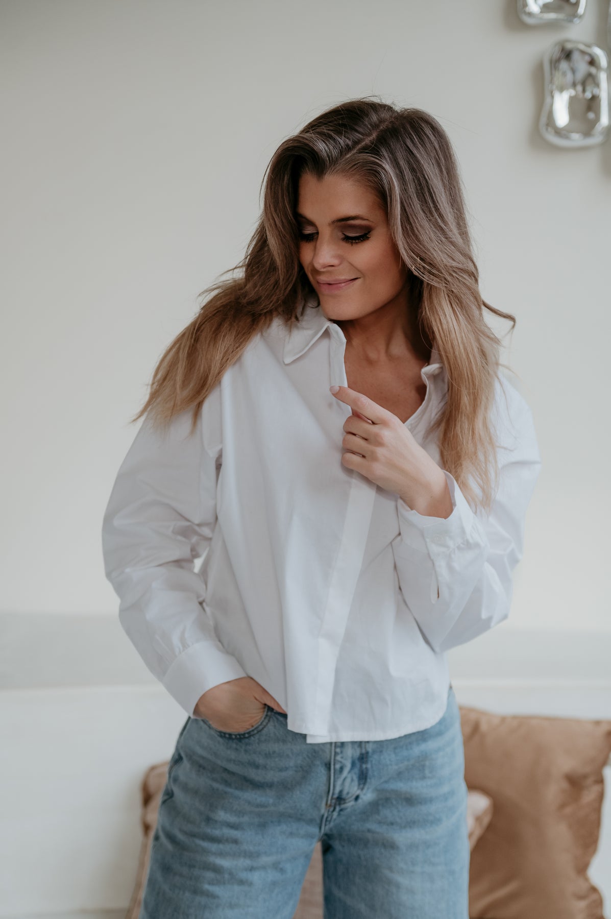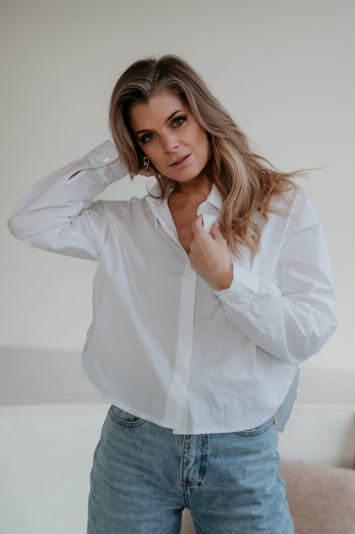 Dit witte hemdje is super tof en komt iets korter, waardoor het perfect is om te dragen op een hoge broek.