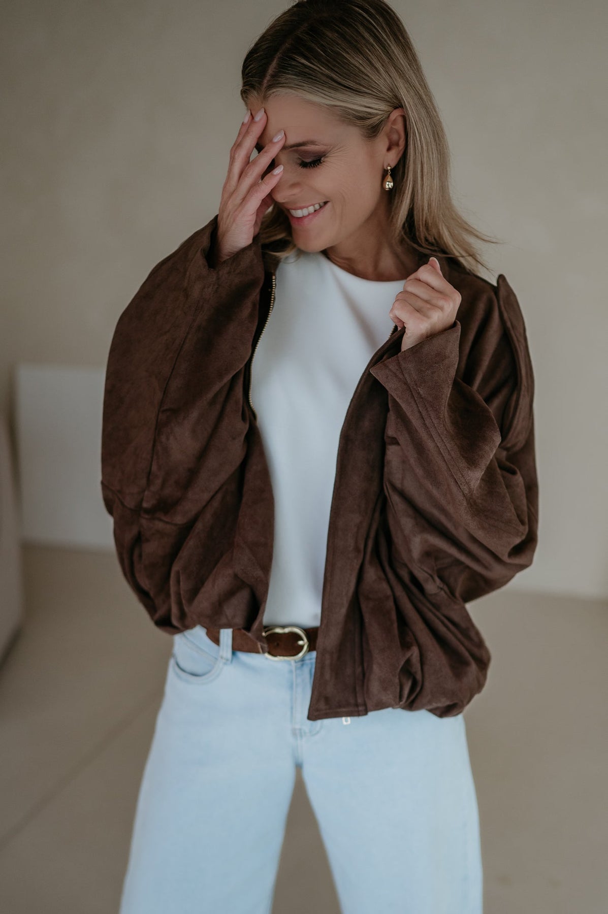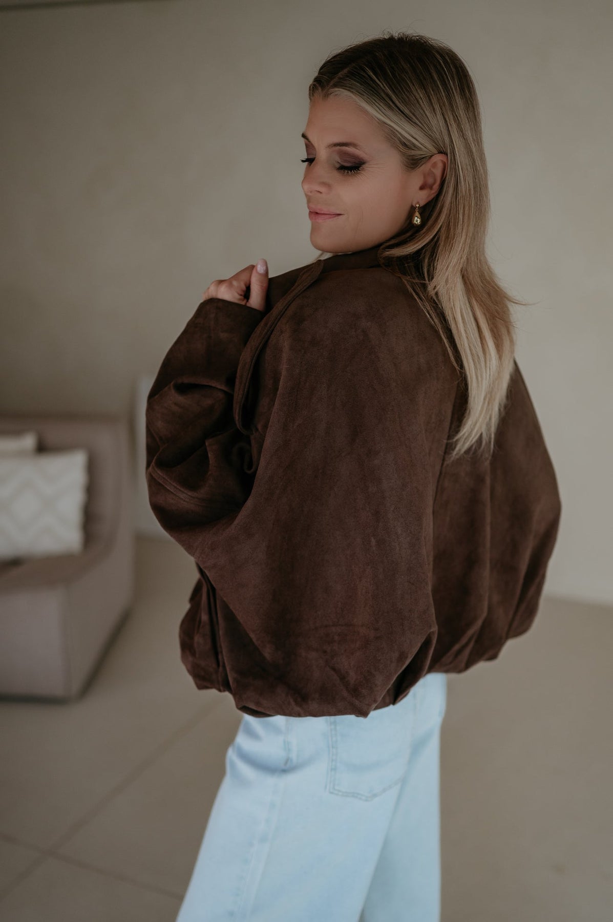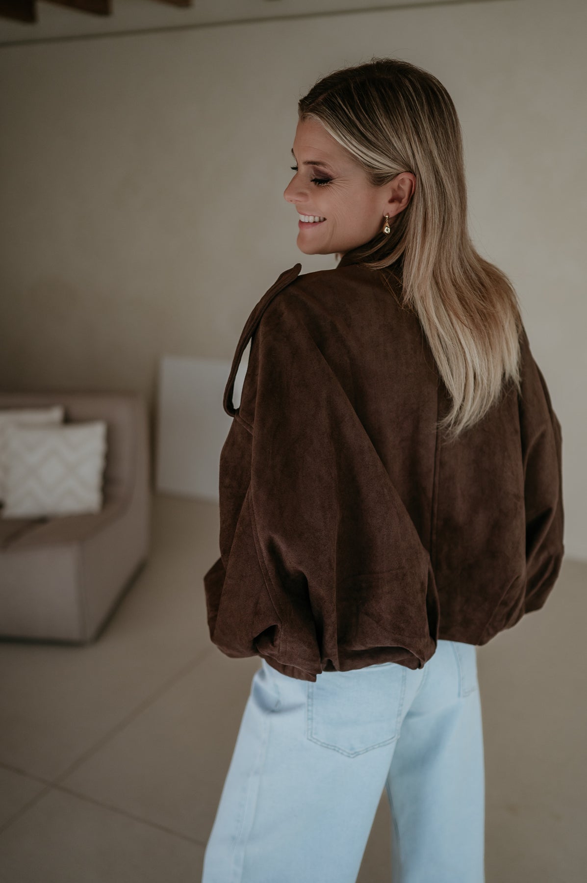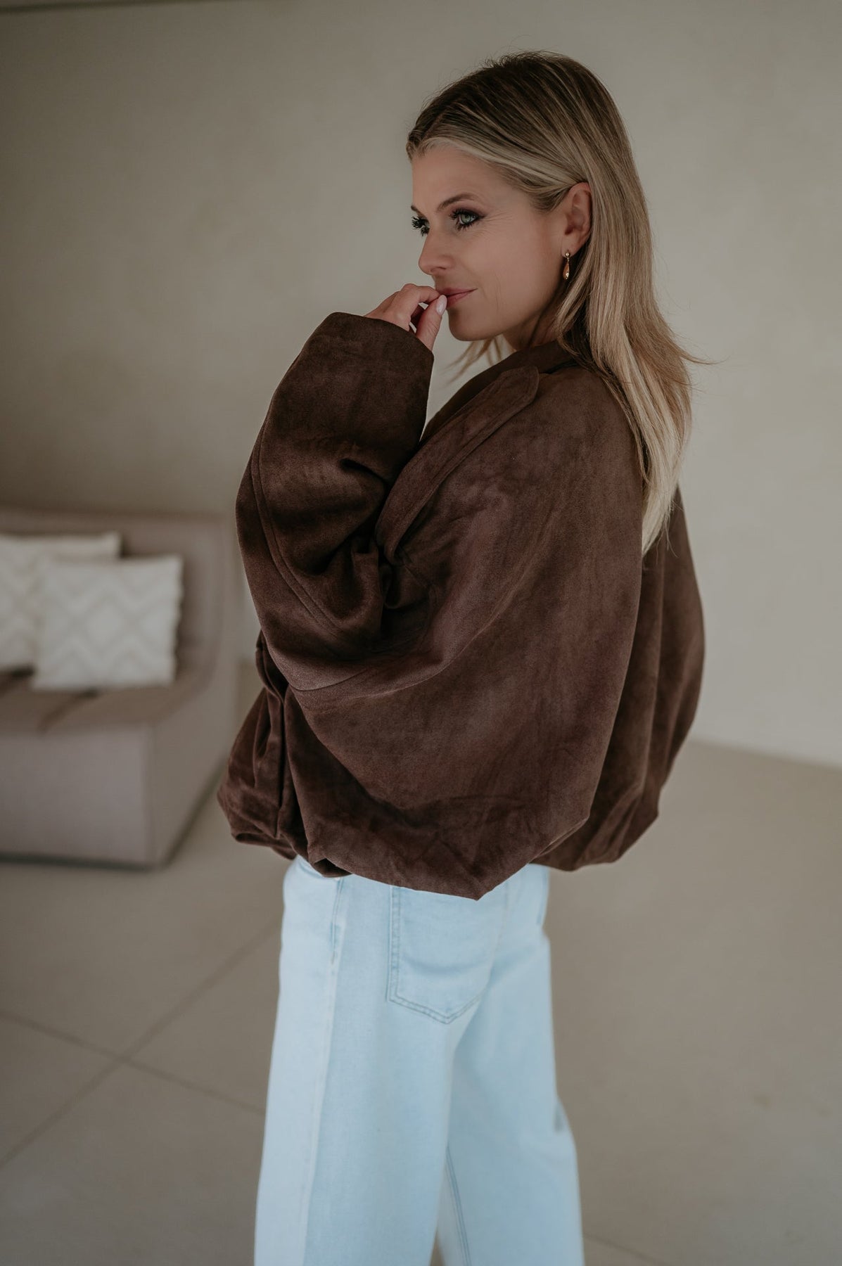 De zachte suède look geeft het jasje een luxe uitstraling, terwijl de chocolade bruine kleur zorgt voor een stoere, stijlvolle vibe.