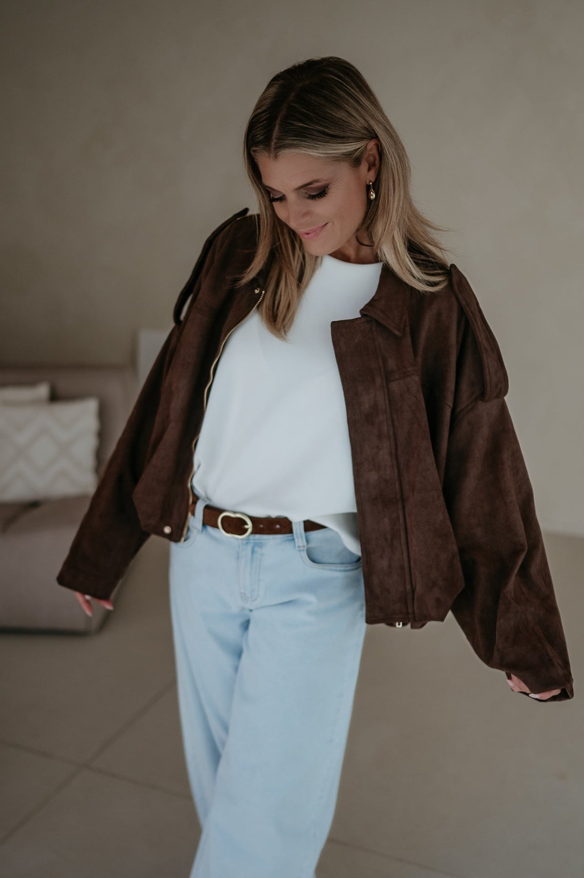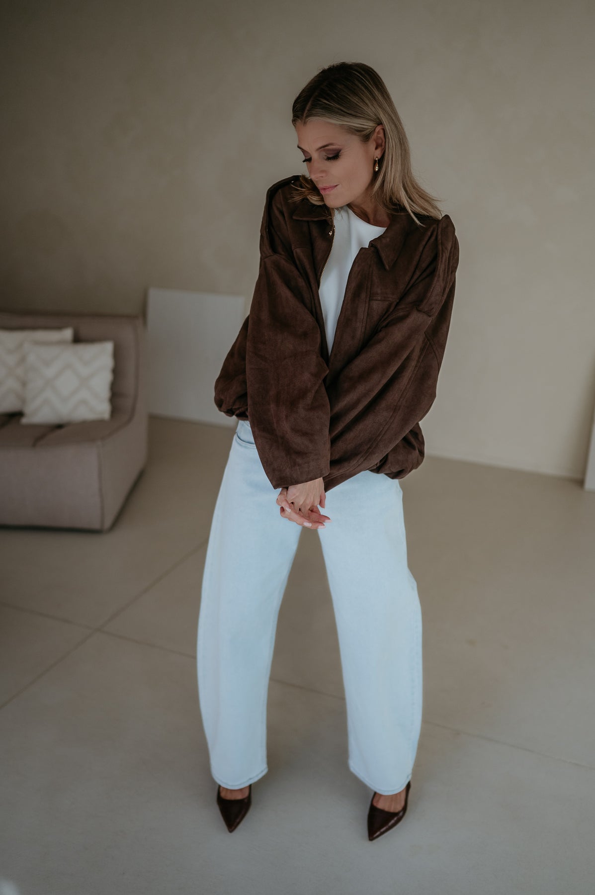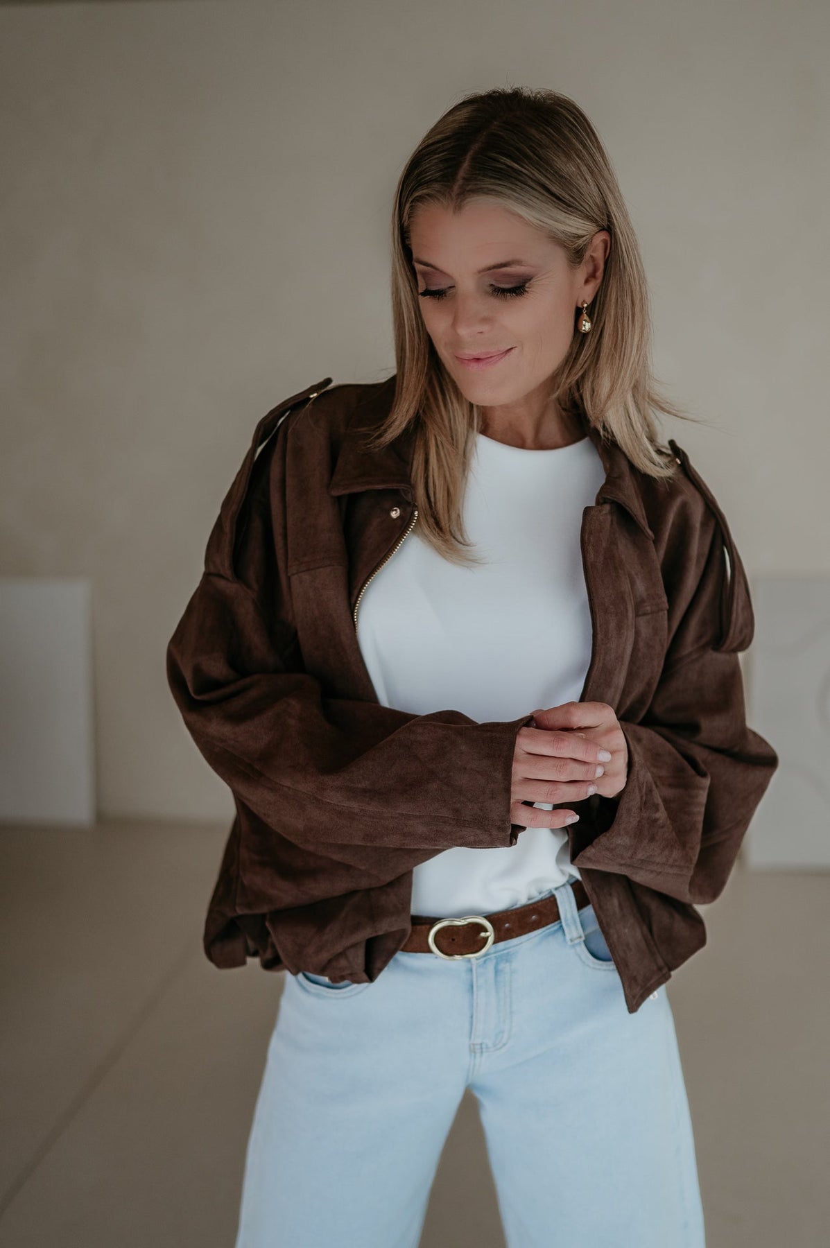 De zachte suède look geeft het jasje een luxe uitstraling, terwijl de chocolade bruine kleur zorgt voor een stoere, stijlvolle vibe.