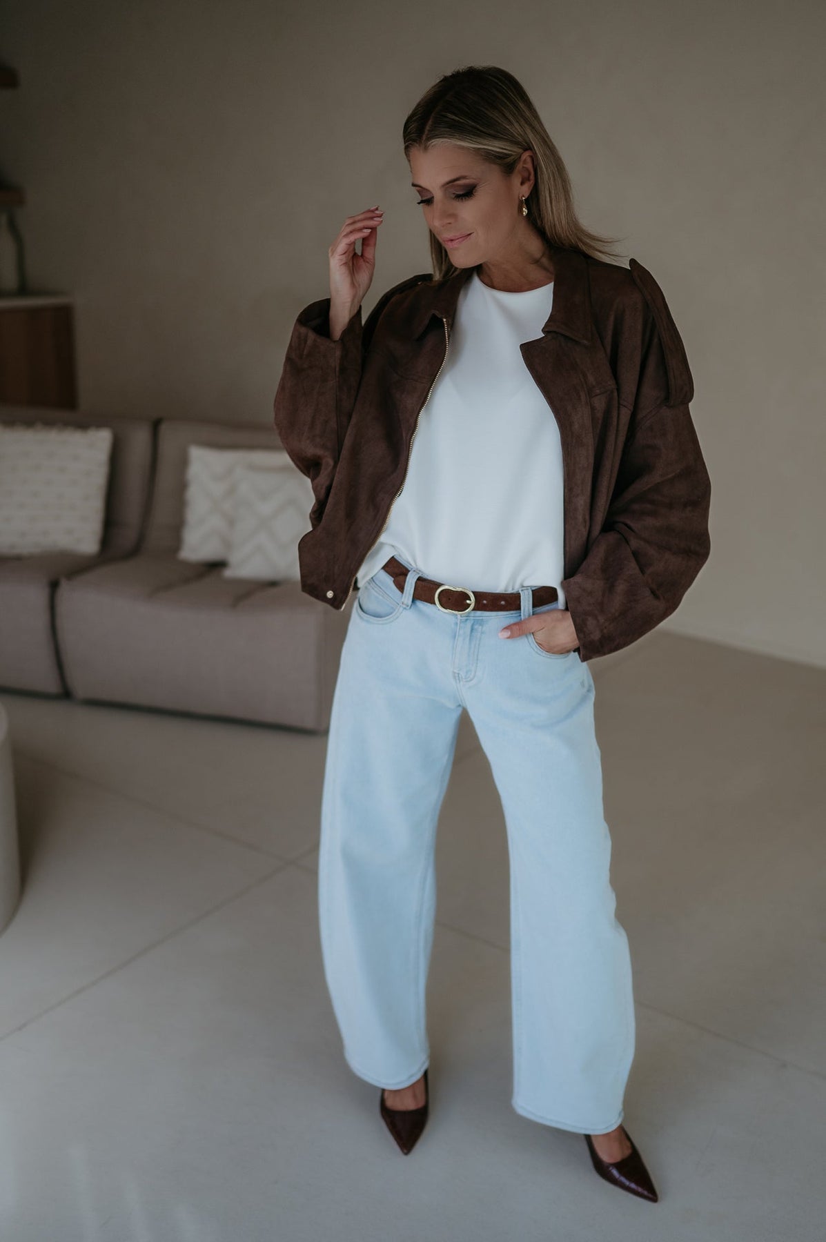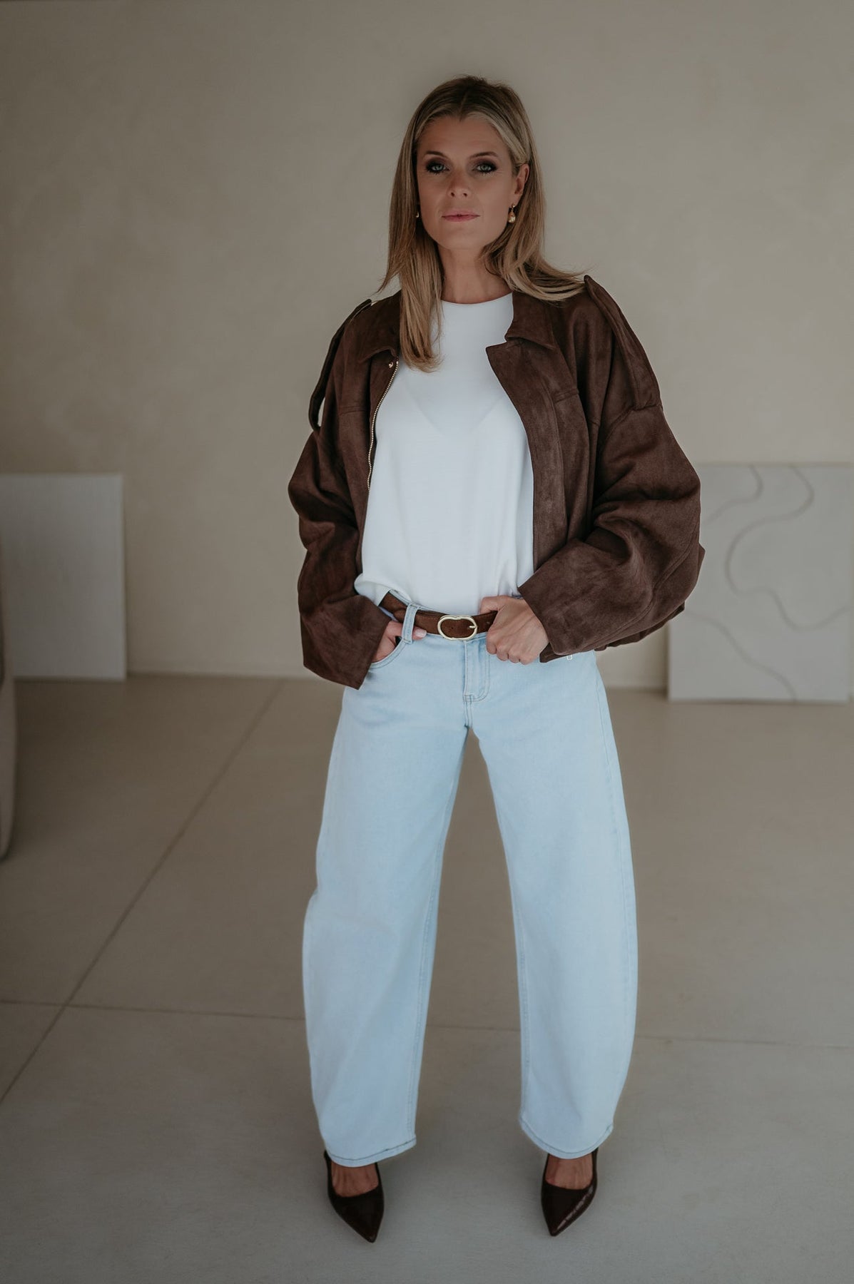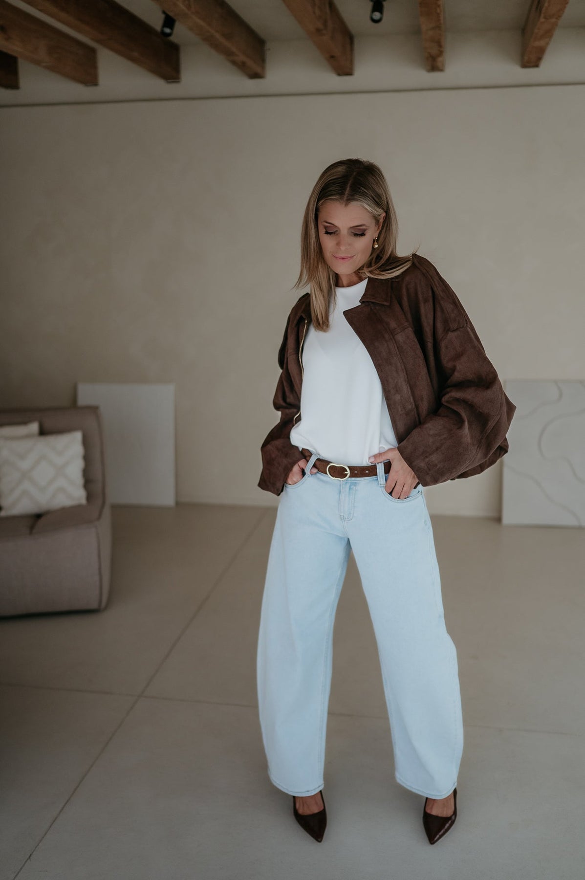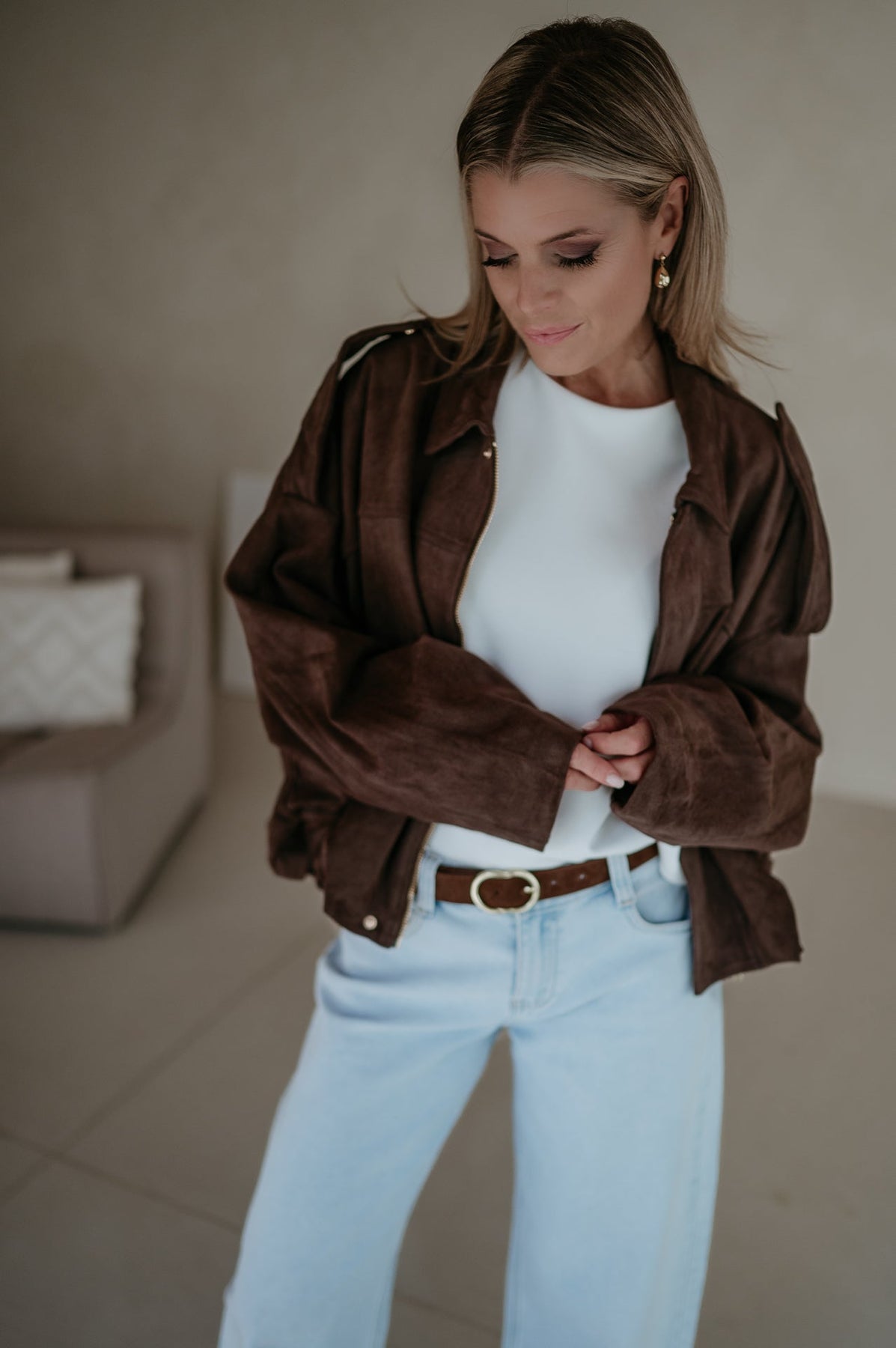 De zachte suède look geeft het jasje een luxe uitstraling, terwijl de chocolade bruine kleur zorgt voor een stoere, stijlvolle vibe.
