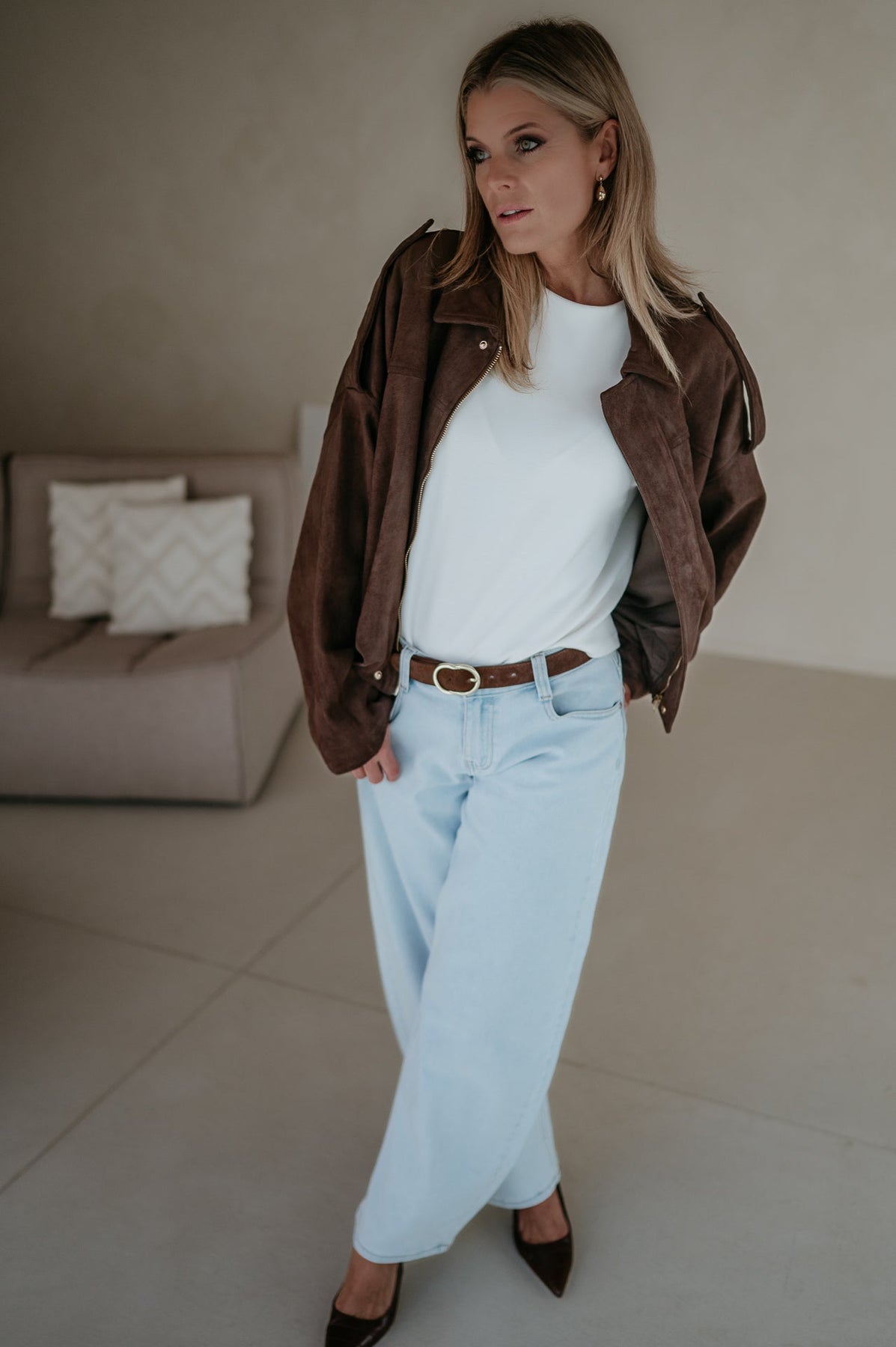 Prachtige chocolade bruine suède jasje, wij zijn er allemaal verliefd op.