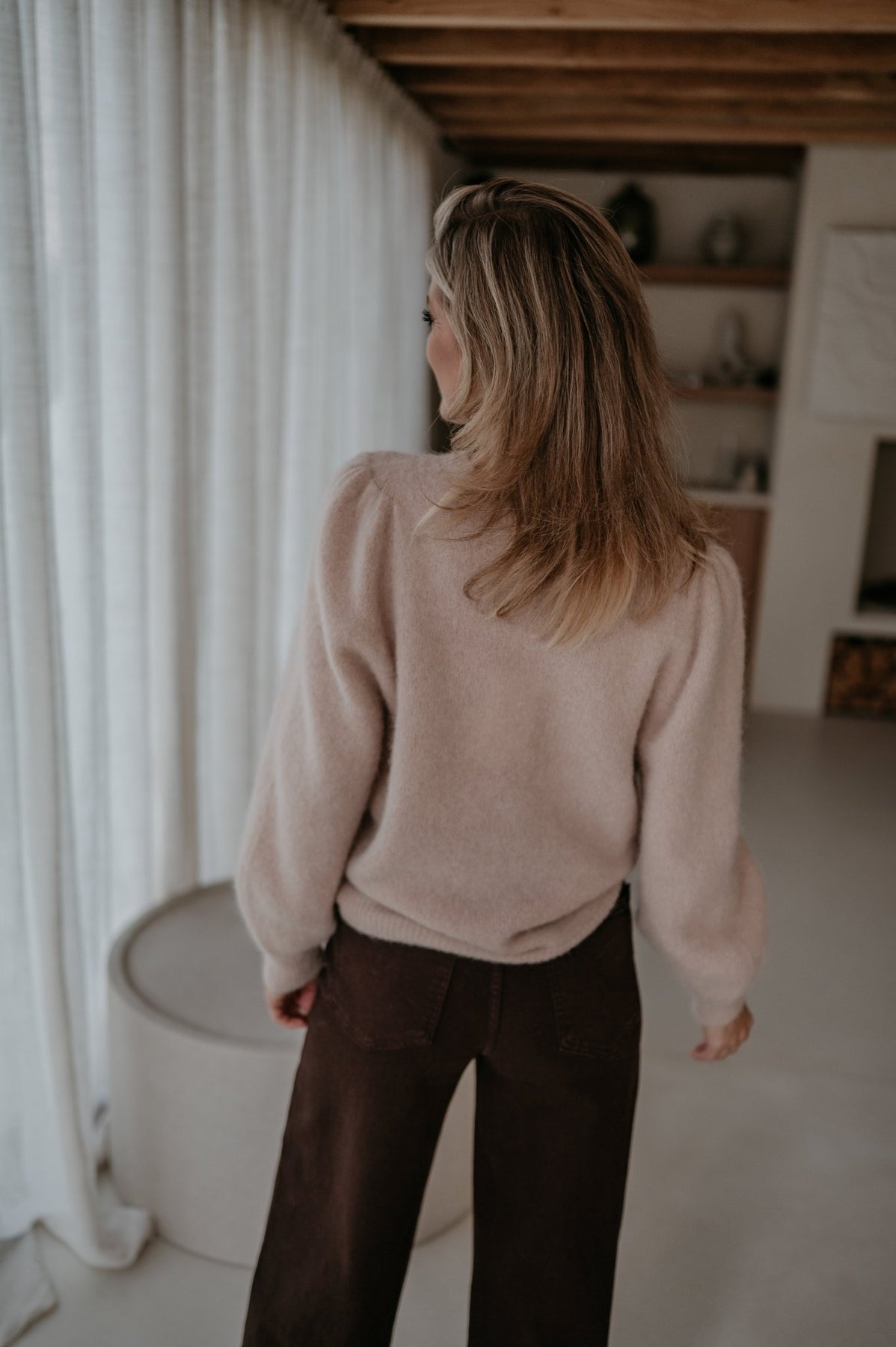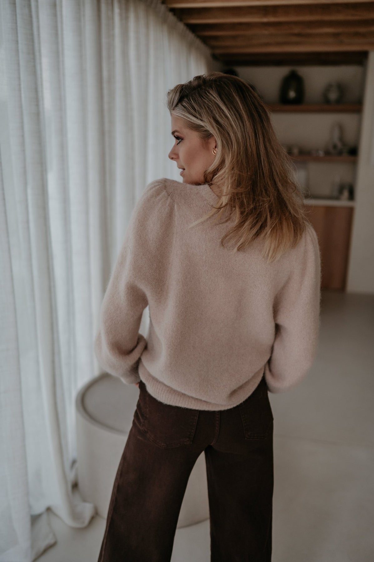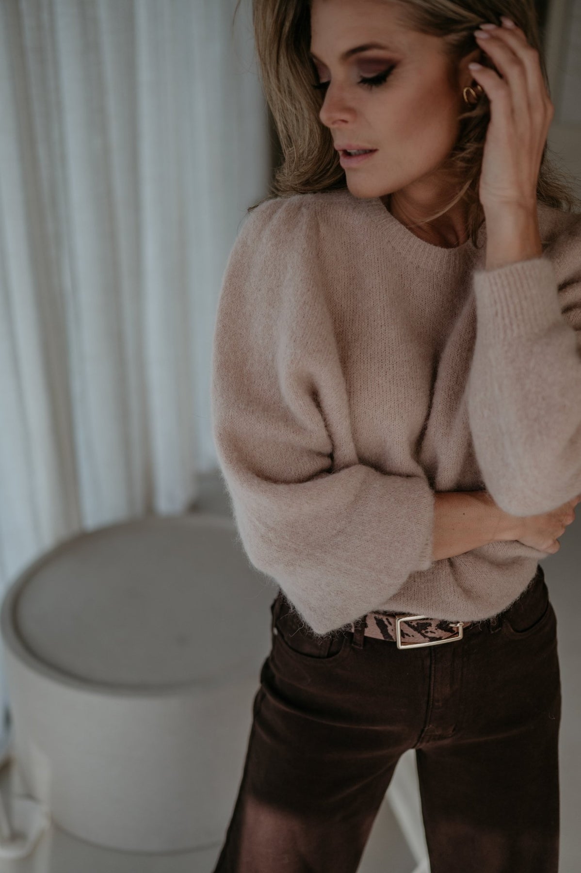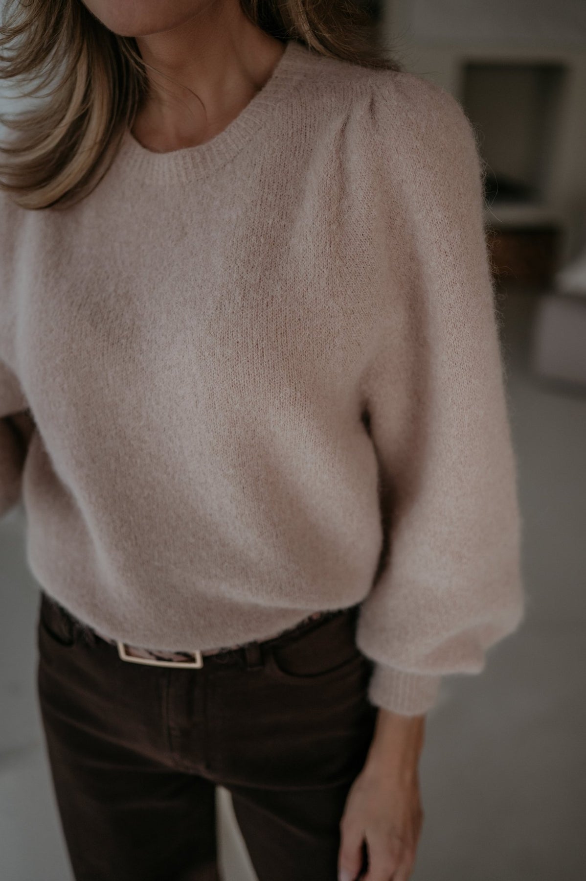 Prachtige knit met speelse pofmouwen die je look meteen een vrouwelijke touch geven.