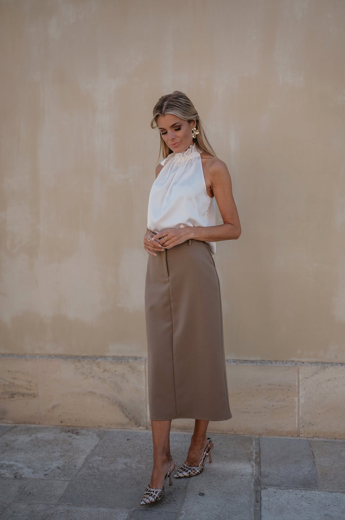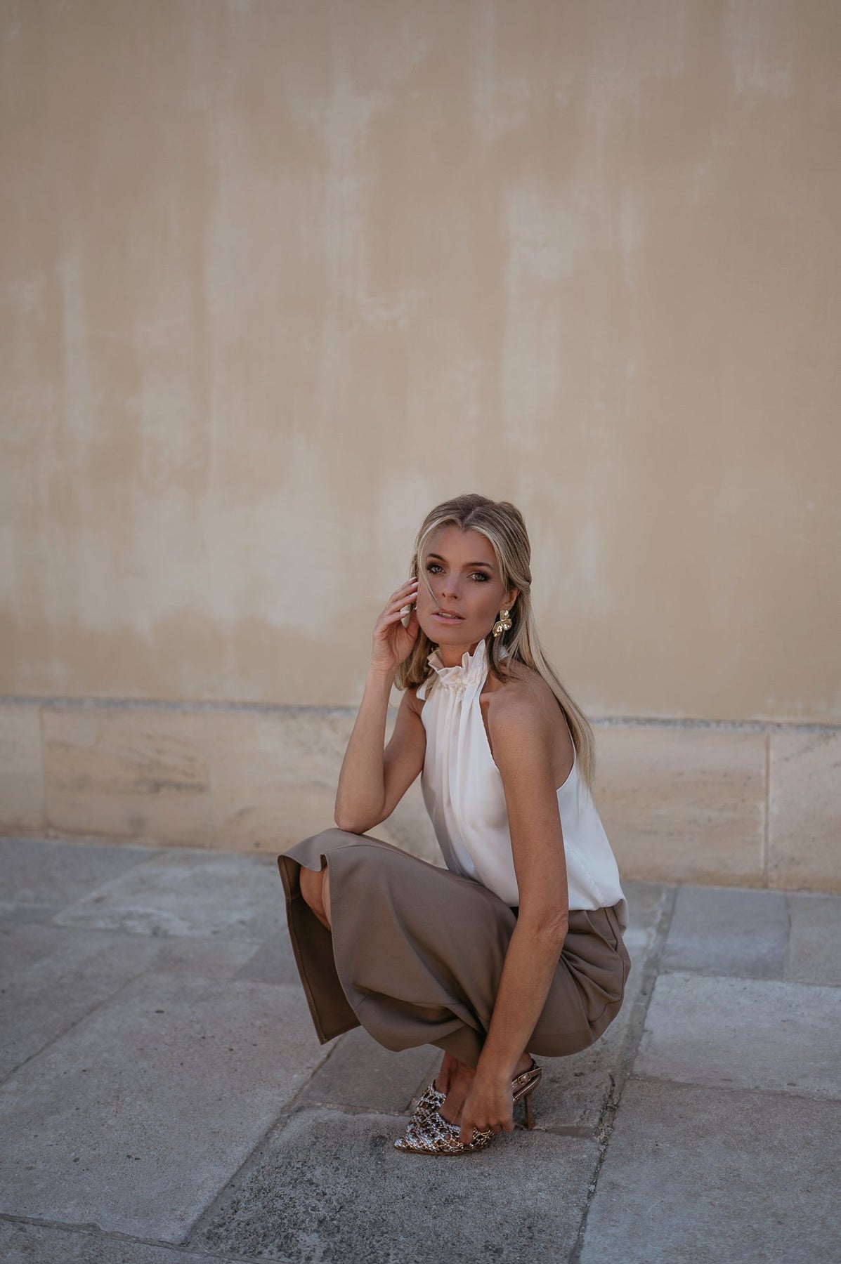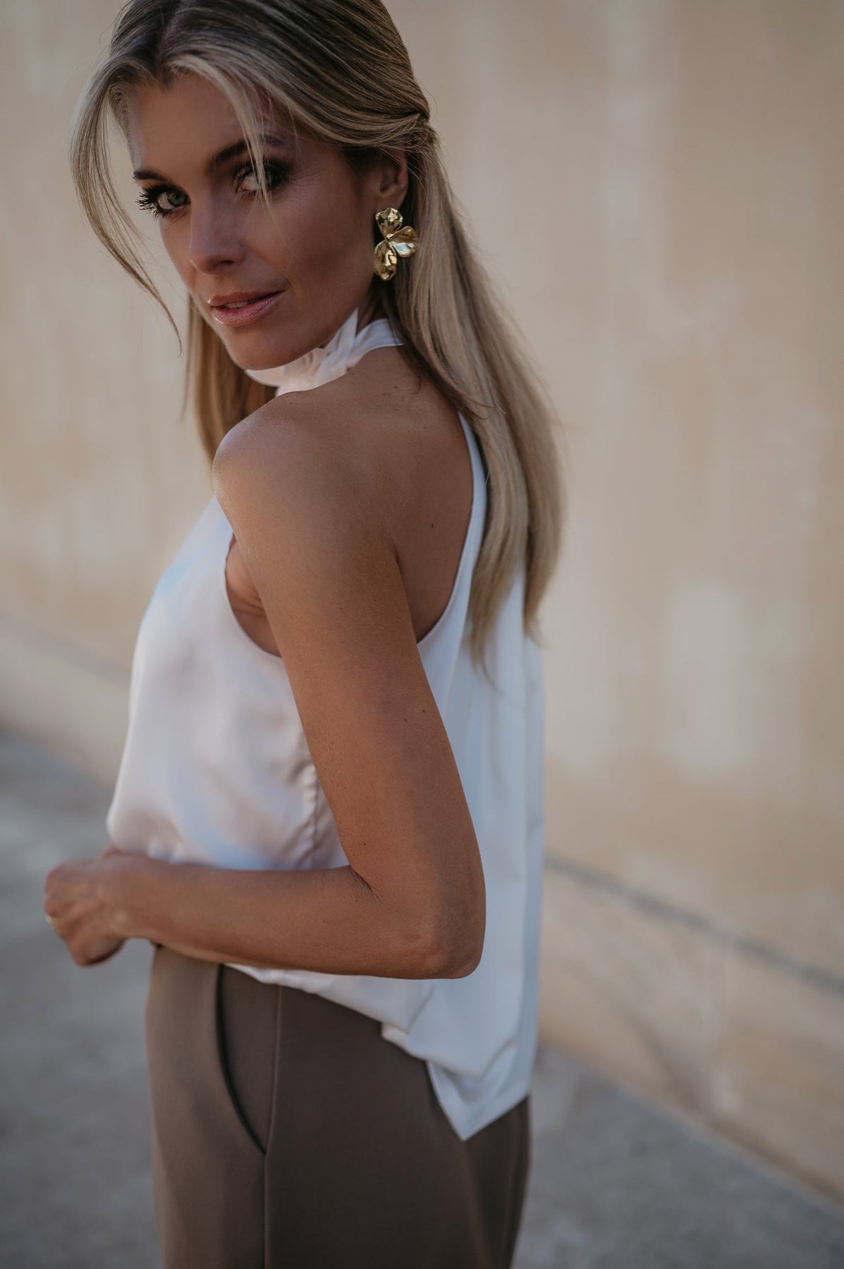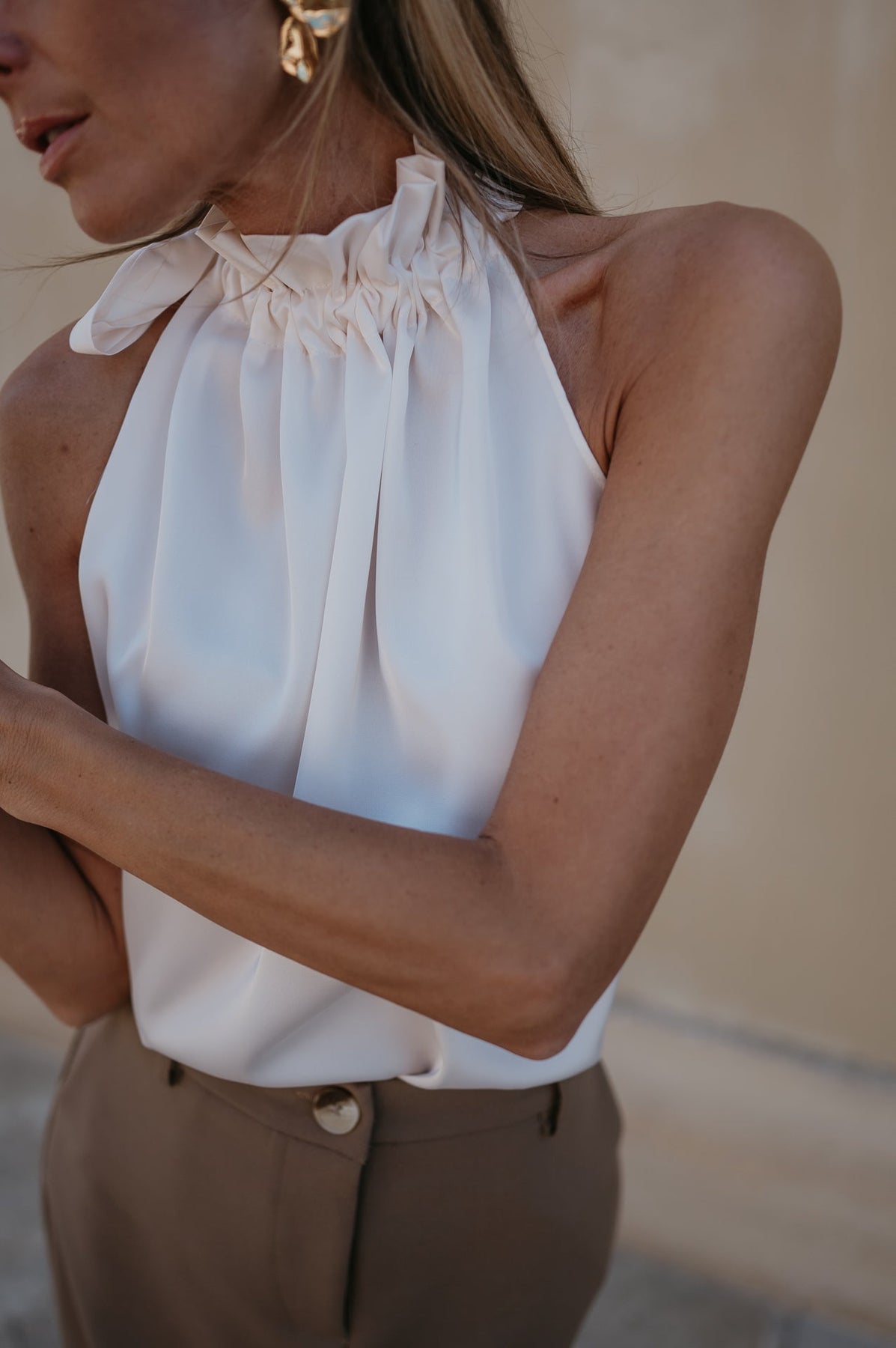 De glanzende satijnen stof zorgt voor een luxe gevoel, terwijl de strik rond de hals het bloesje een vrouwelijke en gedurfde touch geeft.