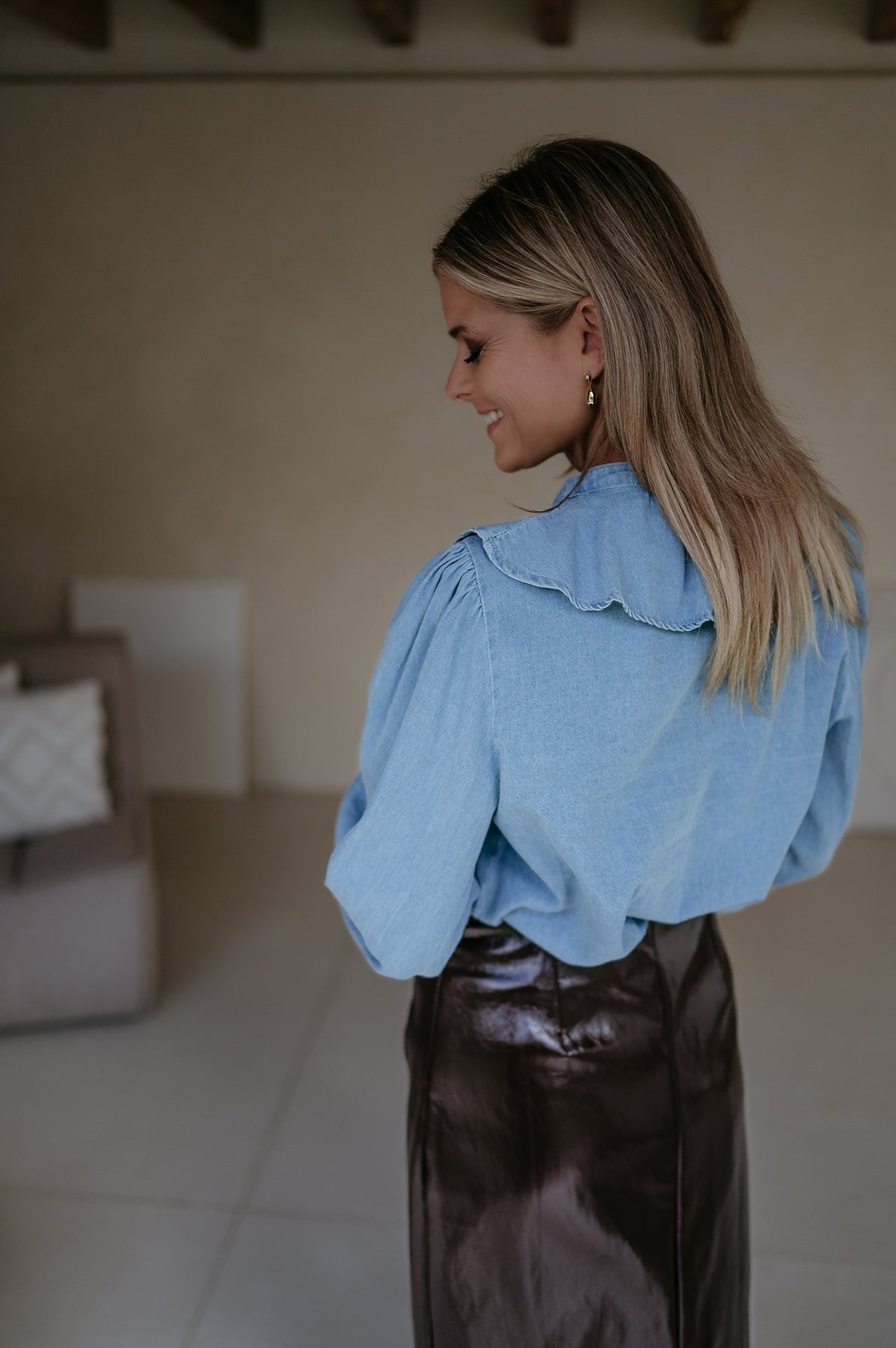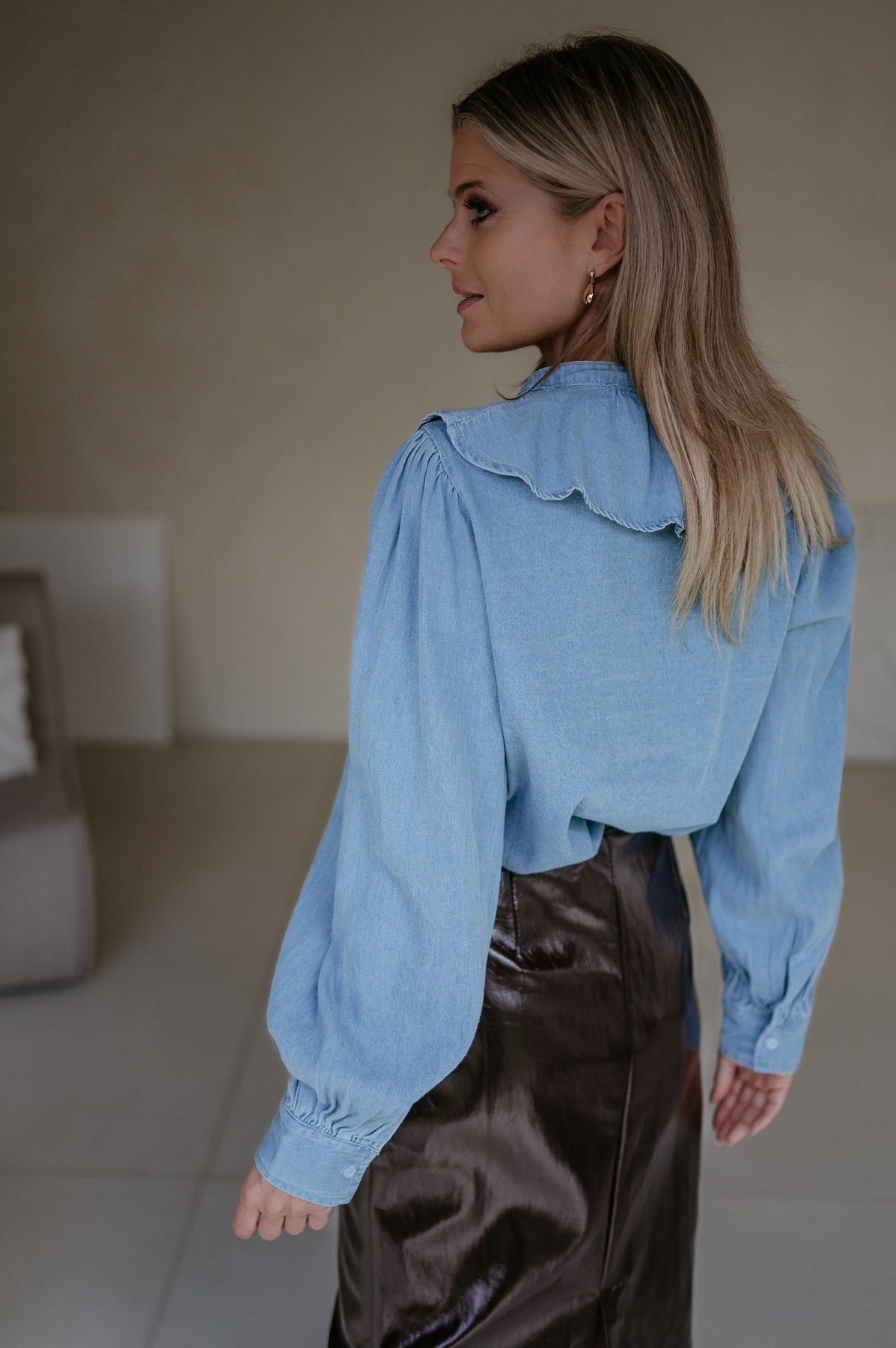 Blauwe blouse met leuke plooitjes en een v-hals, perfect te combineren met een shortje. Het zachte stofje en de subtiele details maken het een stijlvolle keuze voor warme dagen. Een frisse en vrouwelijke look die altijd goed staat.
