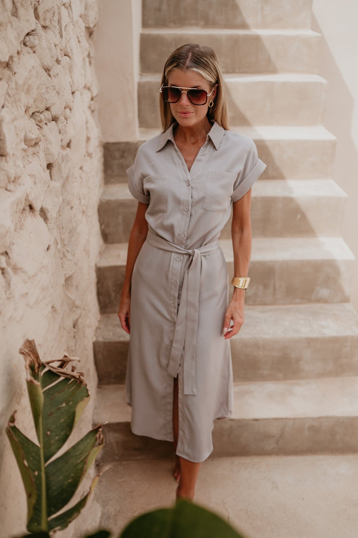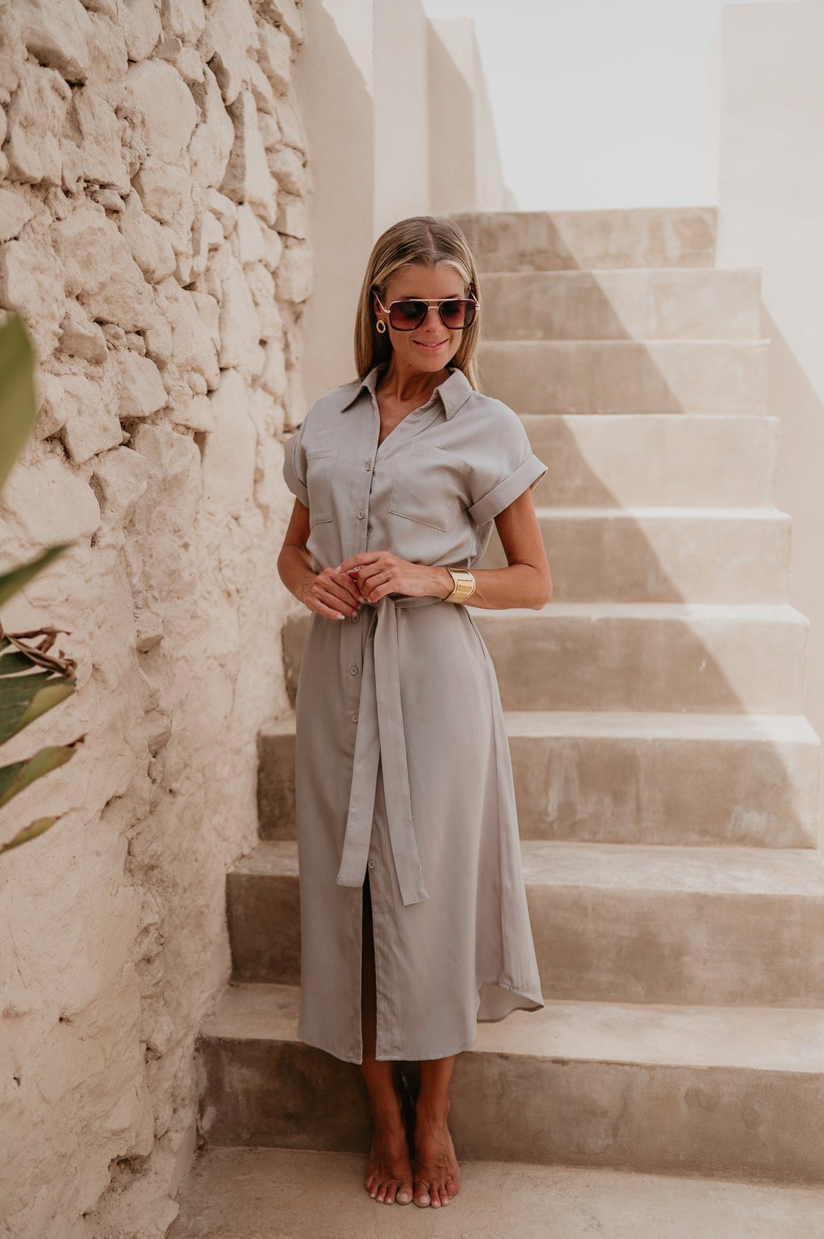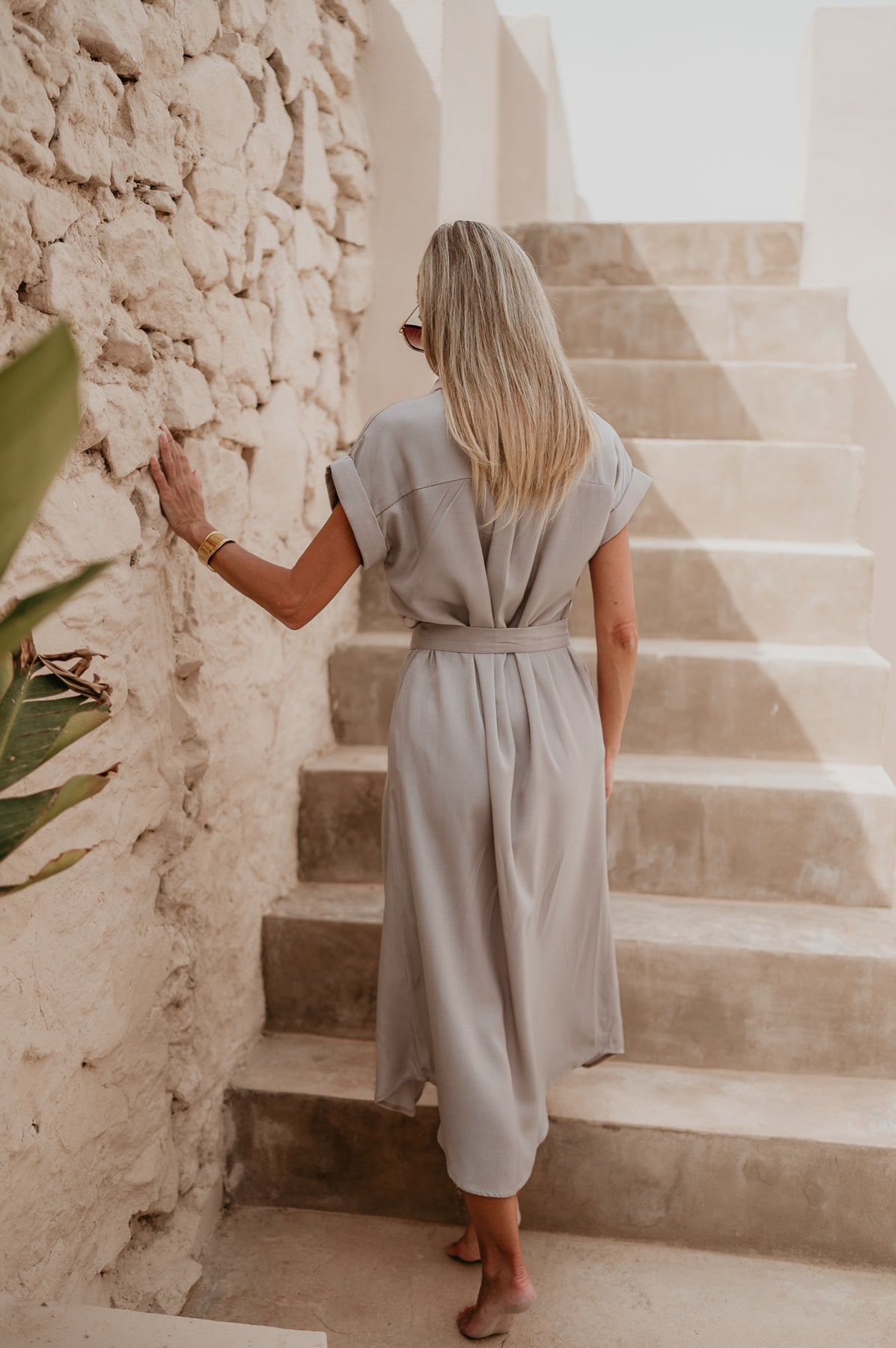 Deze lange jurk straalt elegantie uit dankzij de mooie V-hals en de knoopjes vooraan.