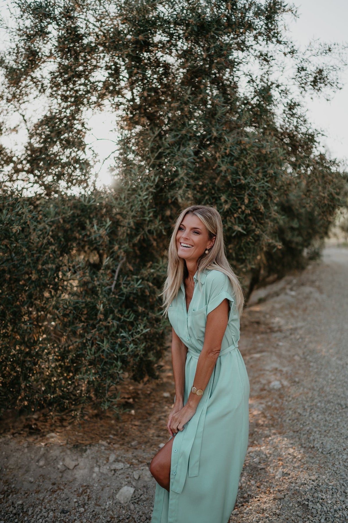 Deze lange jurk straalt elegantie uit dankzij de mooie V-hals en de knoopjes vooraan.