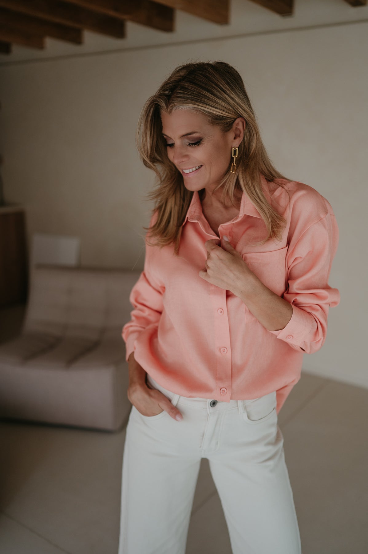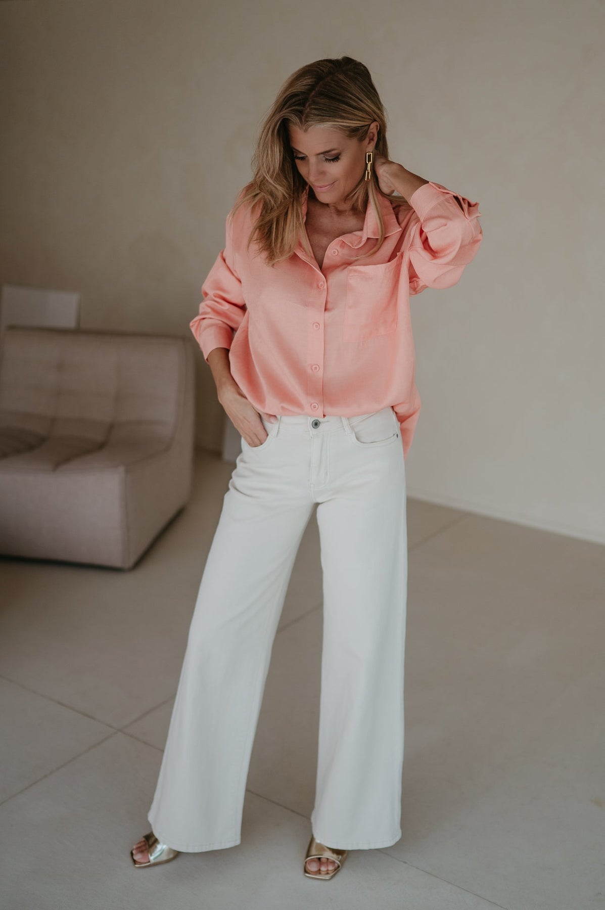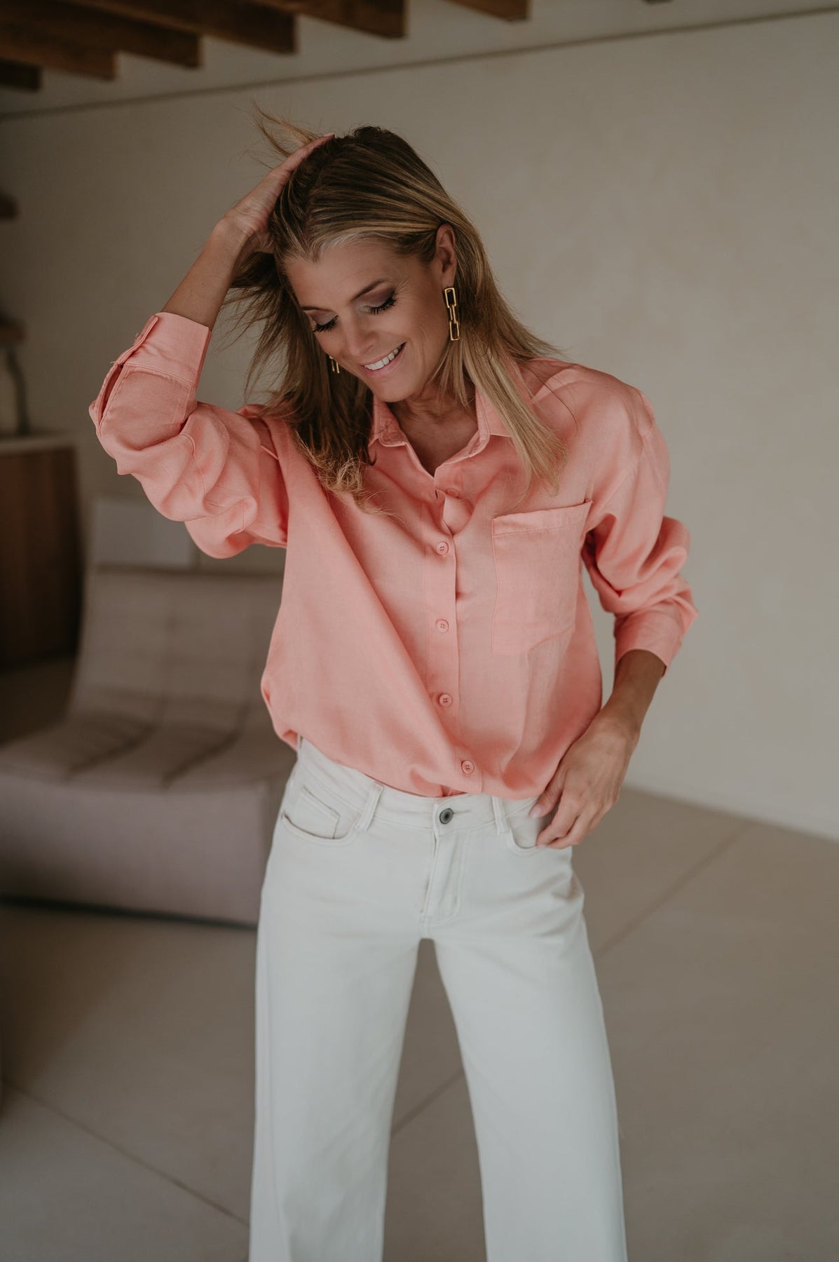 Je kan het hemdje ook los dragen met een wit topje eronder voor een relaxte look.
