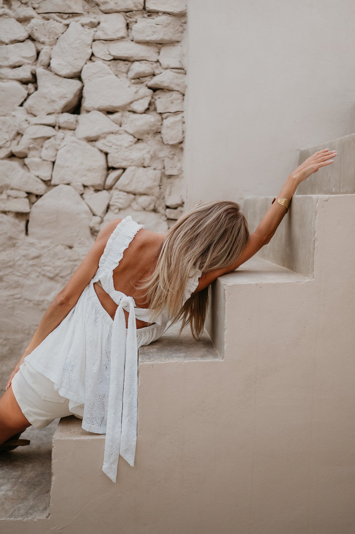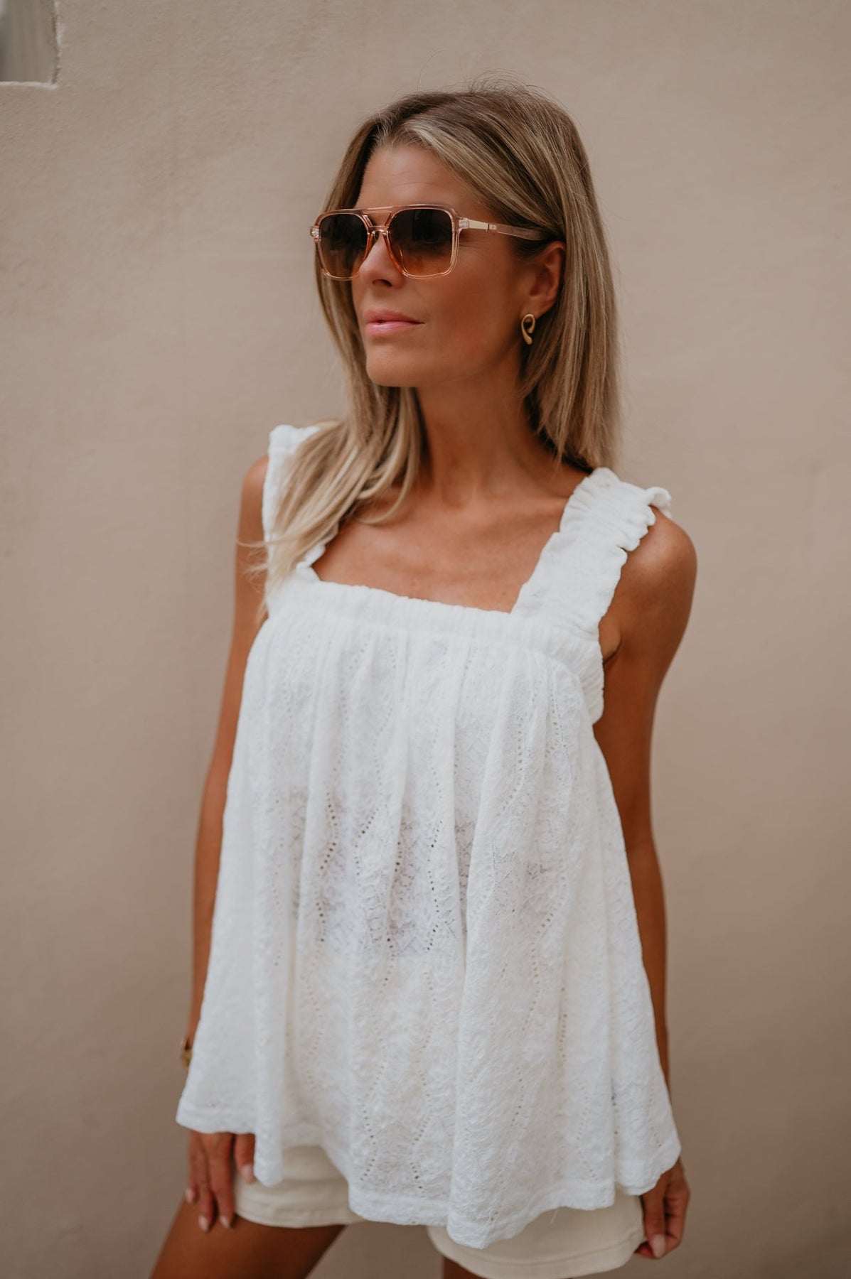 Een prachtig wit kanten blousje dat pure elegantie uitstraalt.