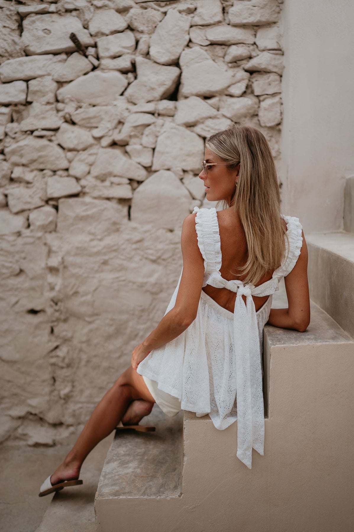 De open rug met een fijne strik maakt het extra bijzonder en vrouwelijk.