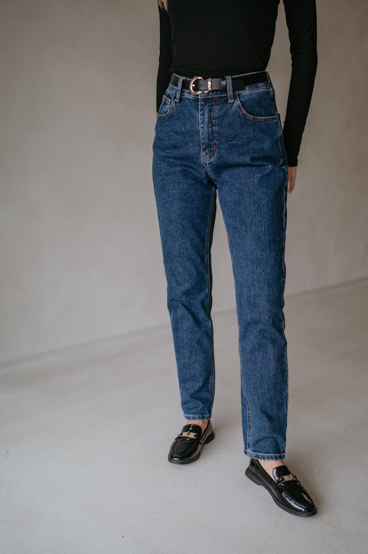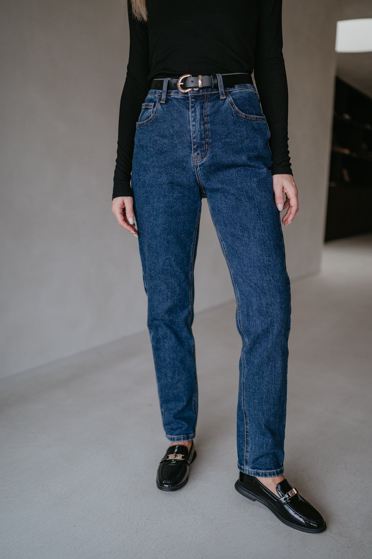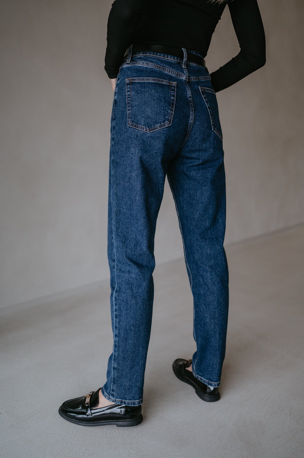De jeans komt iets hoger in de taille en is afgewerkt langs onder.