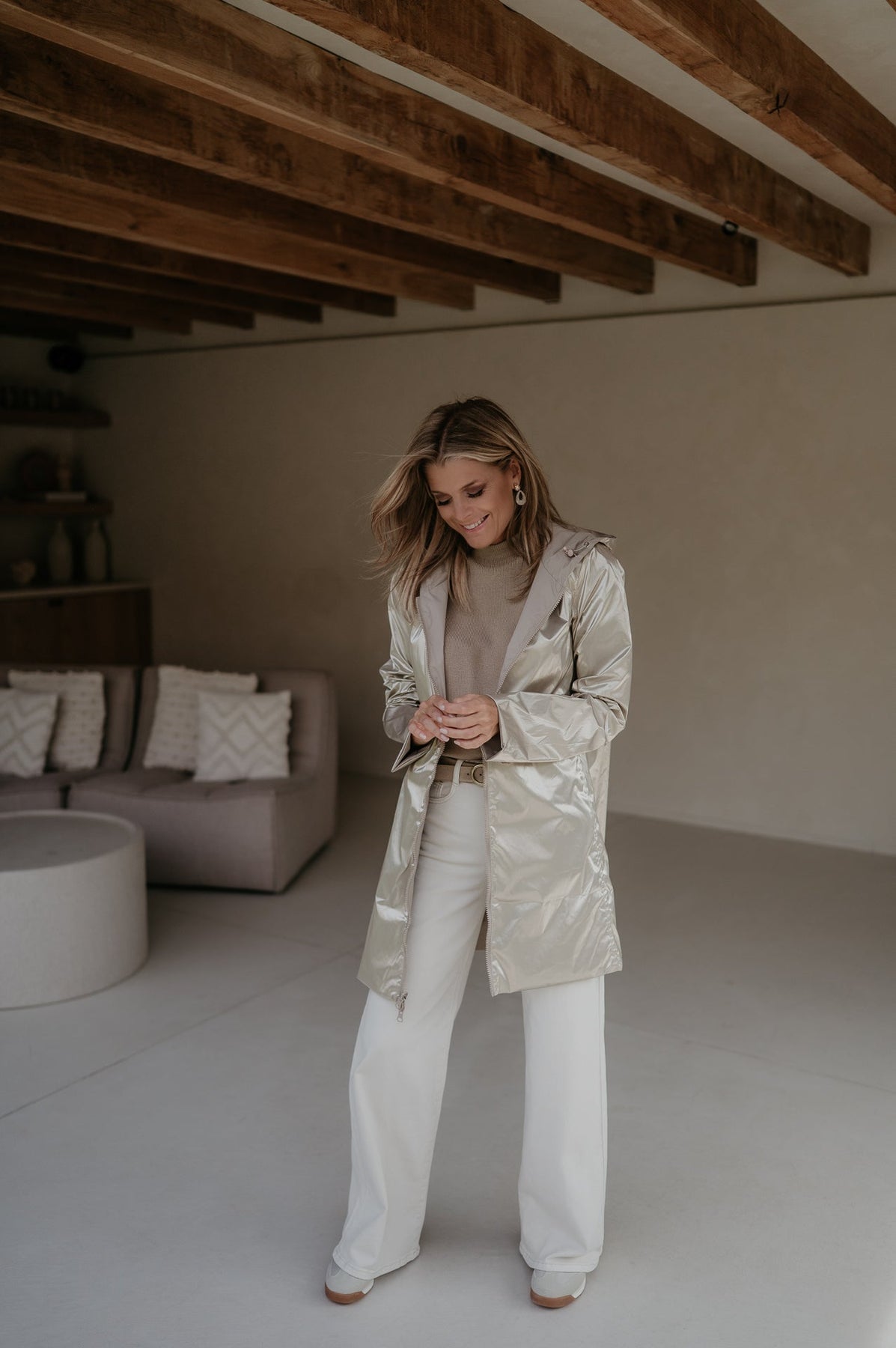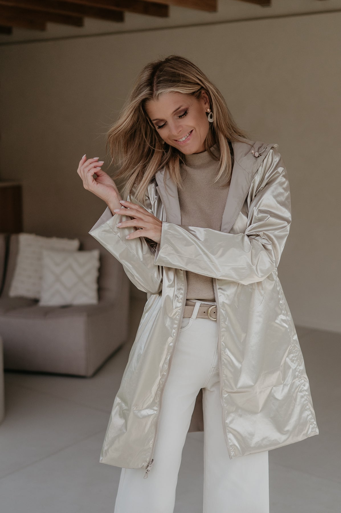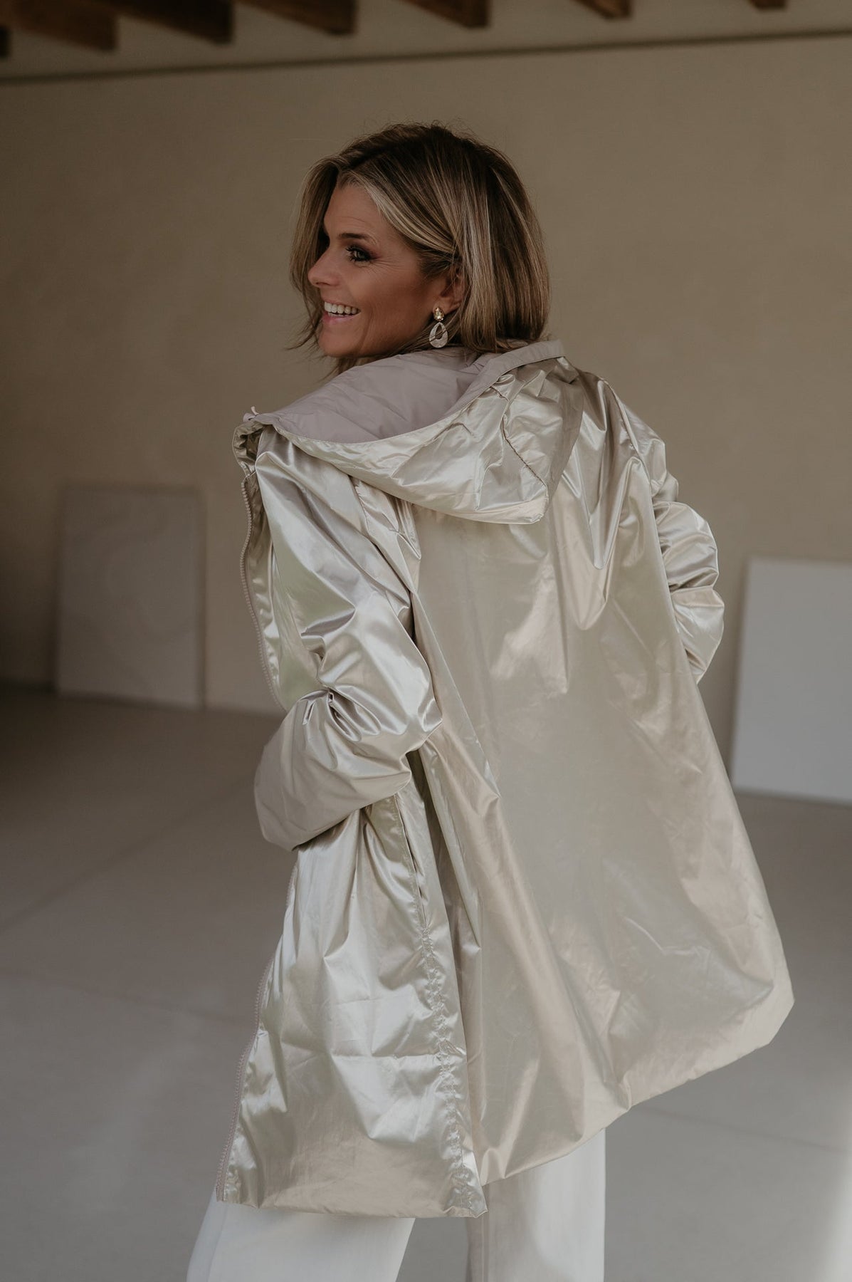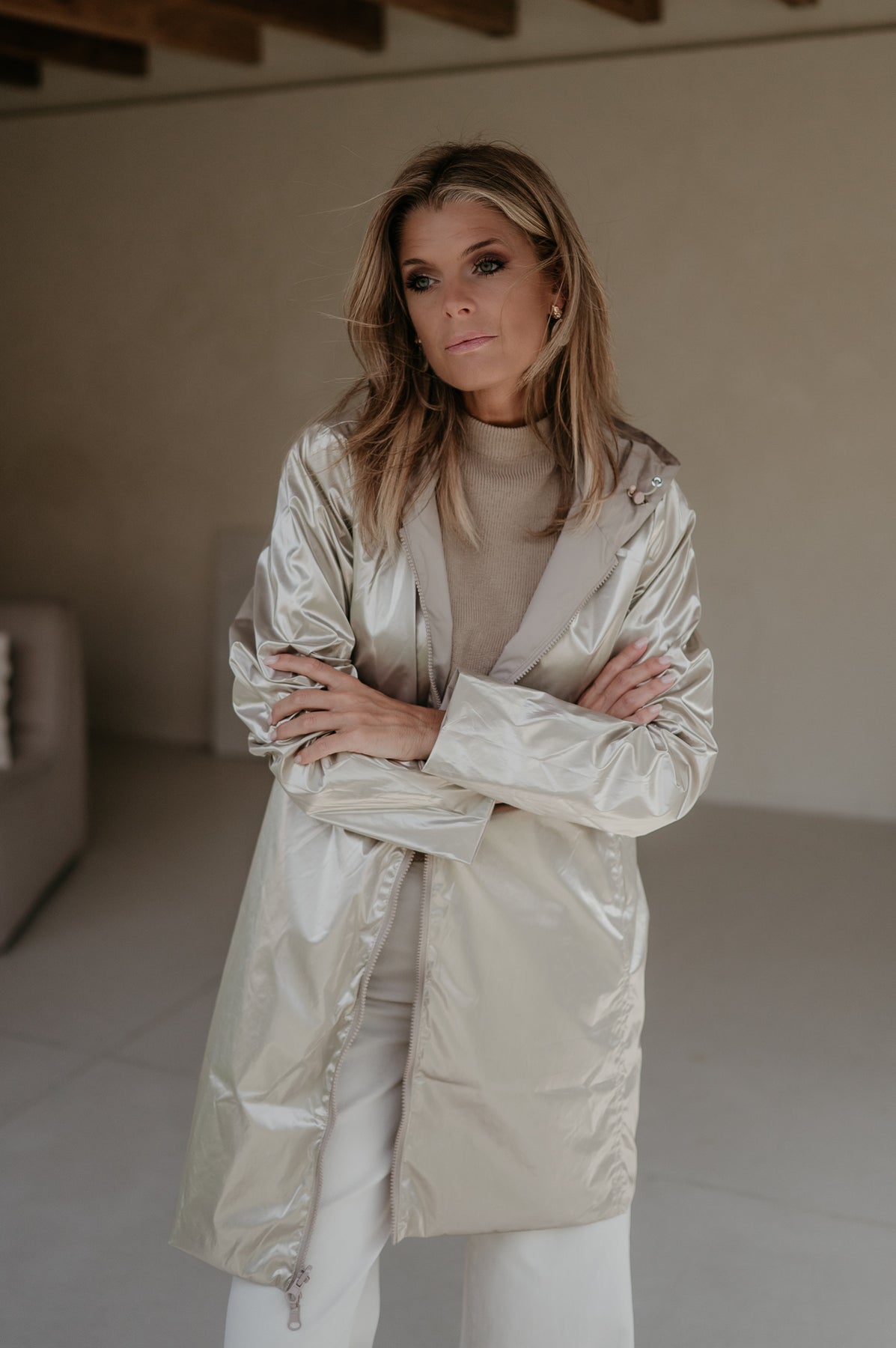 Deze jas is omkeerbaar waardoor hij een beige of een gouden look heeft.