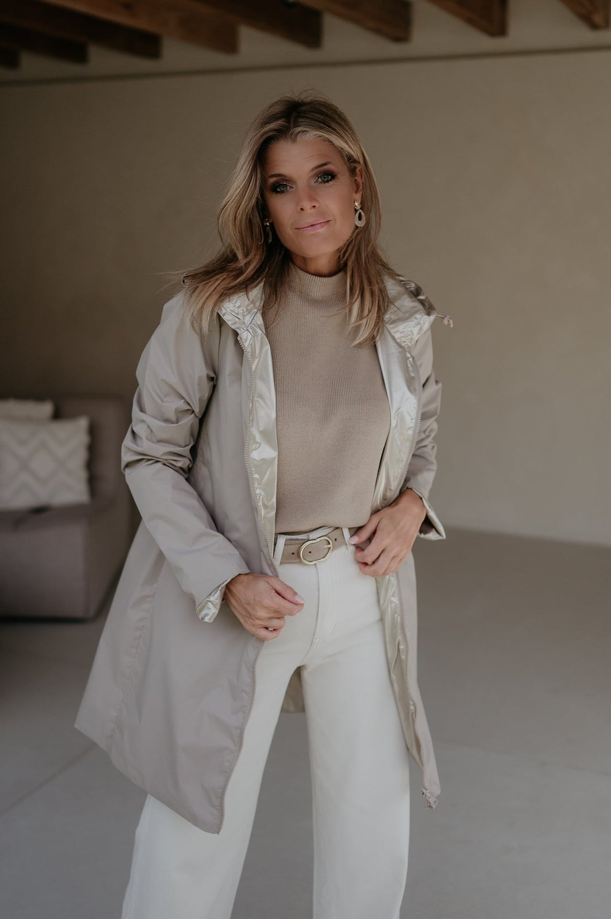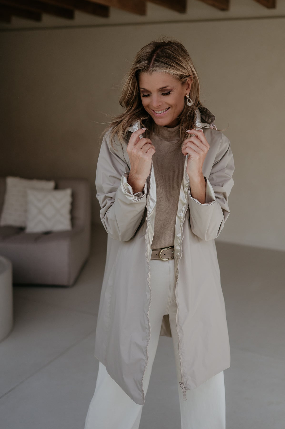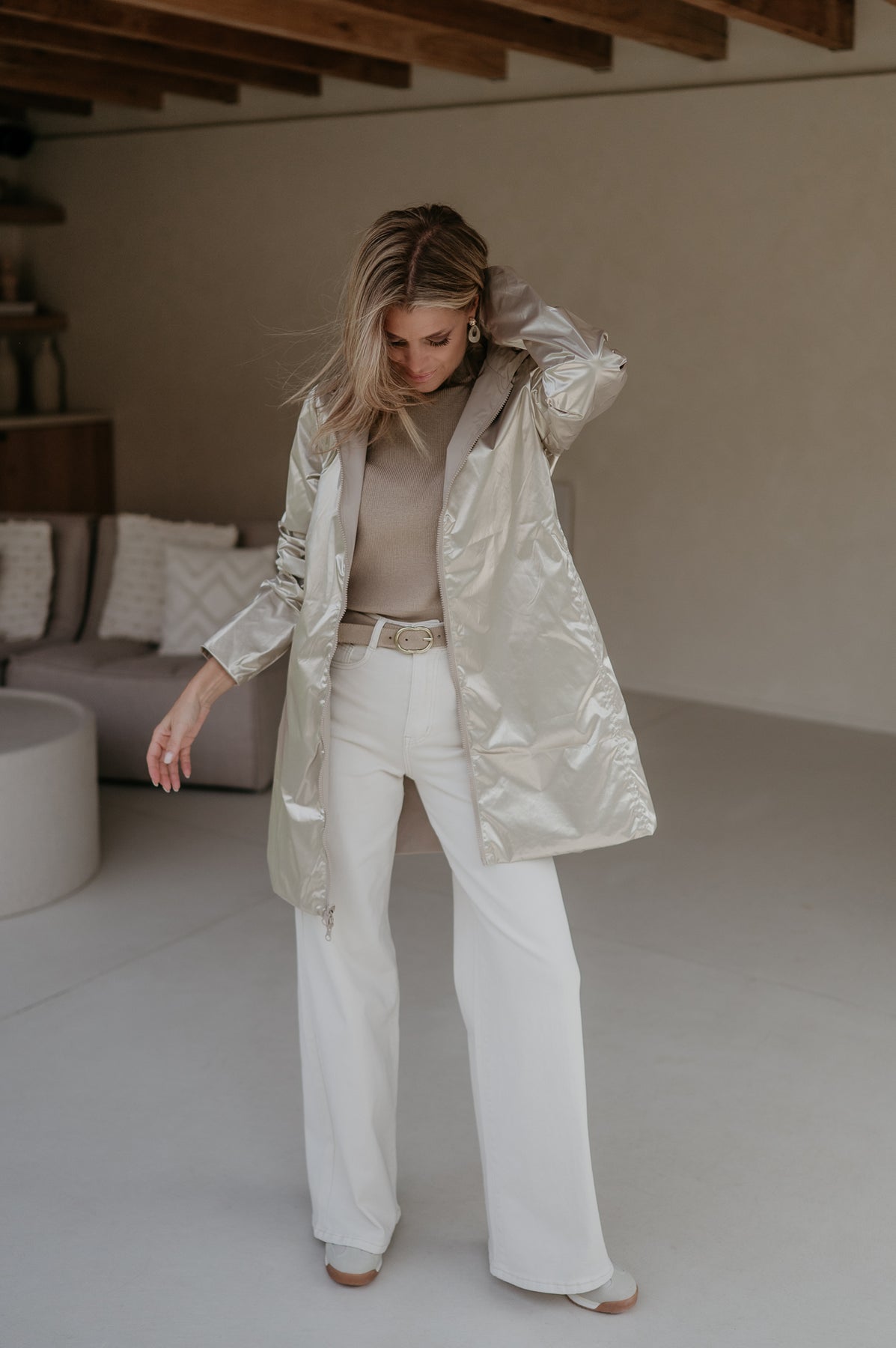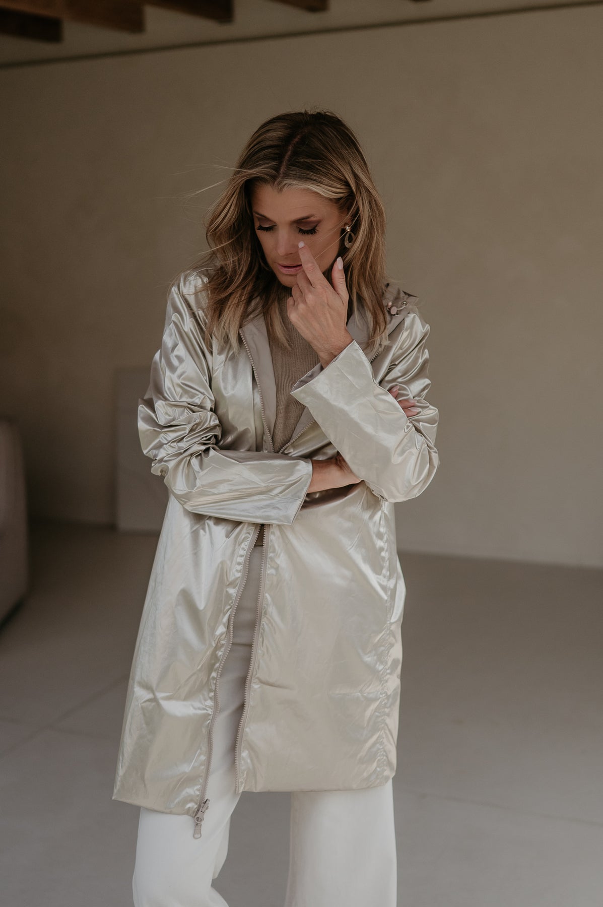 Deze jas is omkeerbaar waardoor hij een beige of een gouden look heeft.