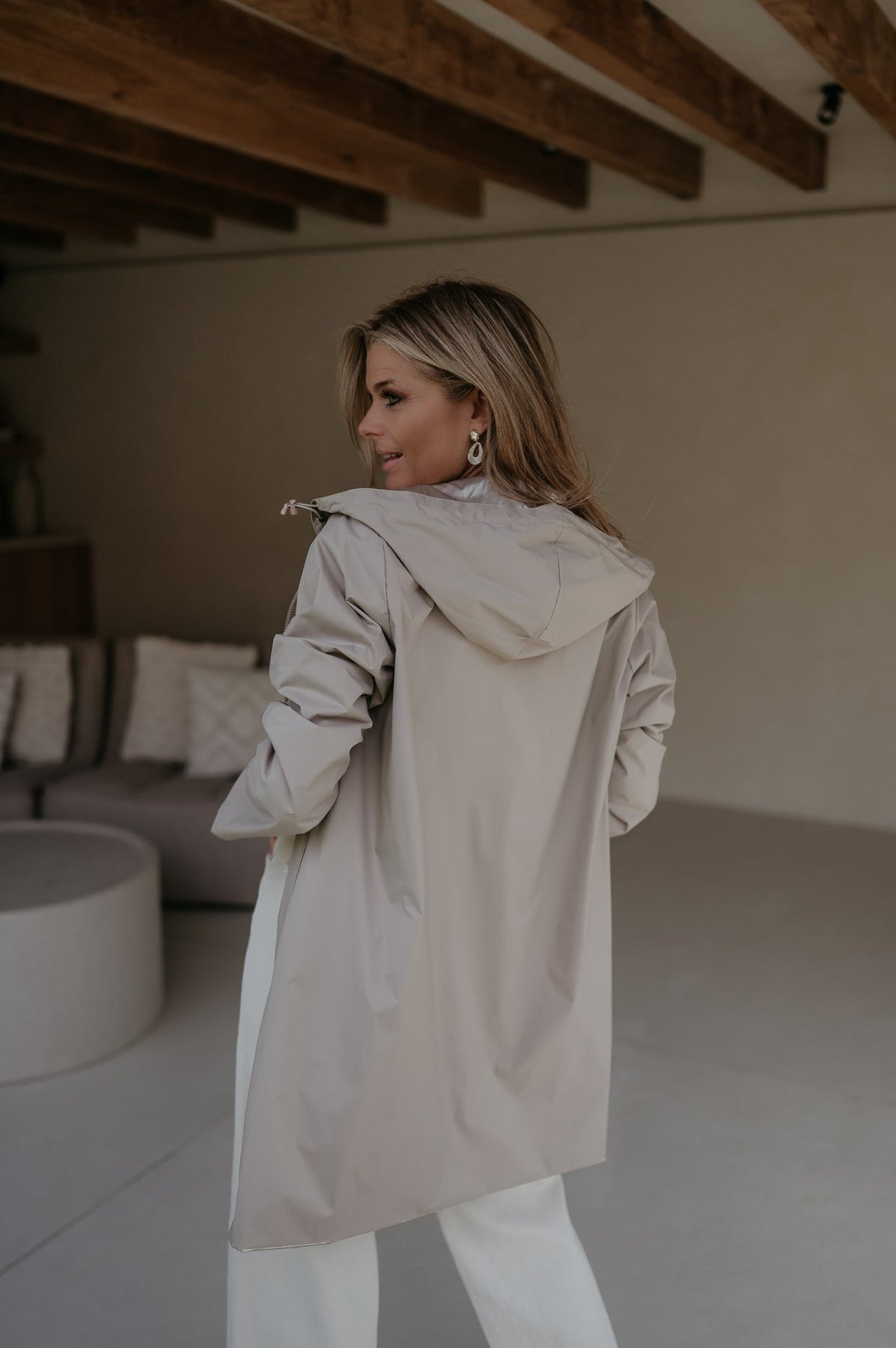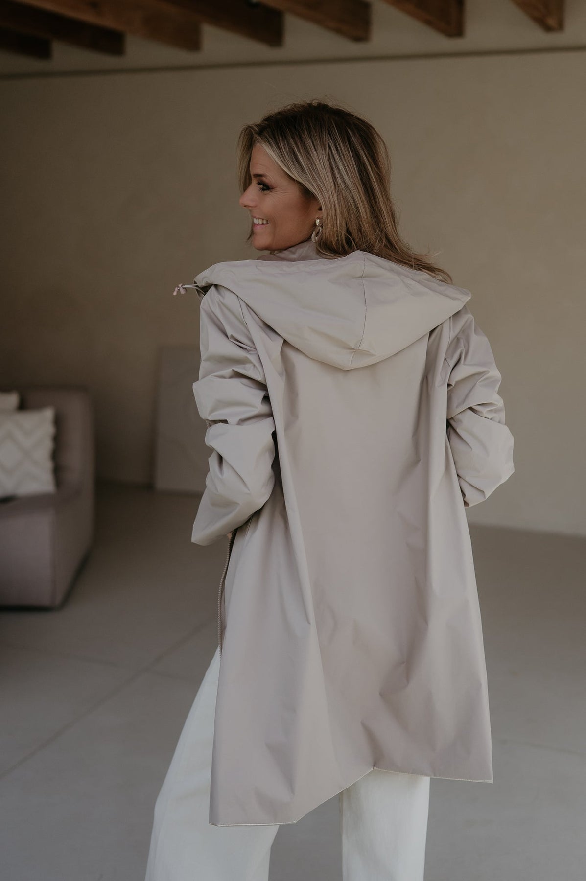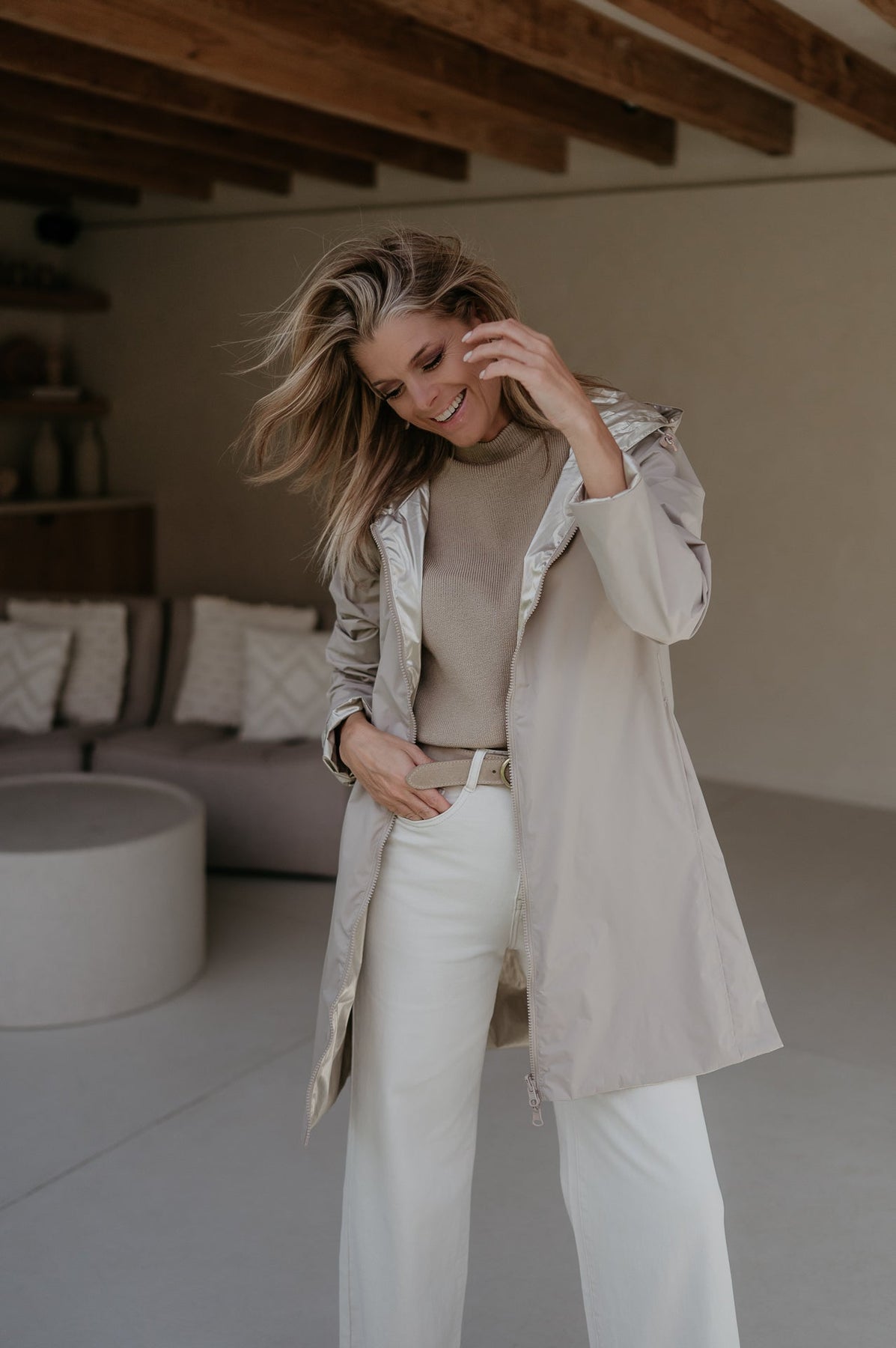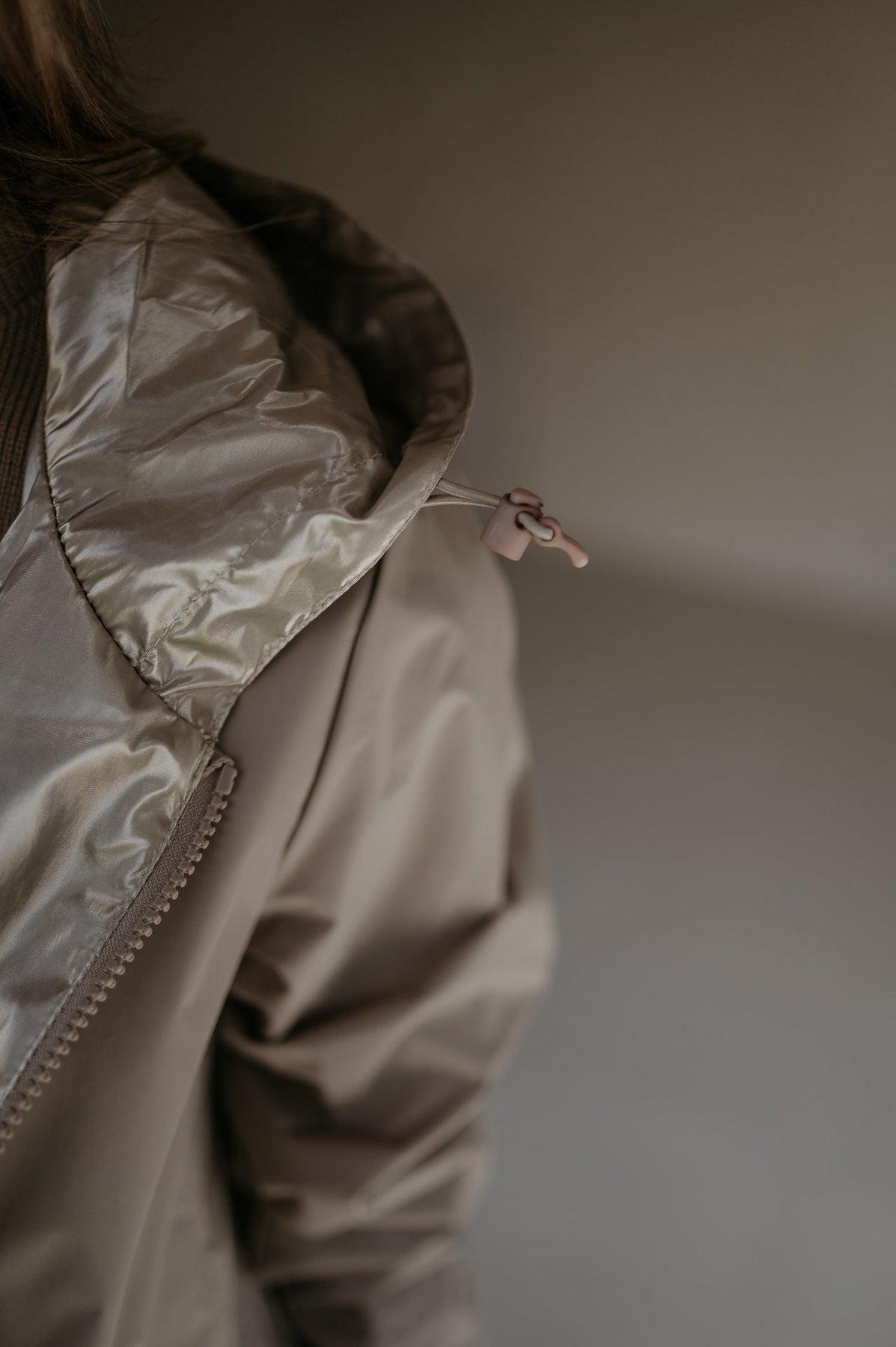 Deze jas is omkeerbaar waardoor hij een beige of een gouden look heeft.