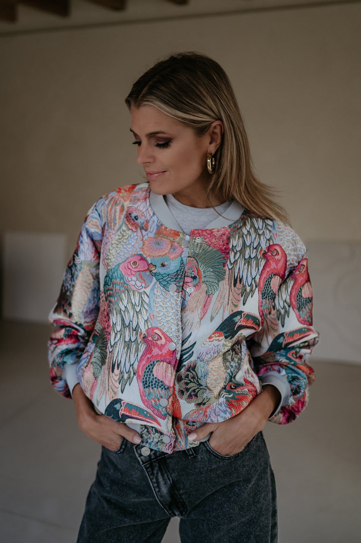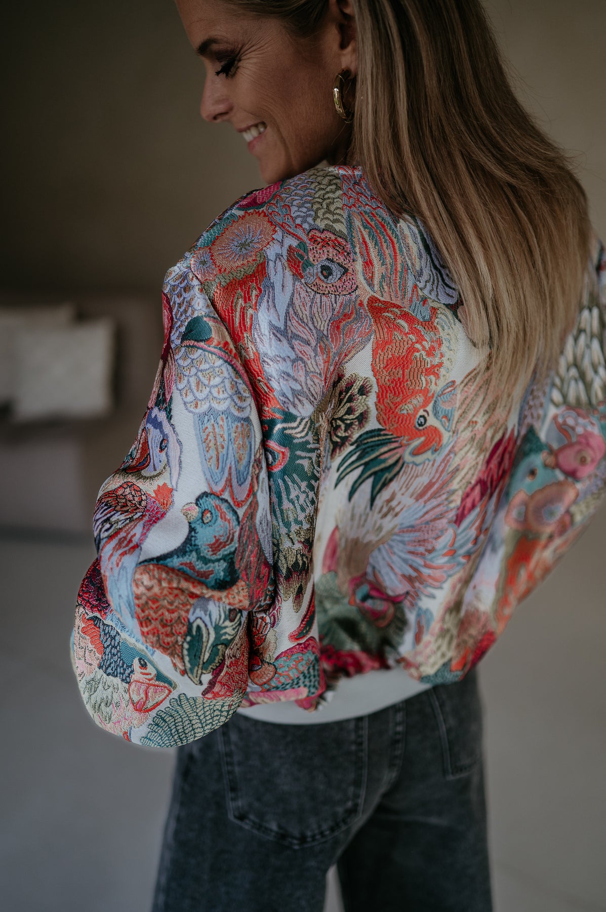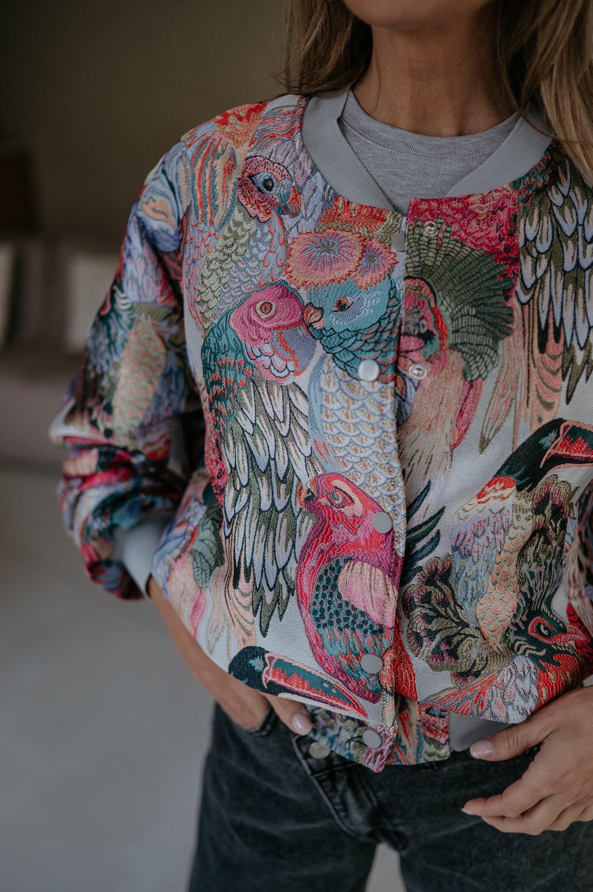 Dit prachtige jasje met kleurrijke papegaaien is een echte eyecatcher.