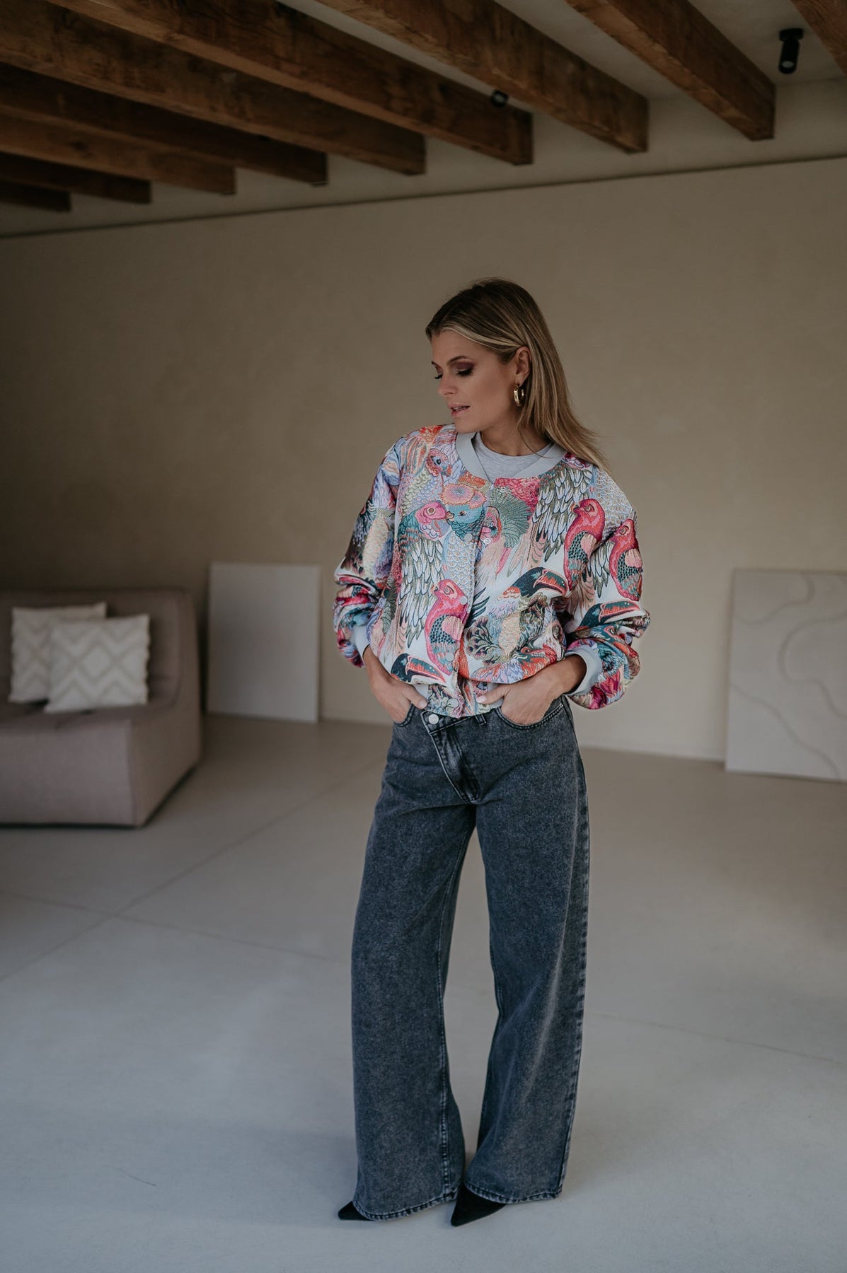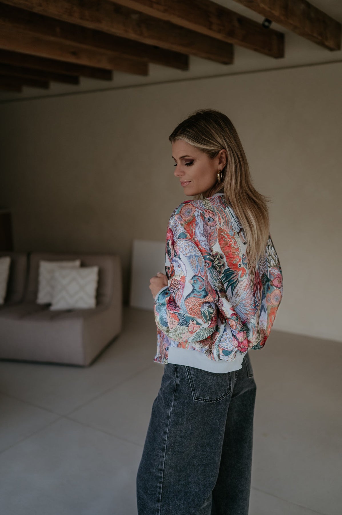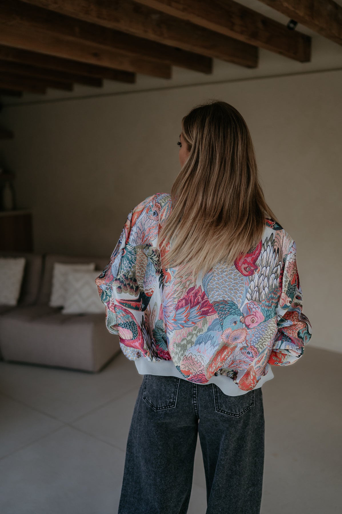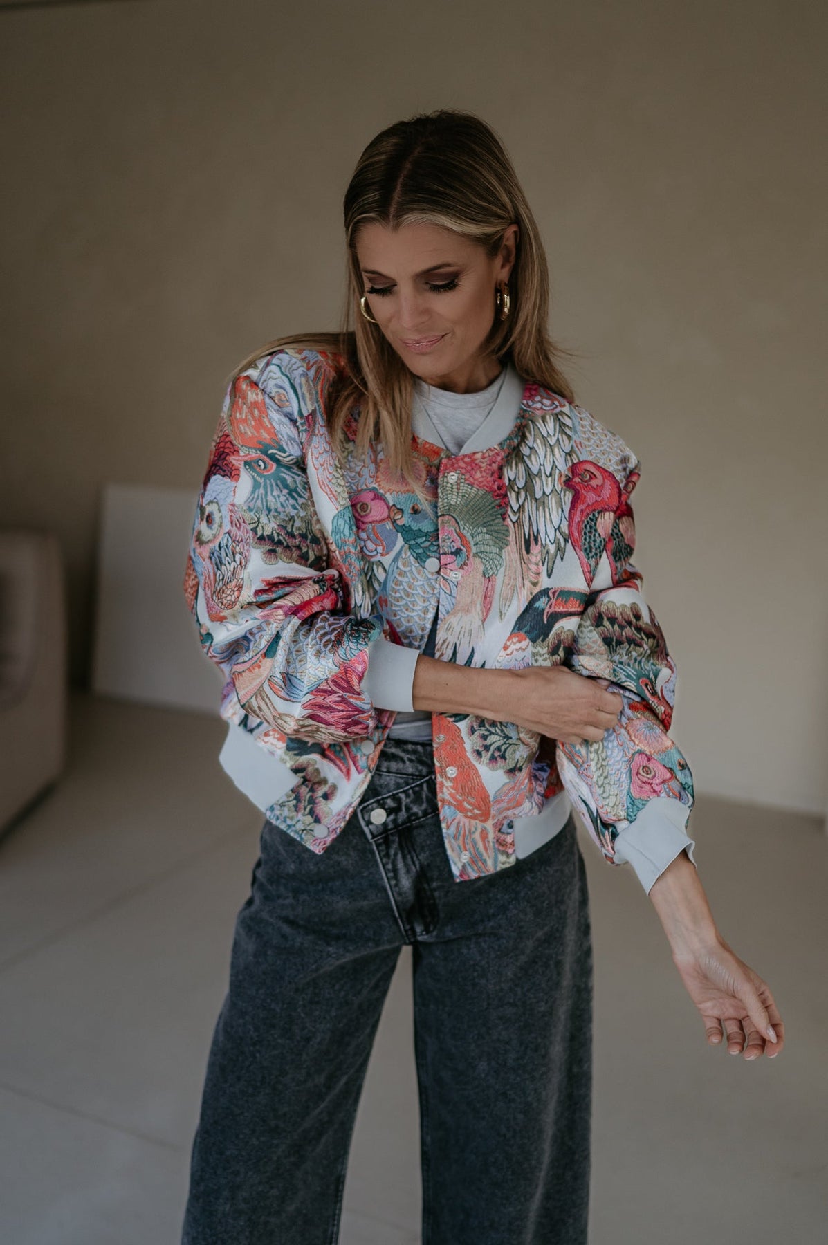Dit prachtige jasje met kleurrijke papegaaien is een echte eyecatcher.
