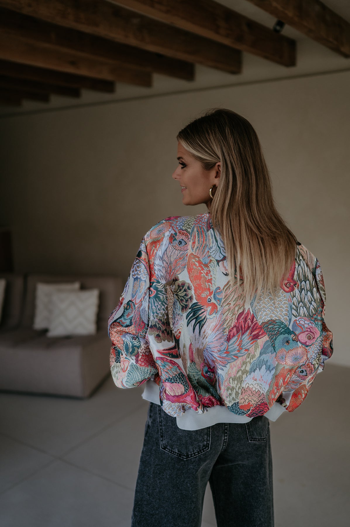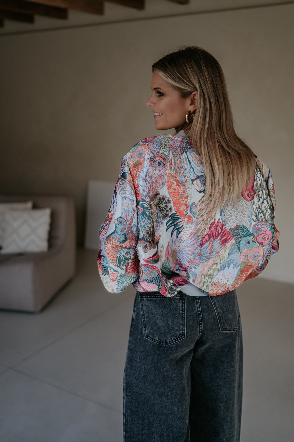 Het levendige dessin geeft een speelse en exotische twist aan je outfit, terwijl het jasje zelf stijlvol en veelzijdig blijft.