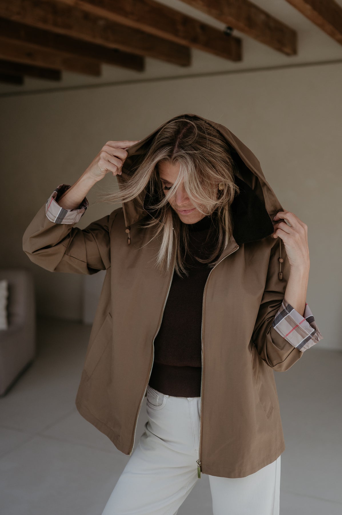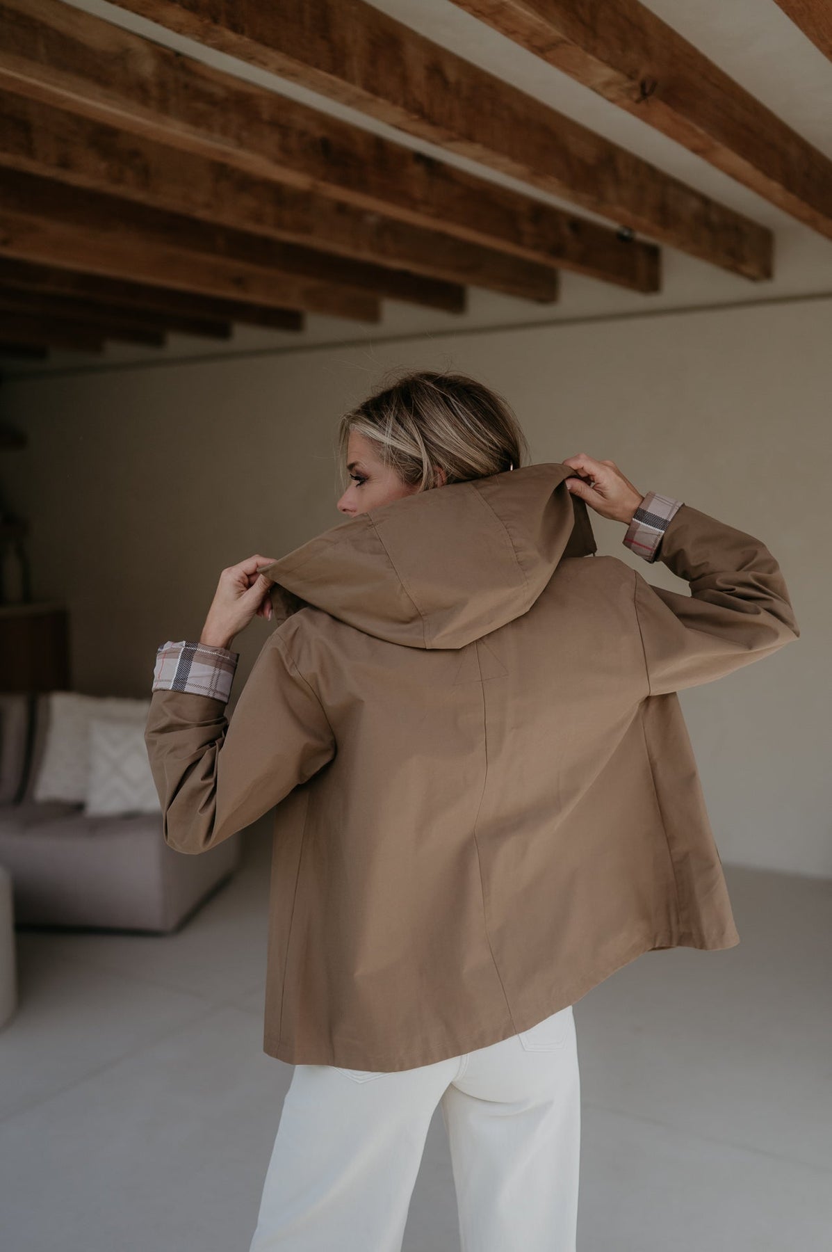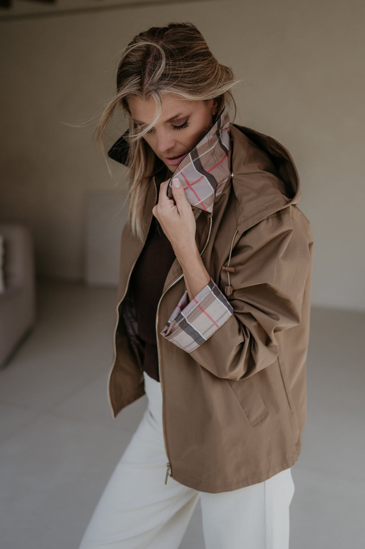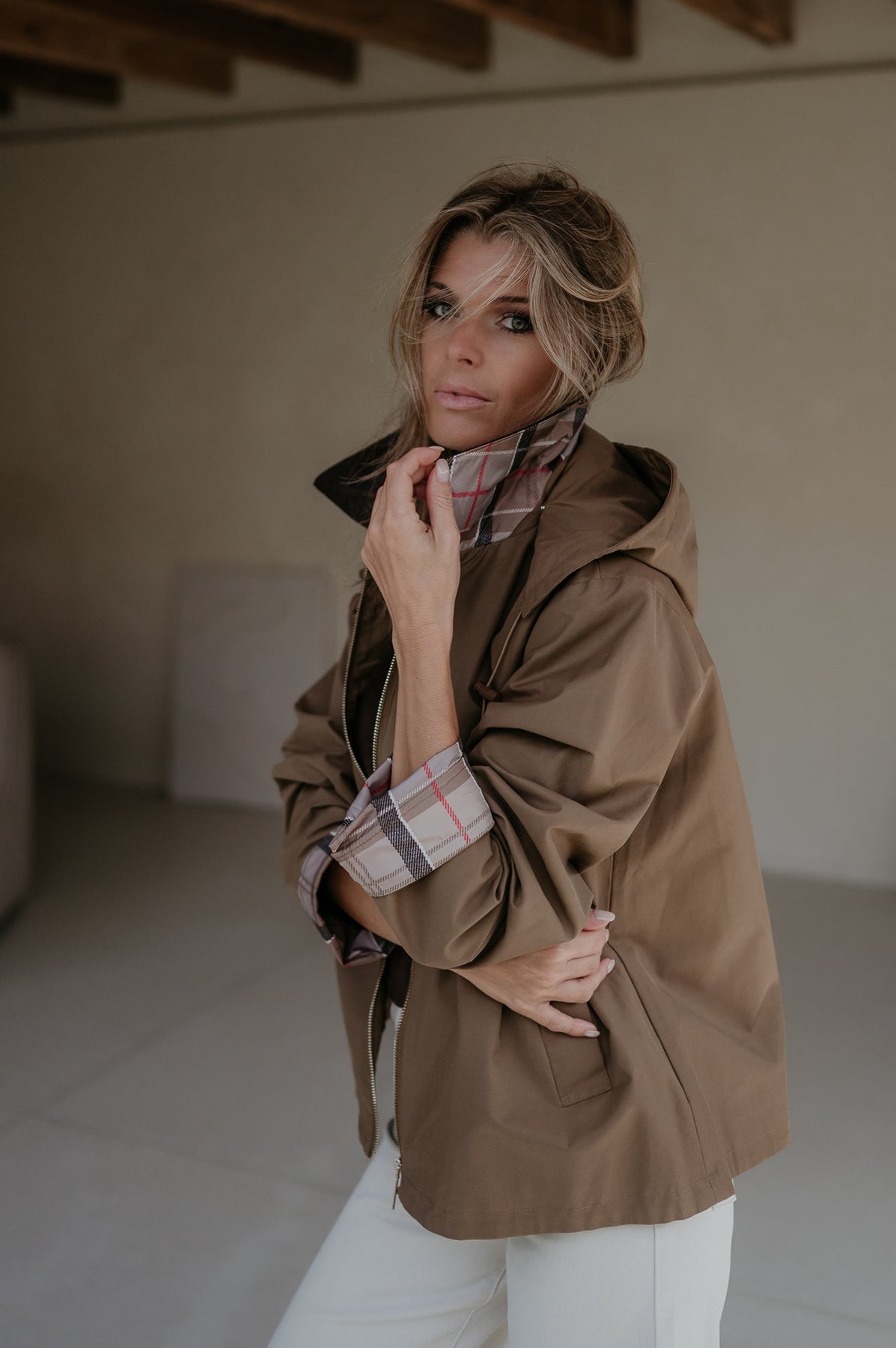Deze camel kleurige korte regenjas met chocolade bruine details is zowel elegant als handig.
