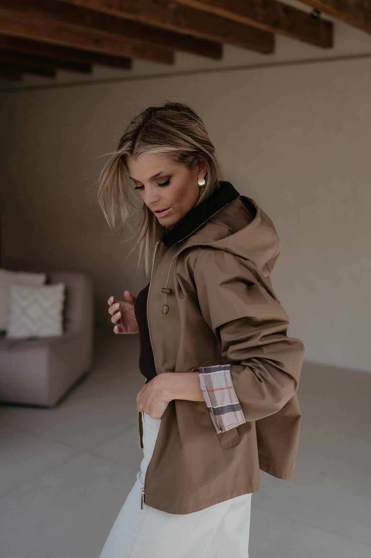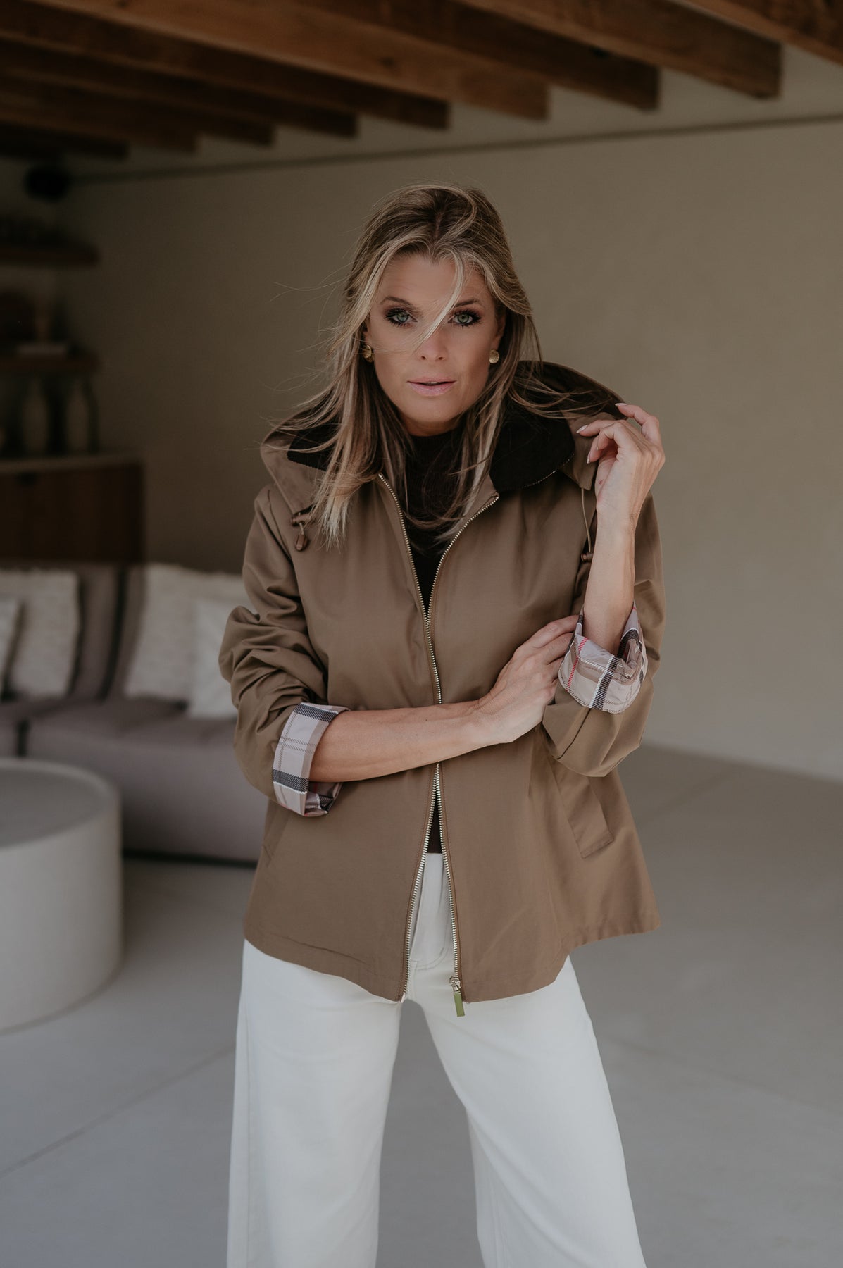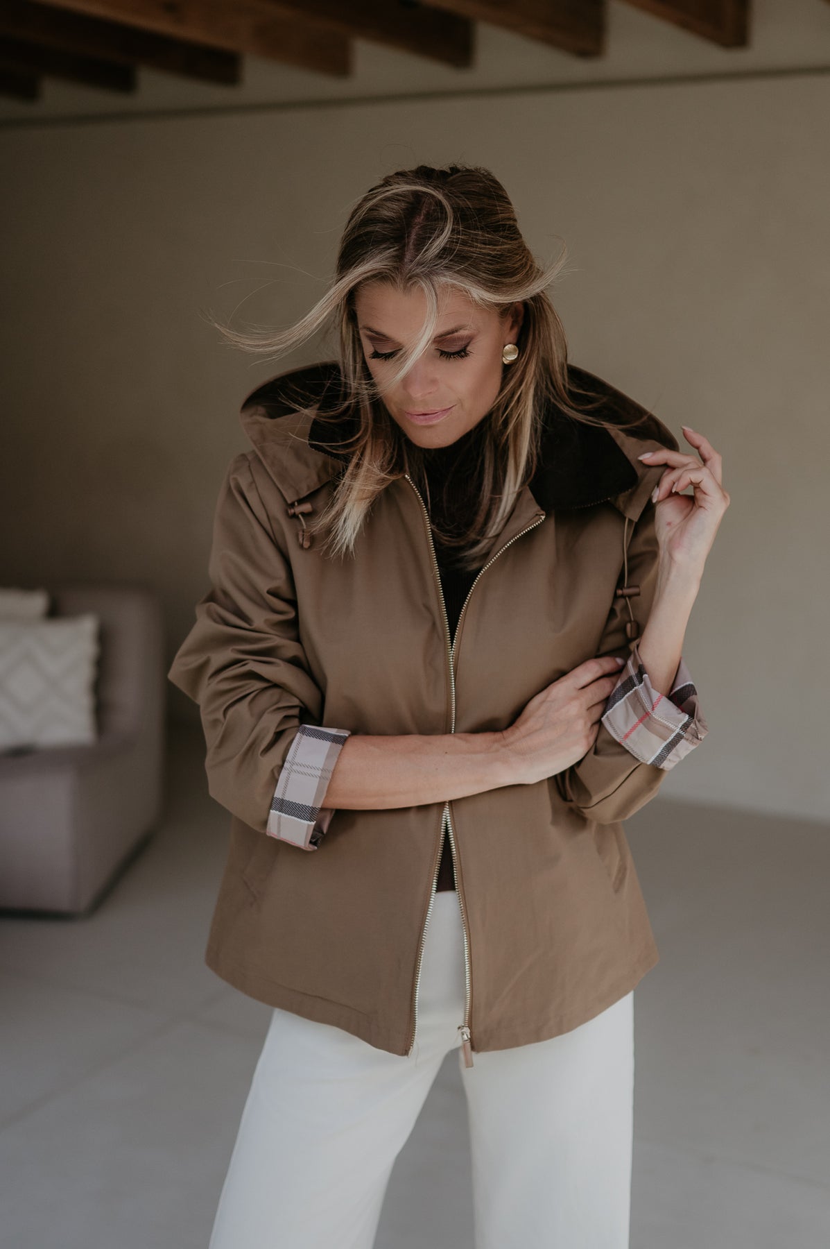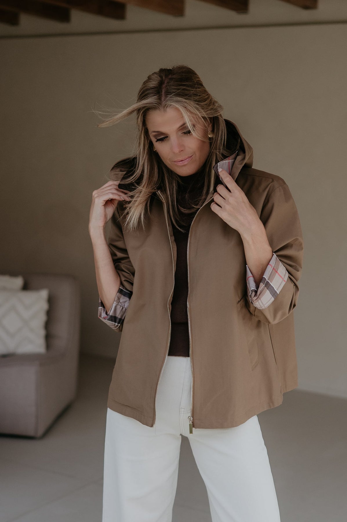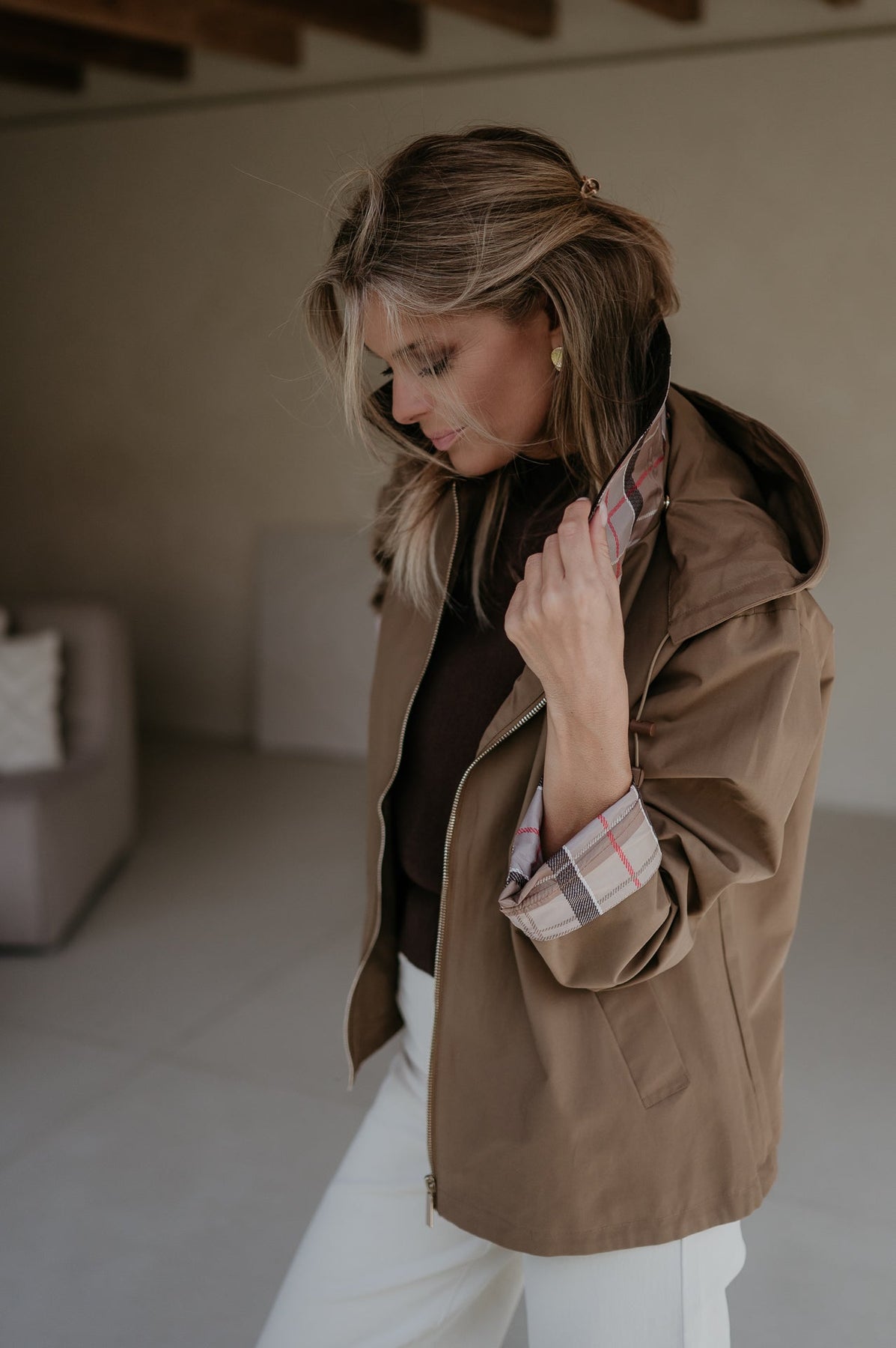 Deze camel kleurige korte regenjas met chocolade bruine details is zowel elegant als handig.