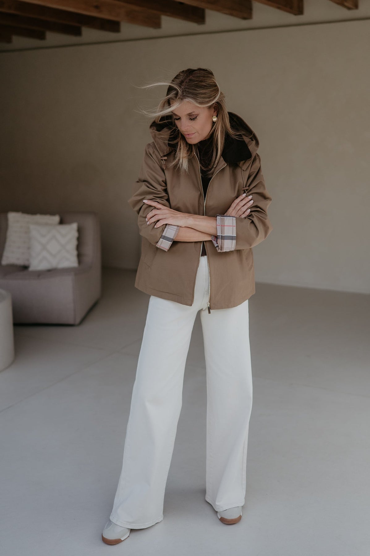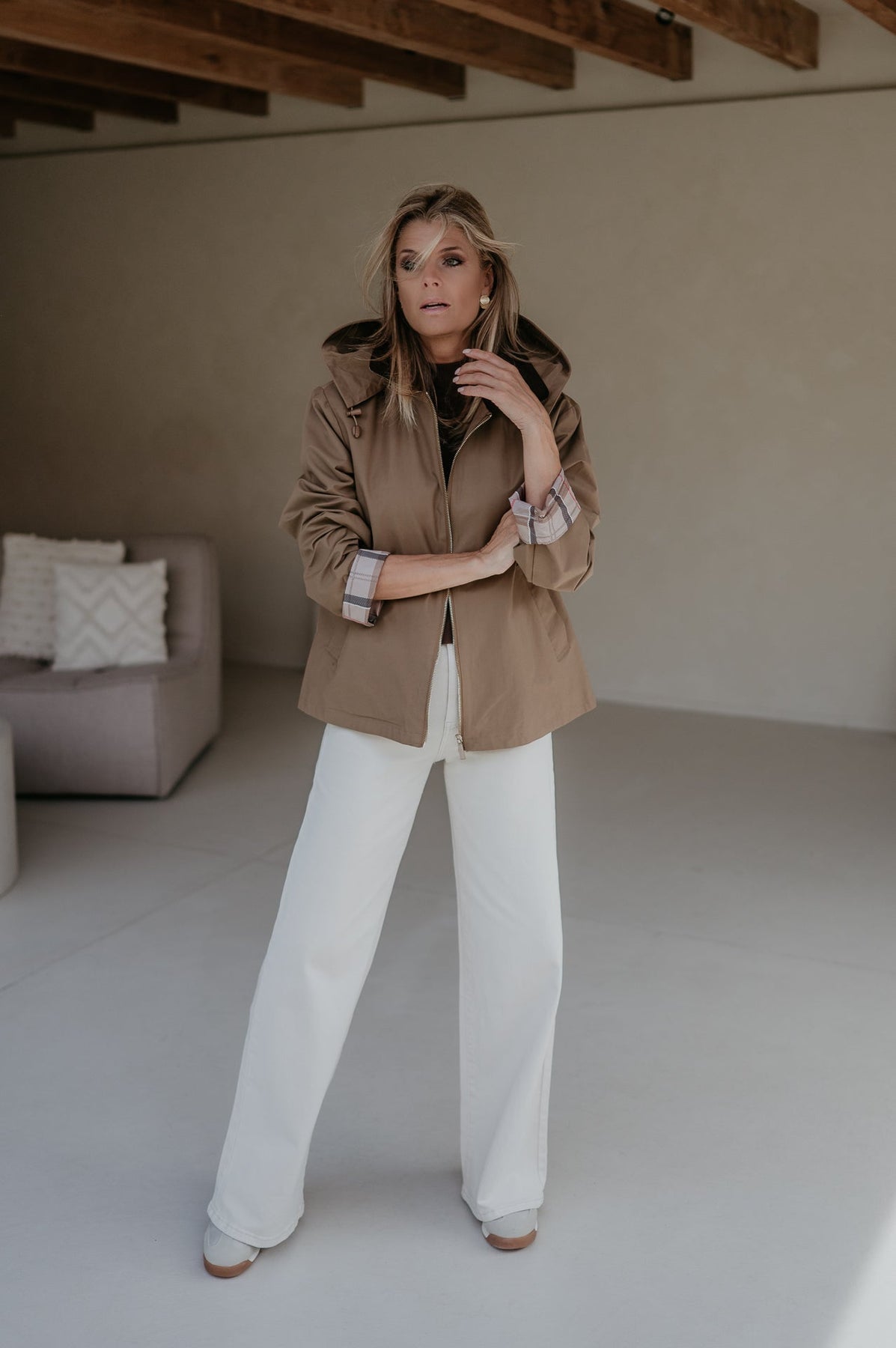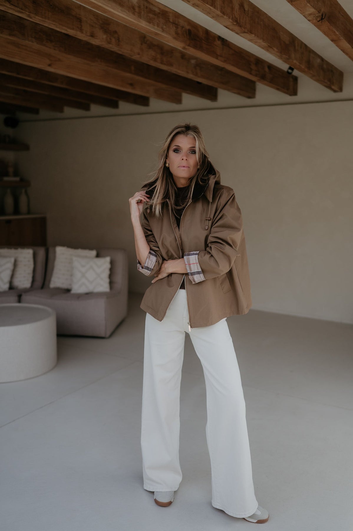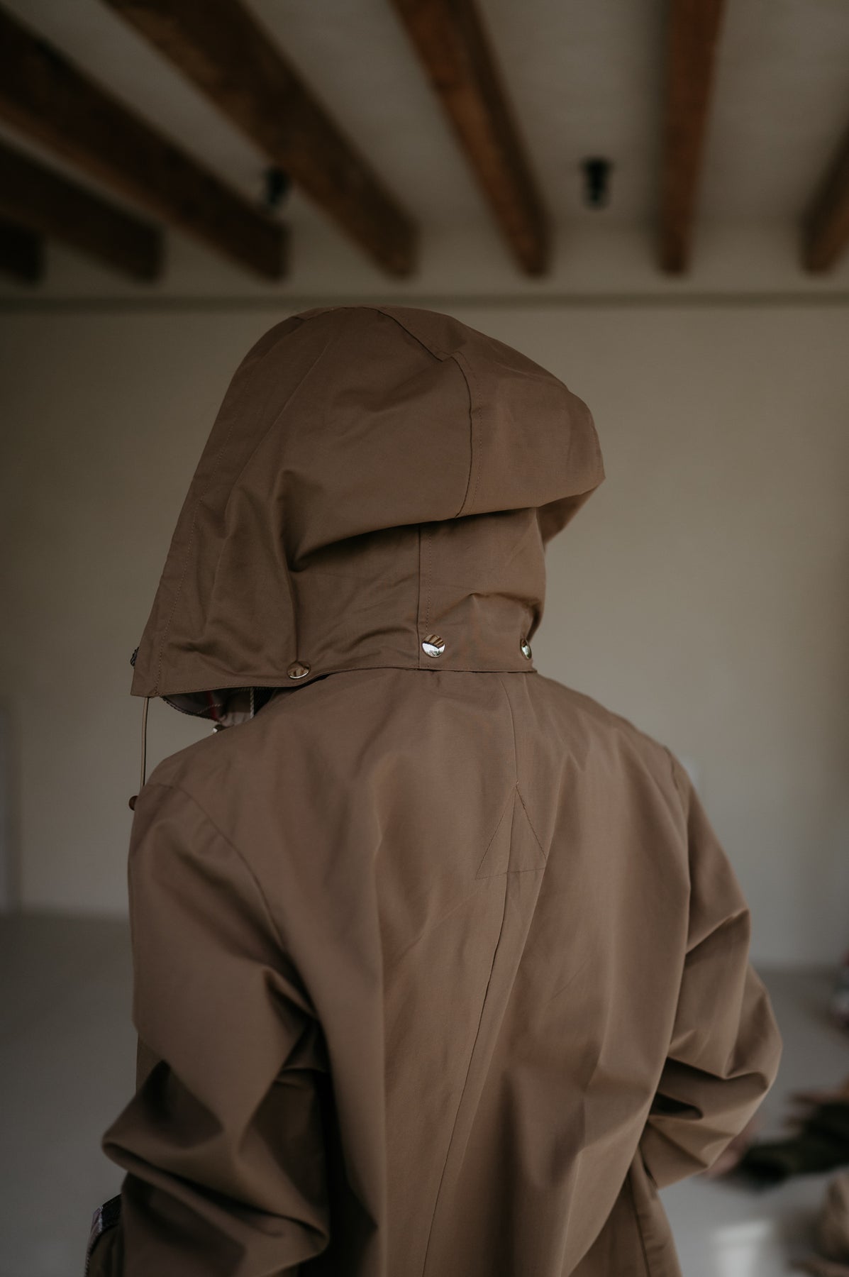 Deze camel kleurige korte regenjas met chocolade bruine details is zowel elegant als handig.