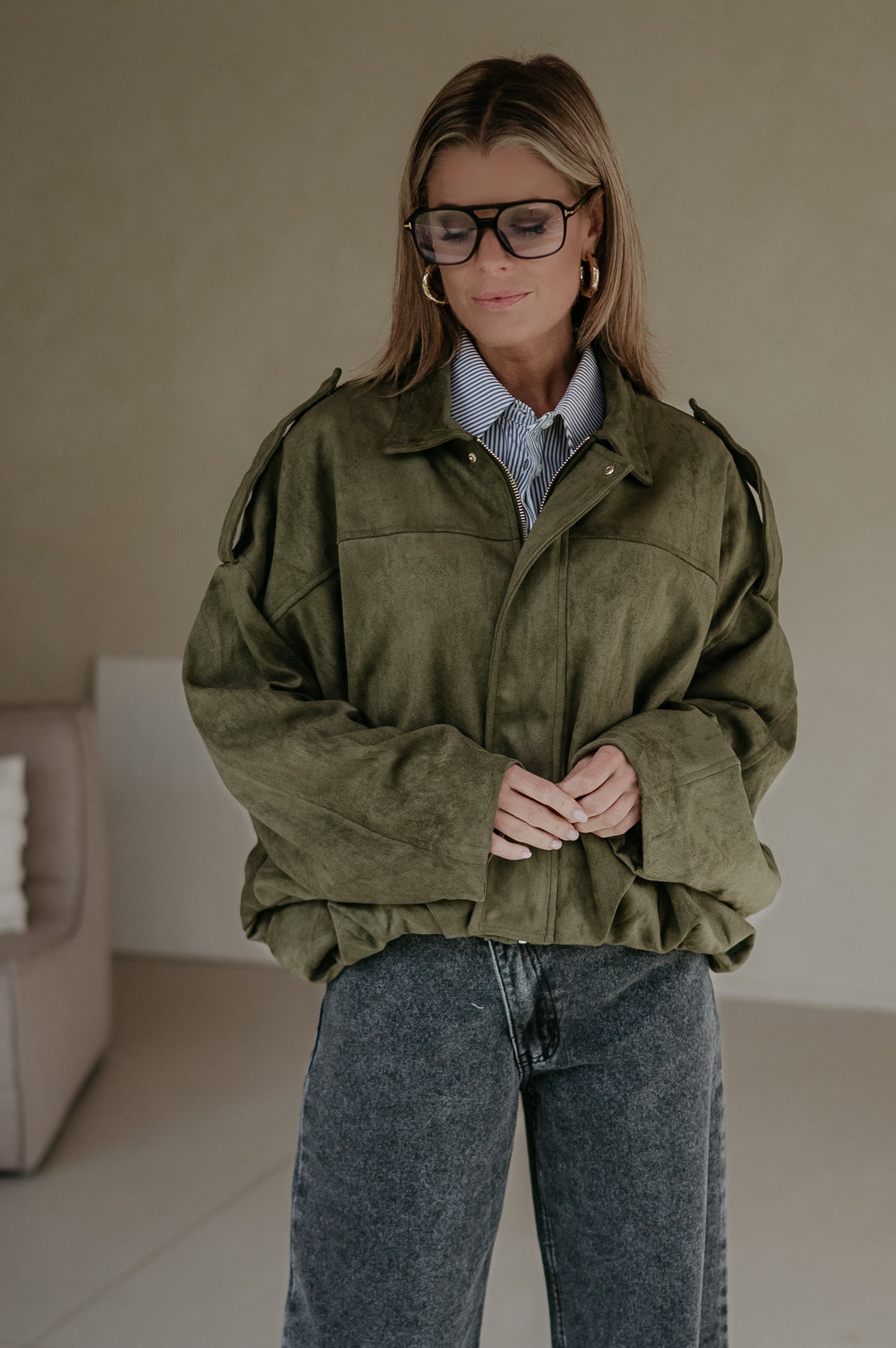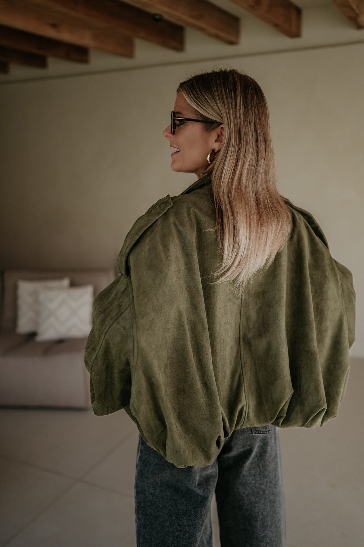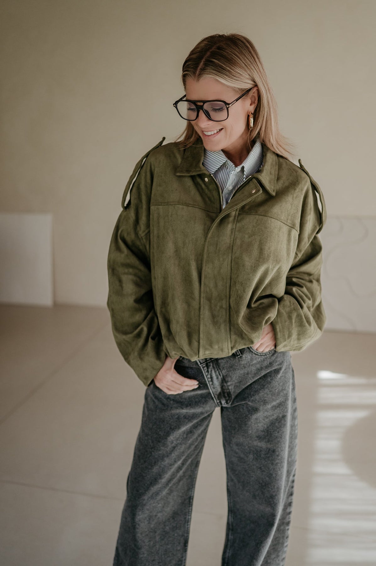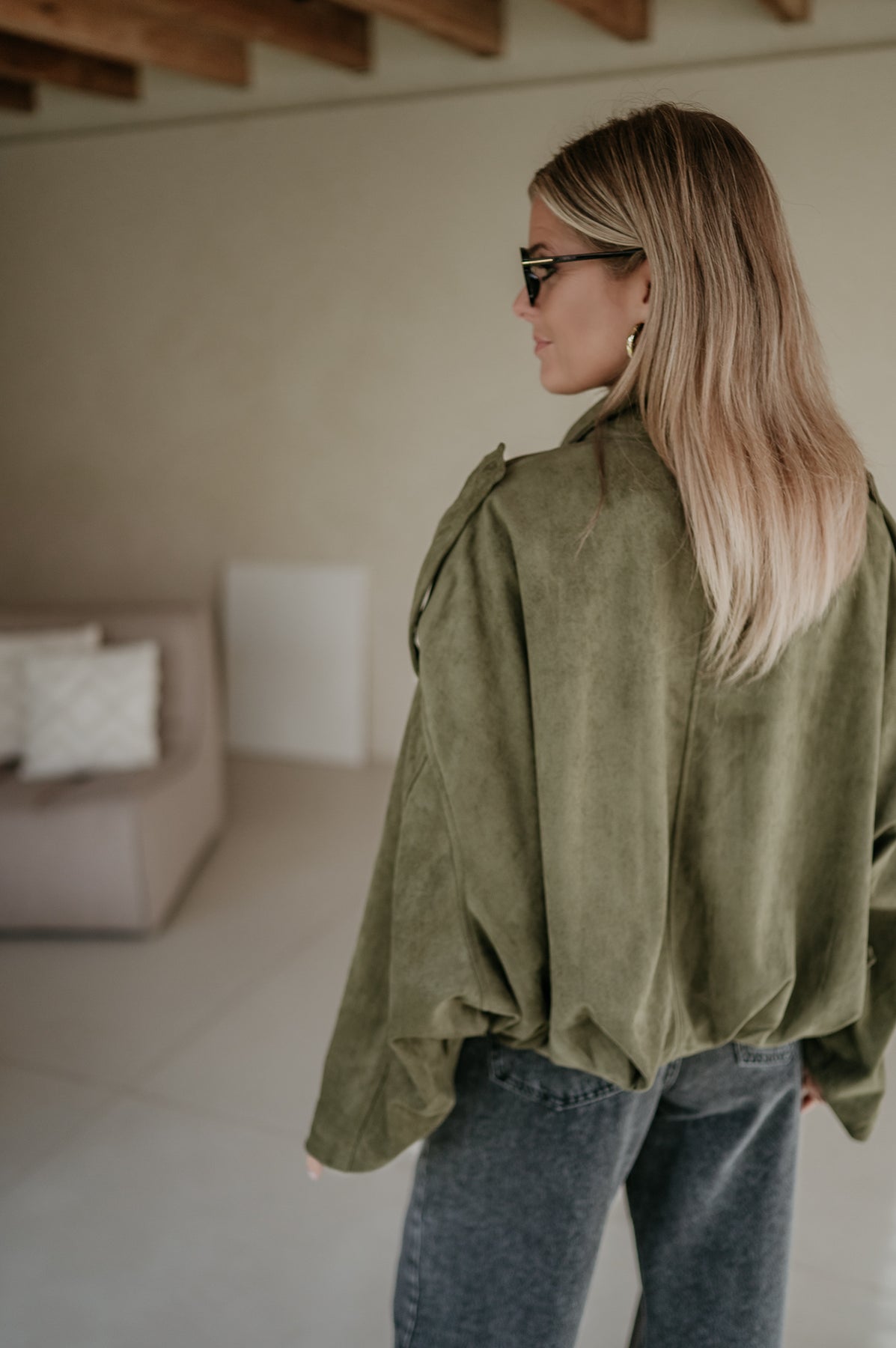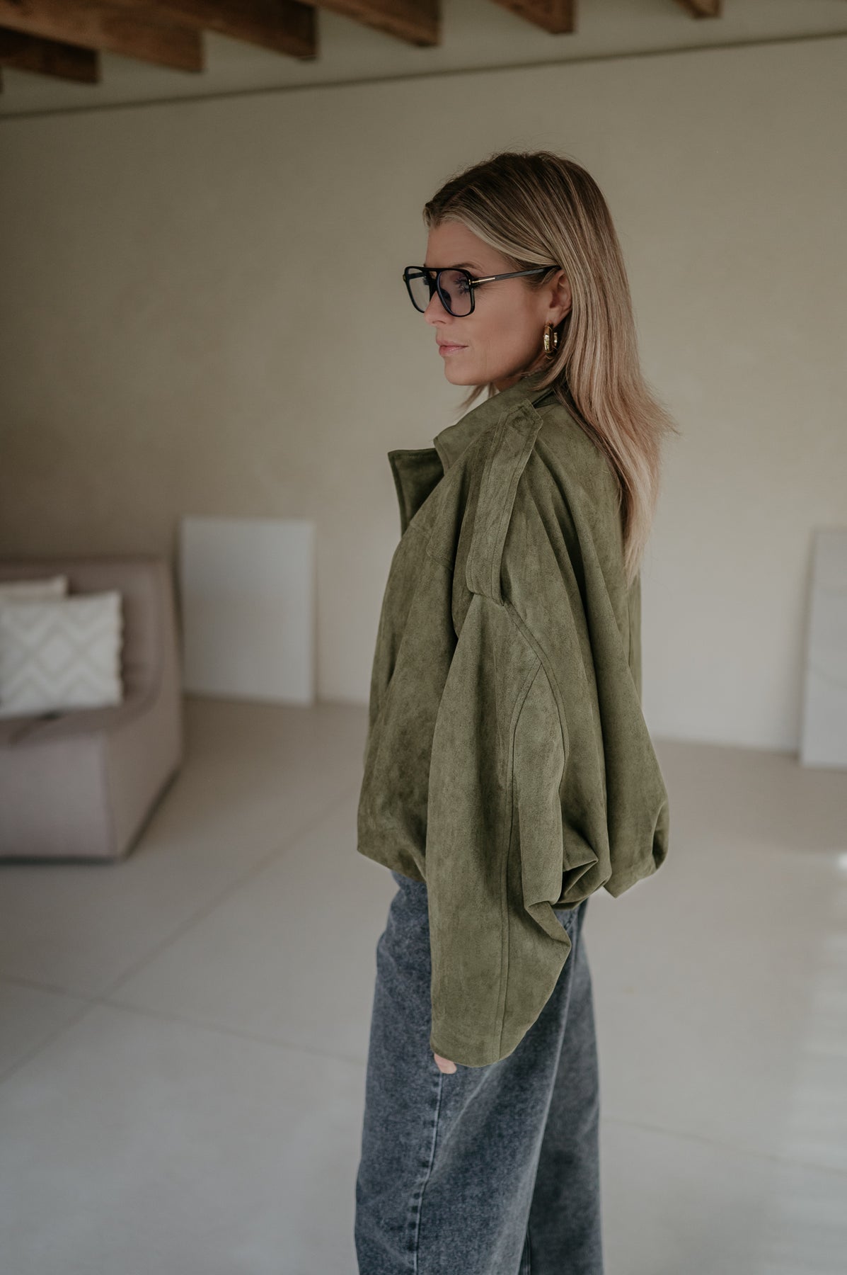 Prachtige kaki suède jasje, wij zijn er allemaal verliefd op.