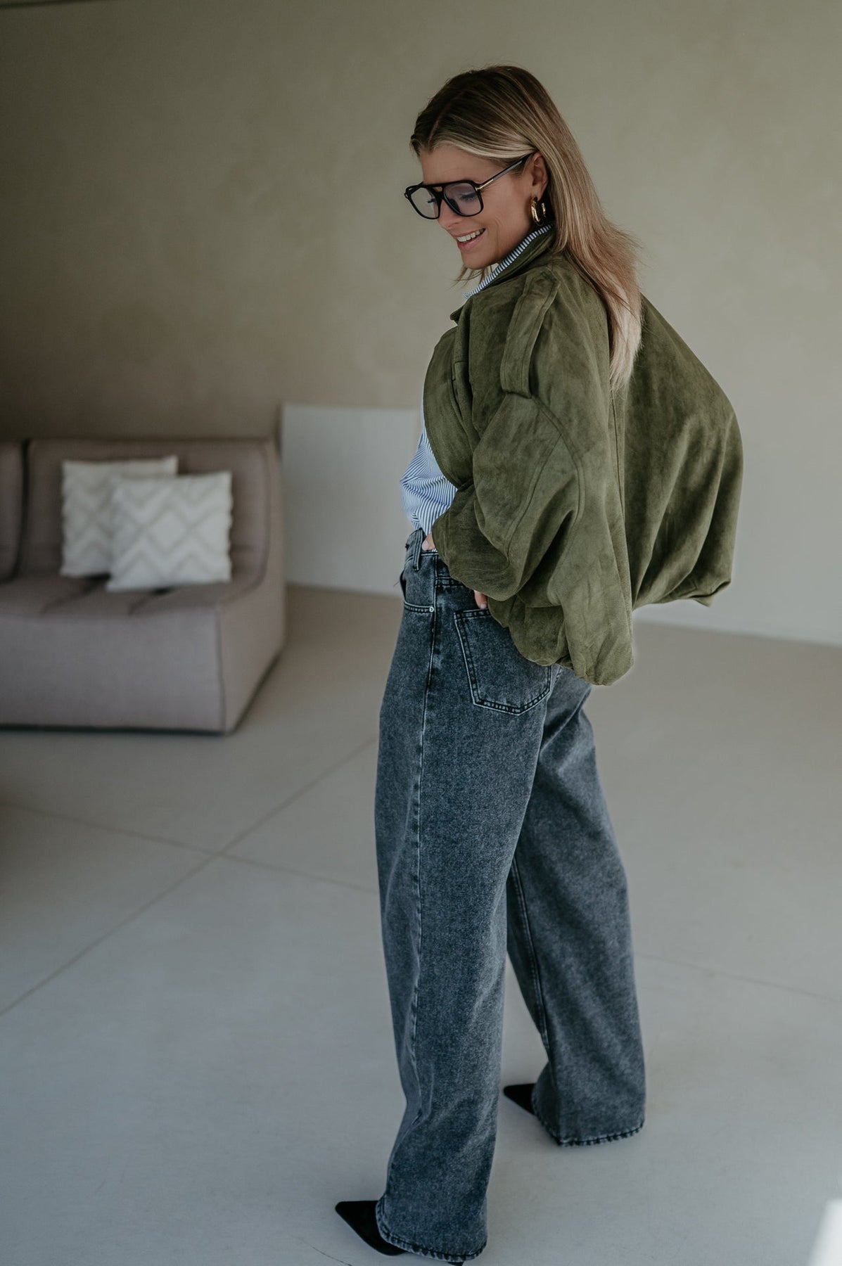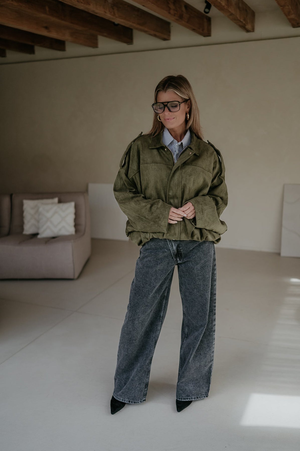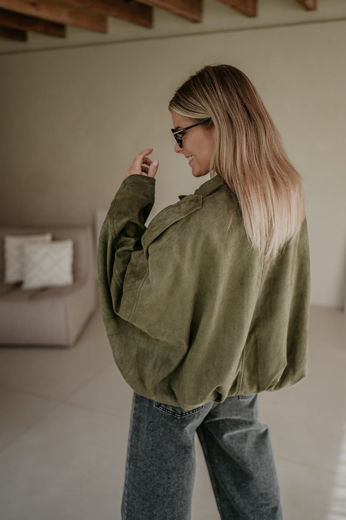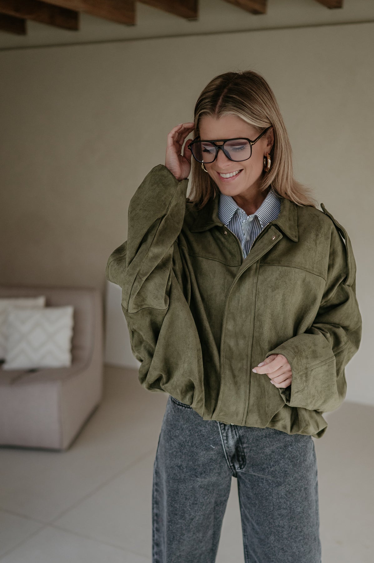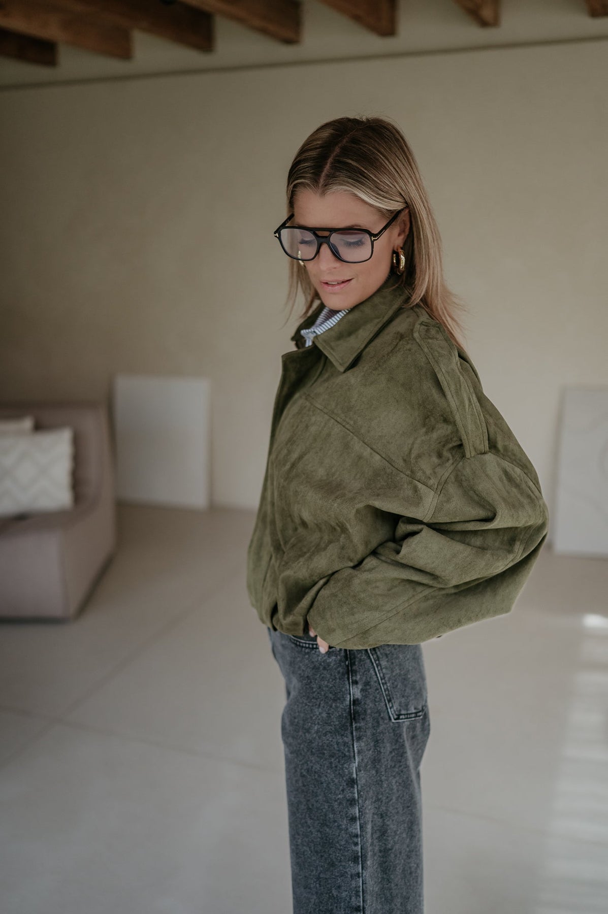 Prachtige kaki suède jasje, wij zijn er allemaal verliefd op.