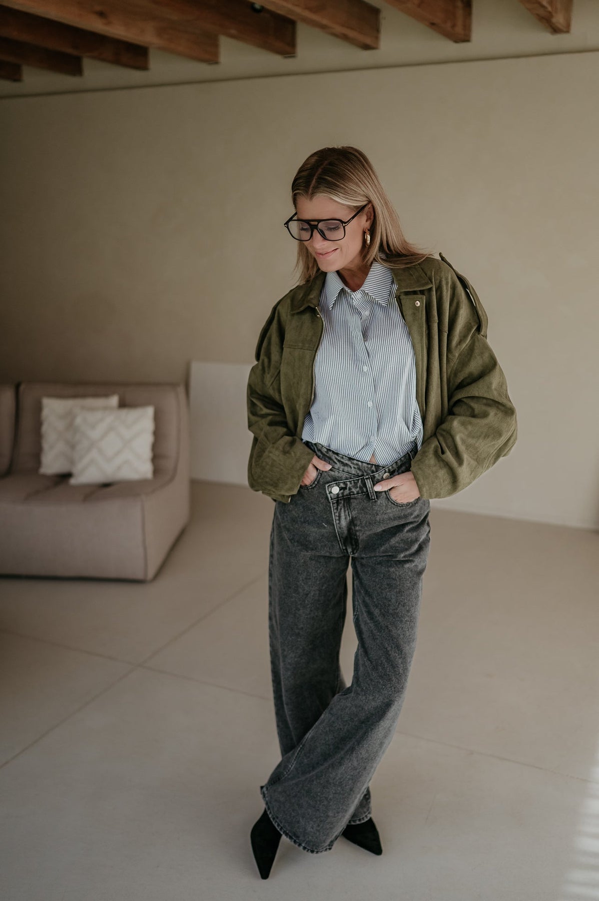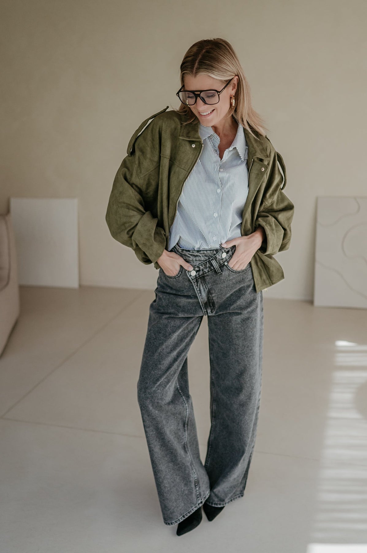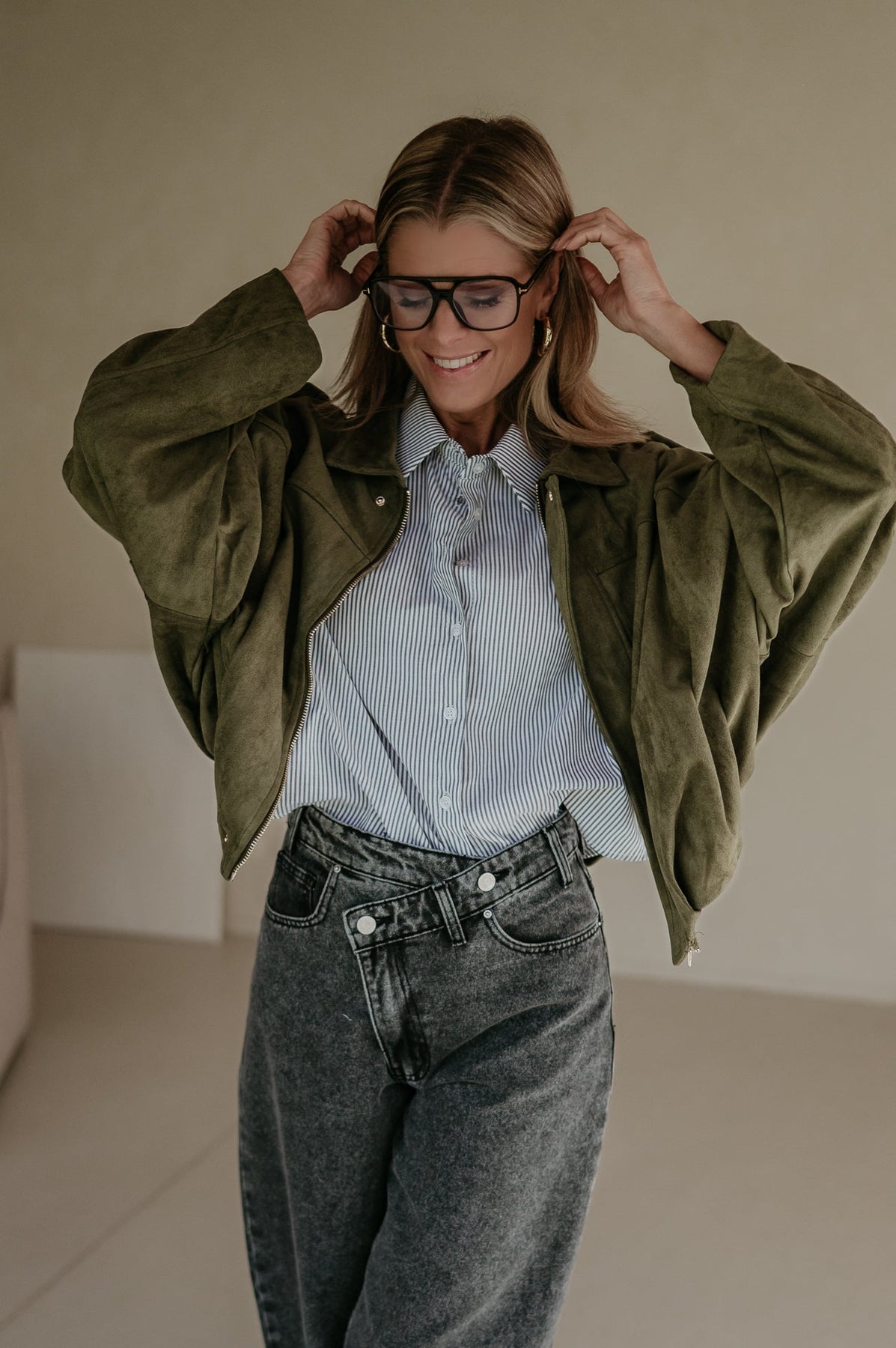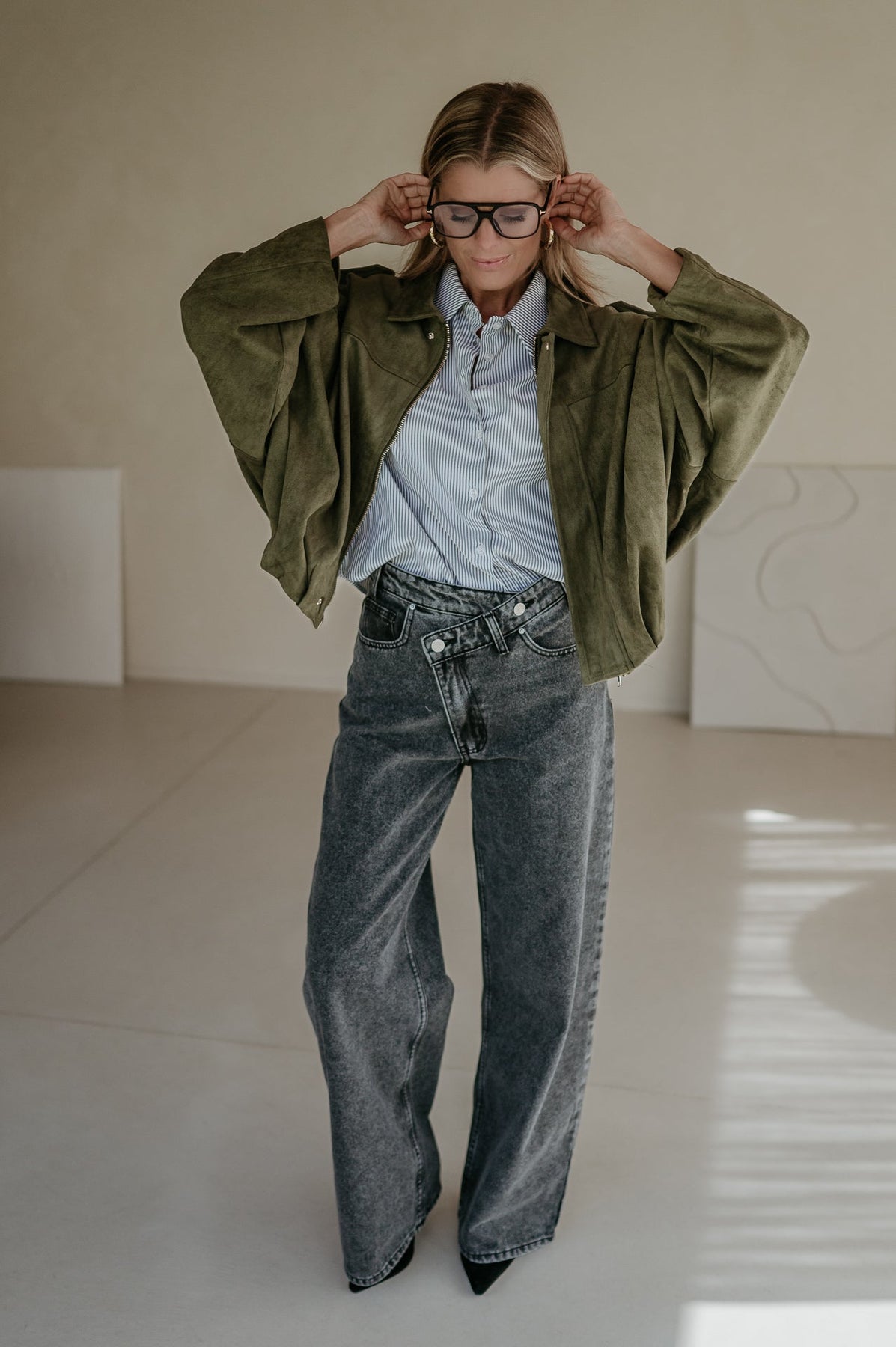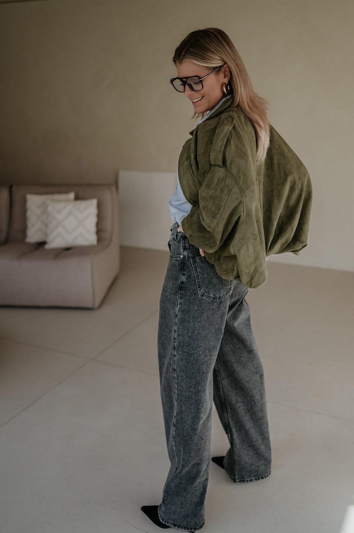 Prachtige kaki suède jasje, wij zijn er allemaal verliefd op.