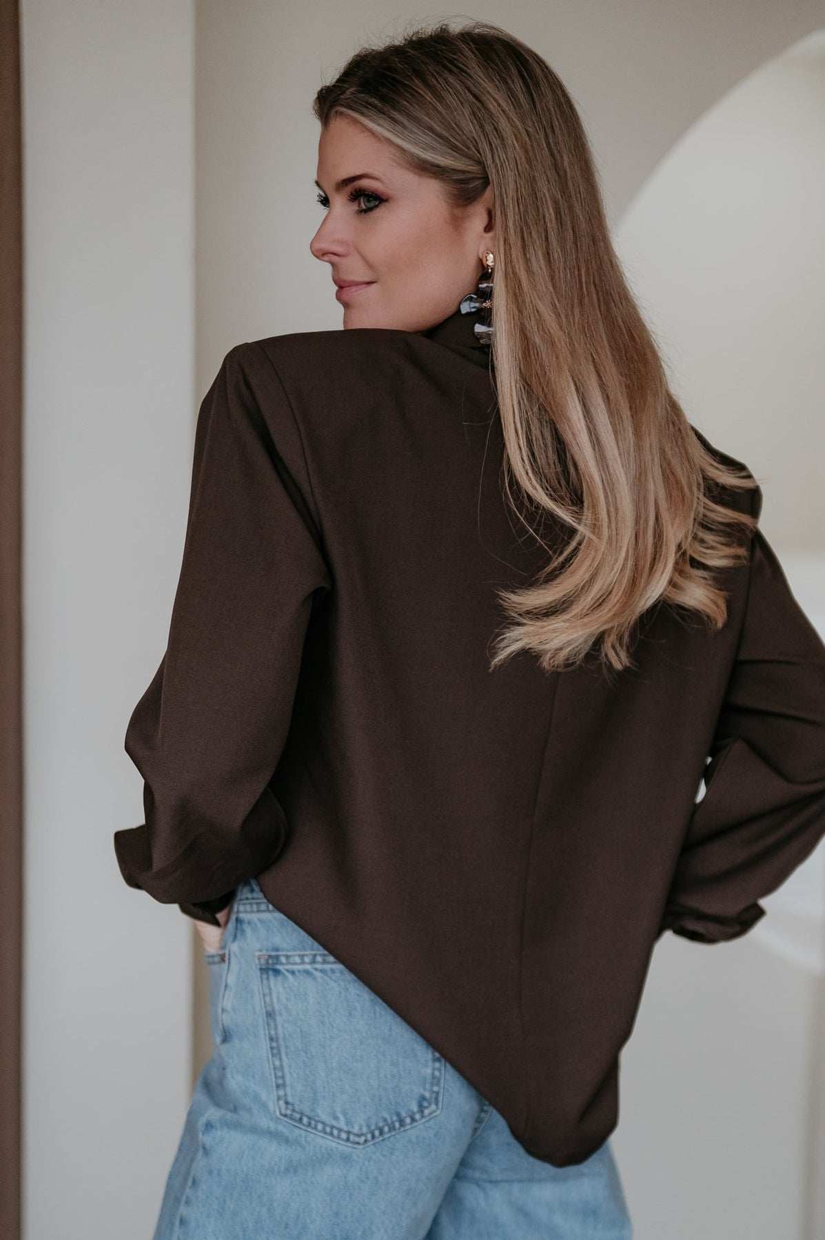 Het heeft die elegante, geklede look van een blazer maar voelt licht en vrouwelijk zoals een blouse.