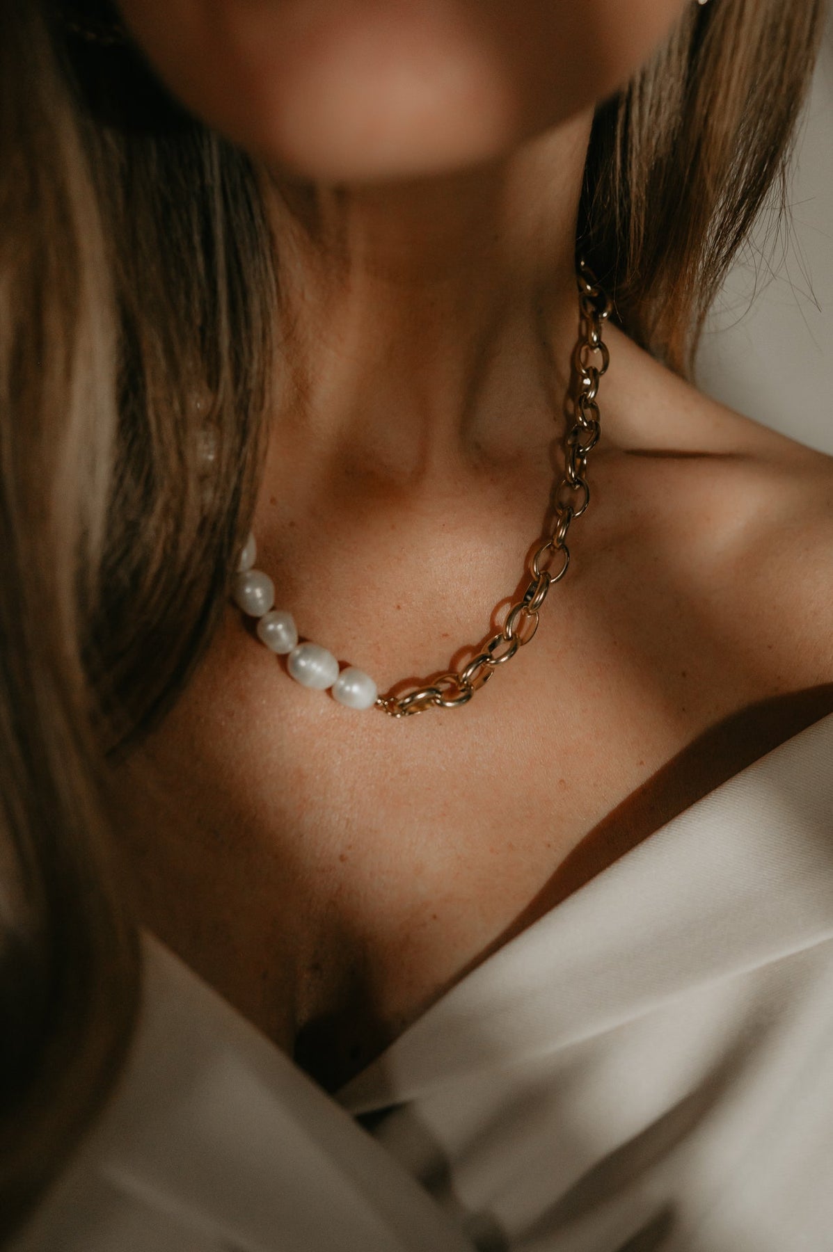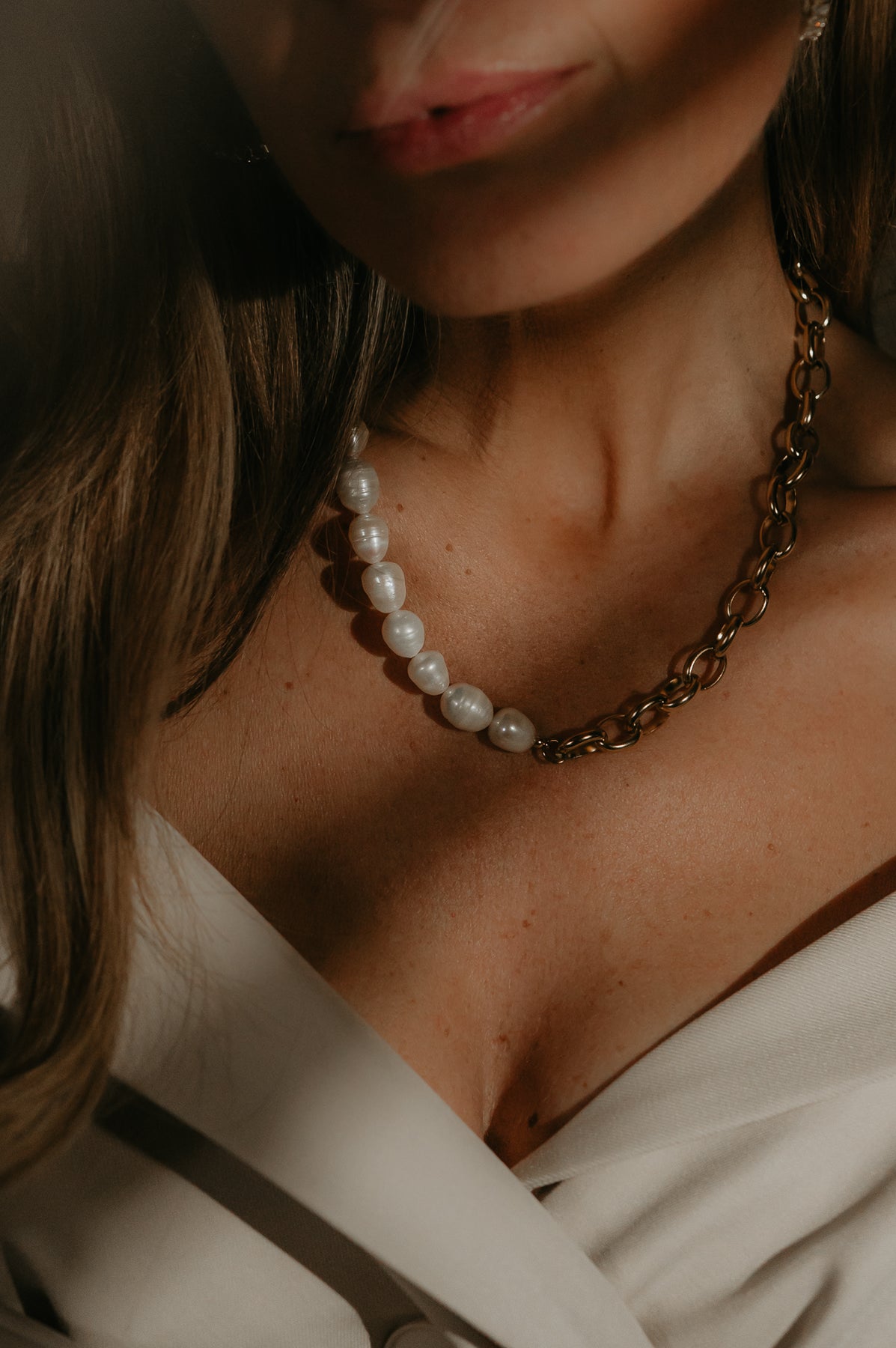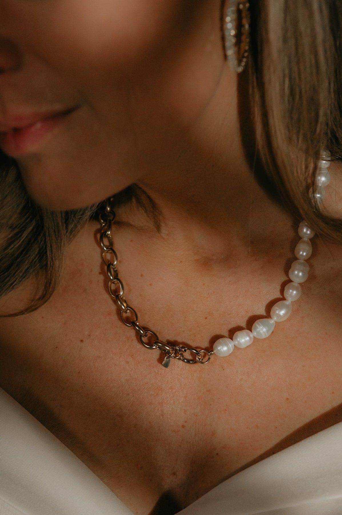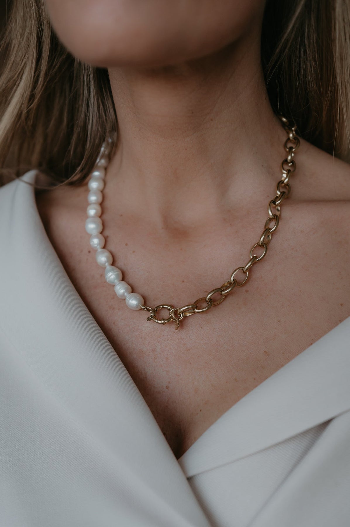 Een heel mooie ketting met een unieke mix van twee stijlen: de ene helft bestaat uit elegante parels, terwijl de andere helft een stoere schakelketting is.