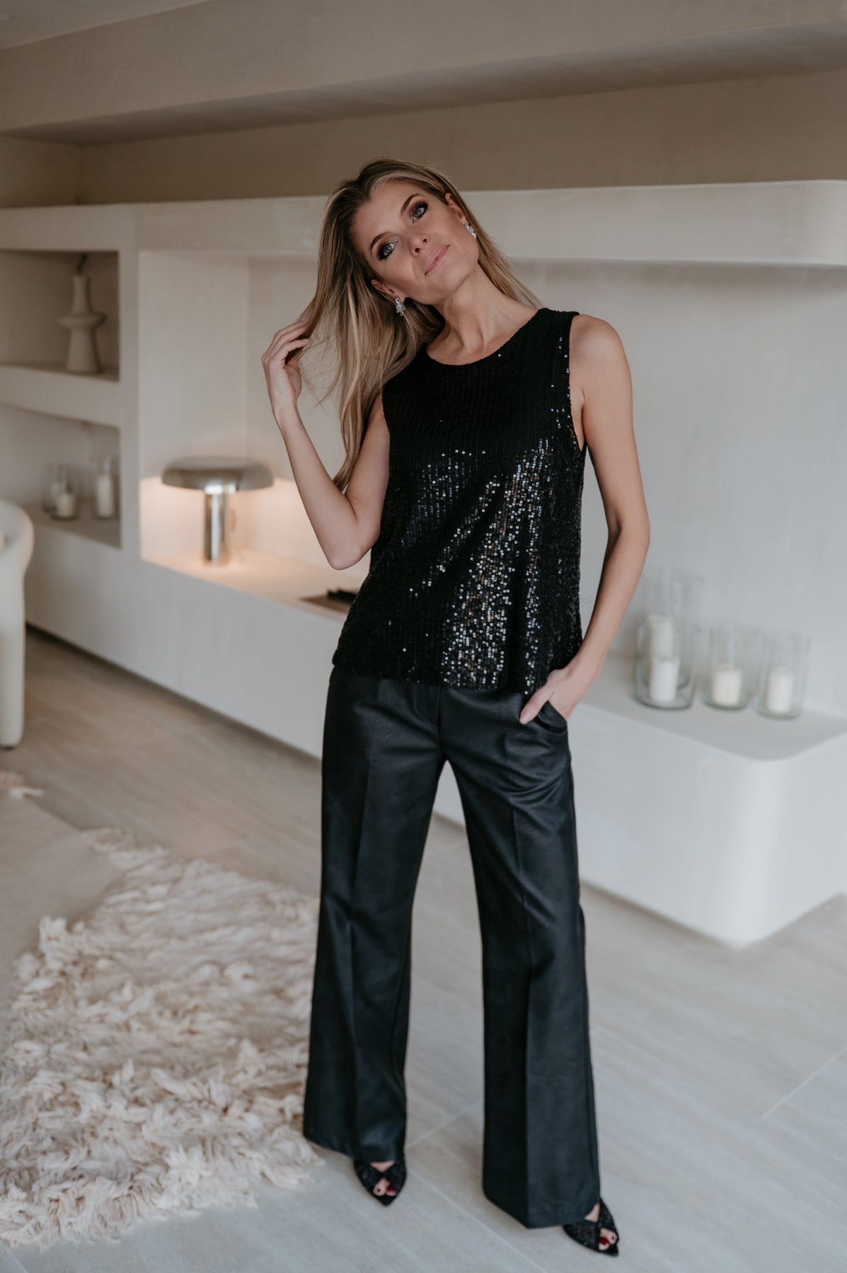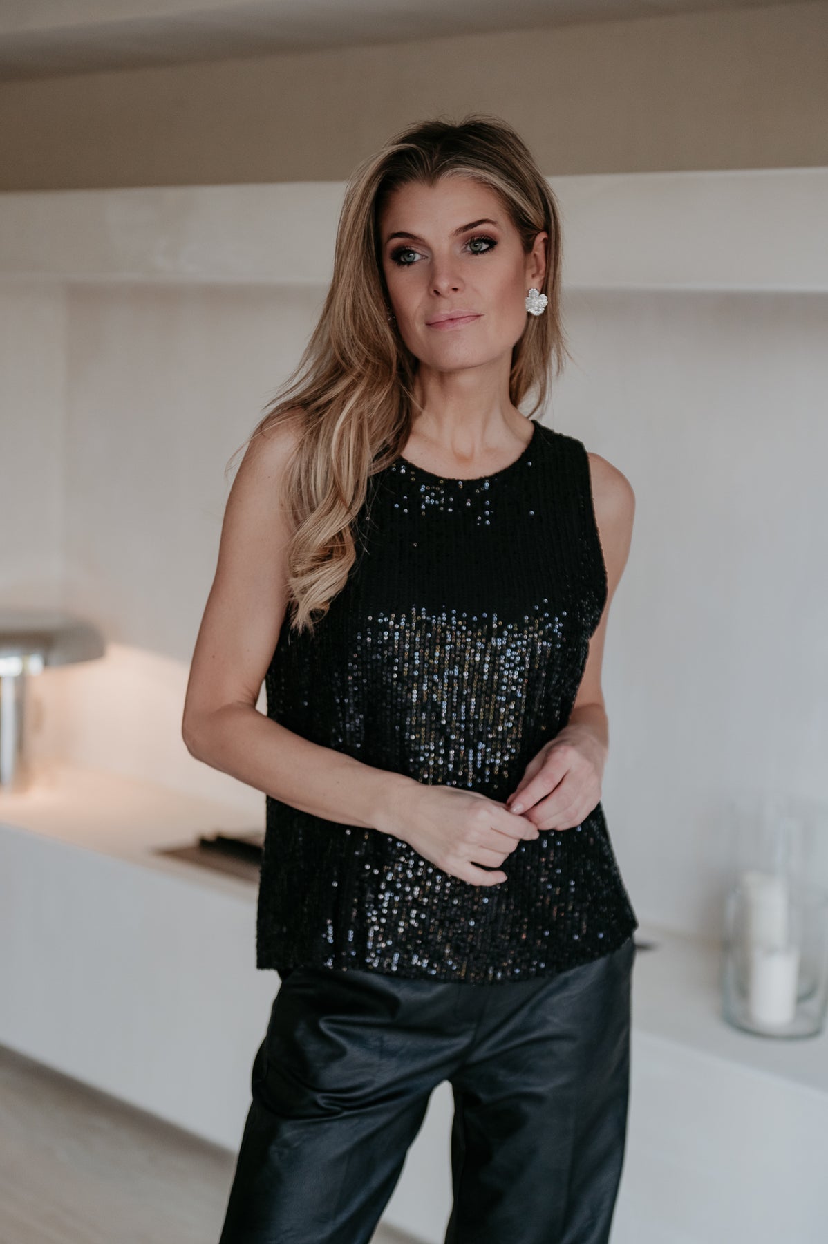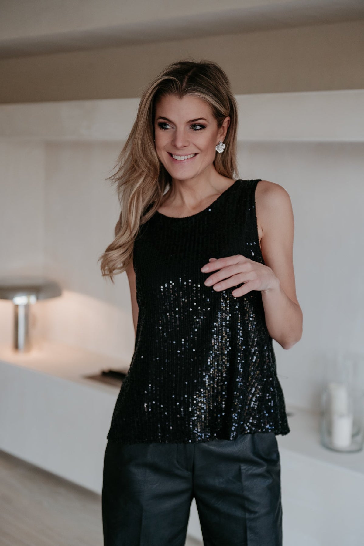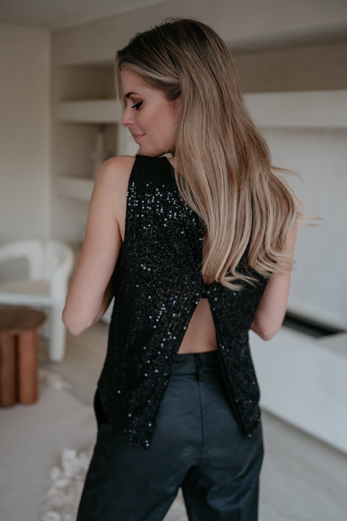 Deze top met zwarte glitters en een open rug is de perfecte mix van glamour en speelsheid.