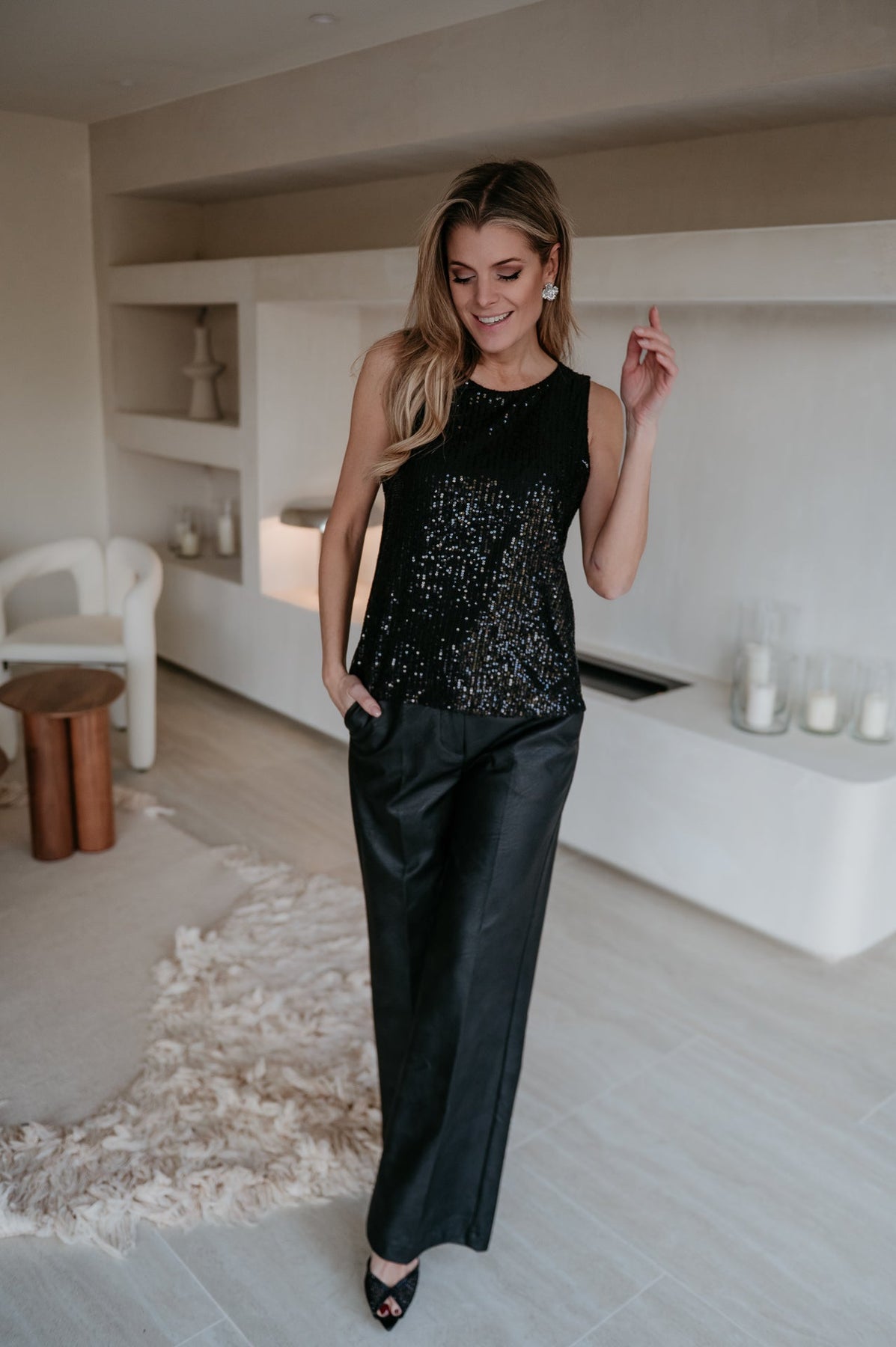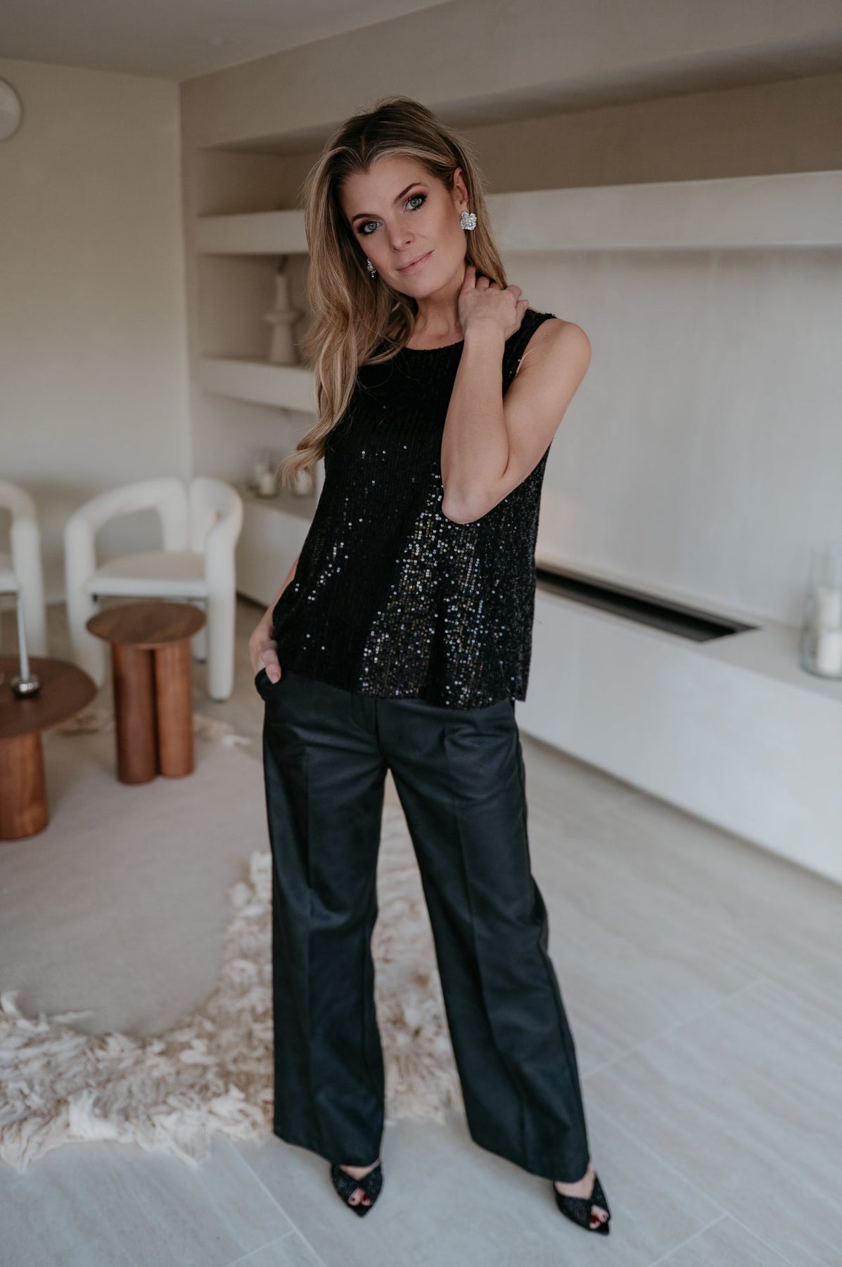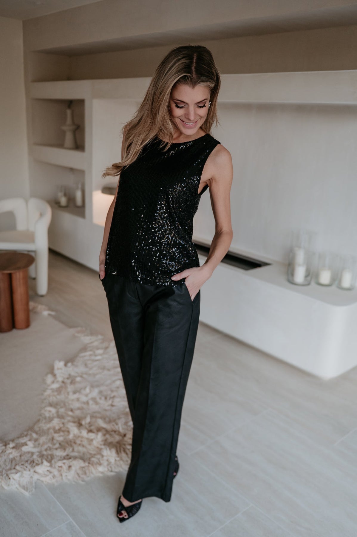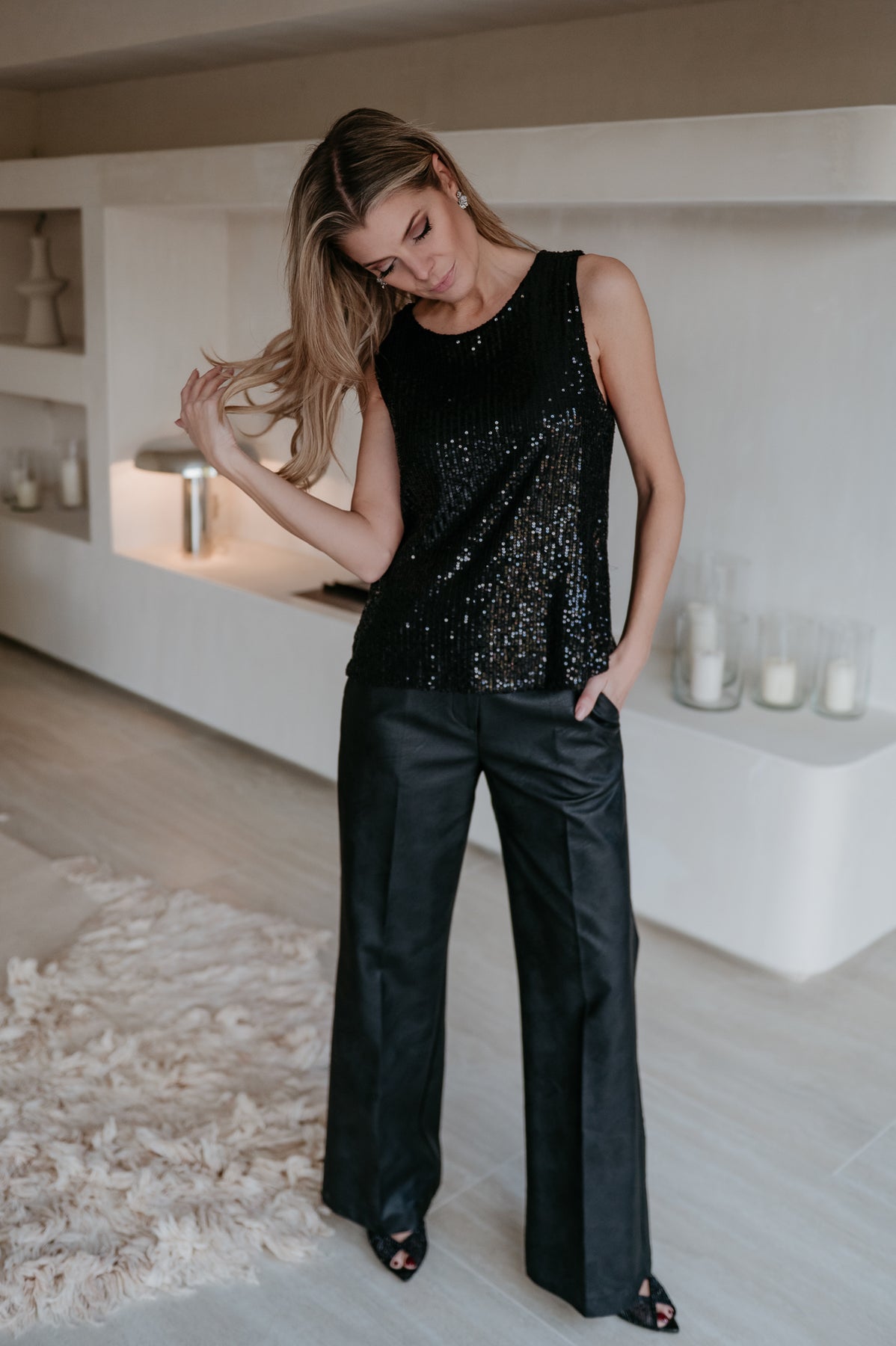 Deze top met zwarte glitters en een open rug is de perfecte mix van glamour en speelsheid.
