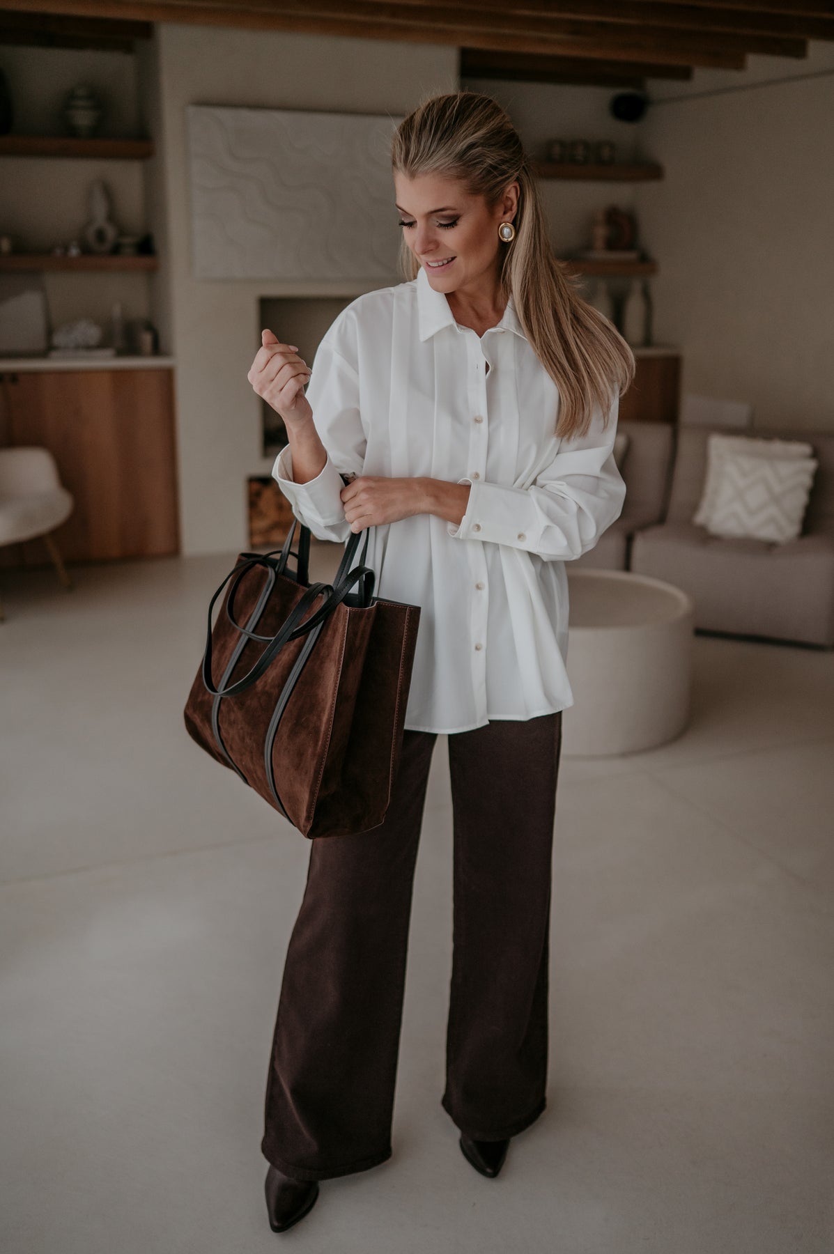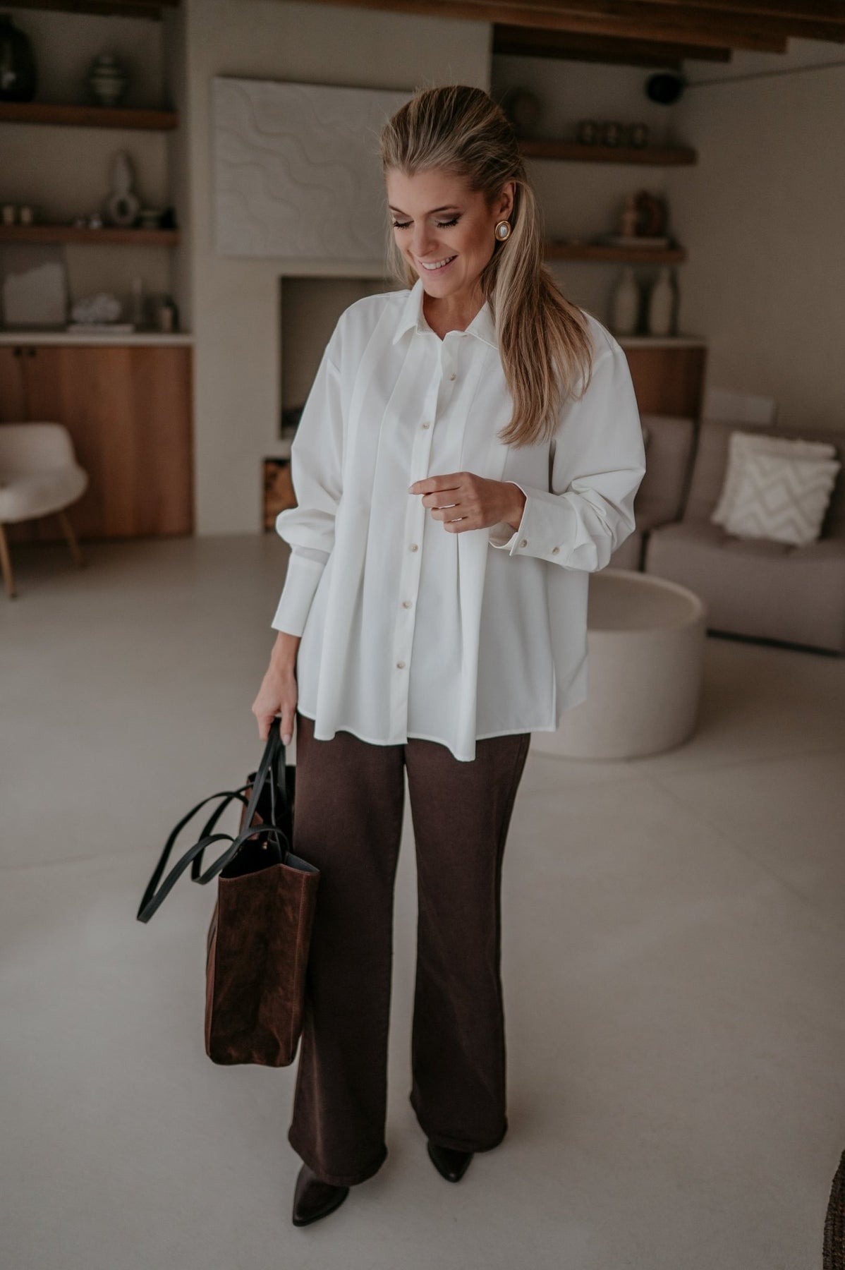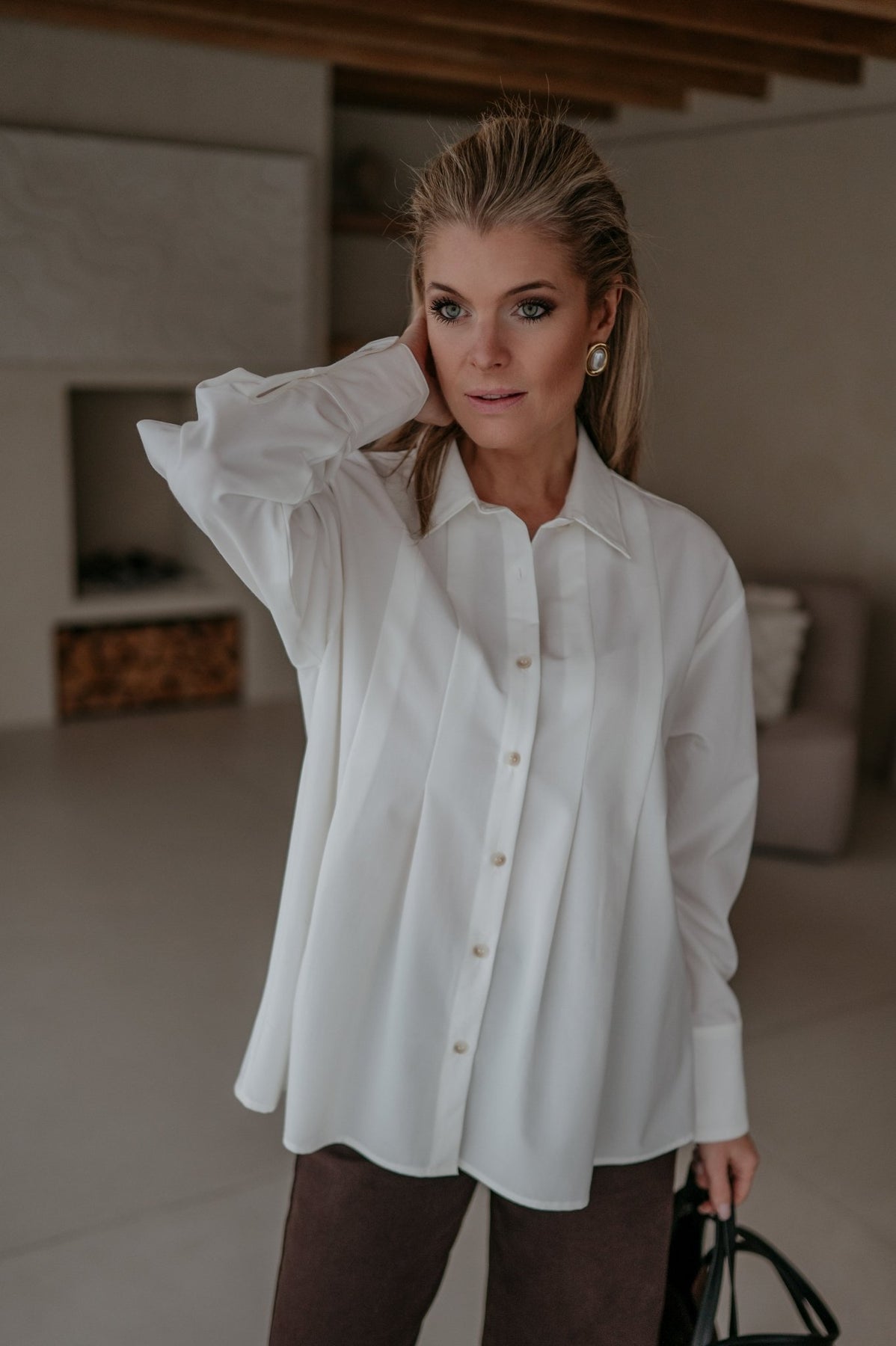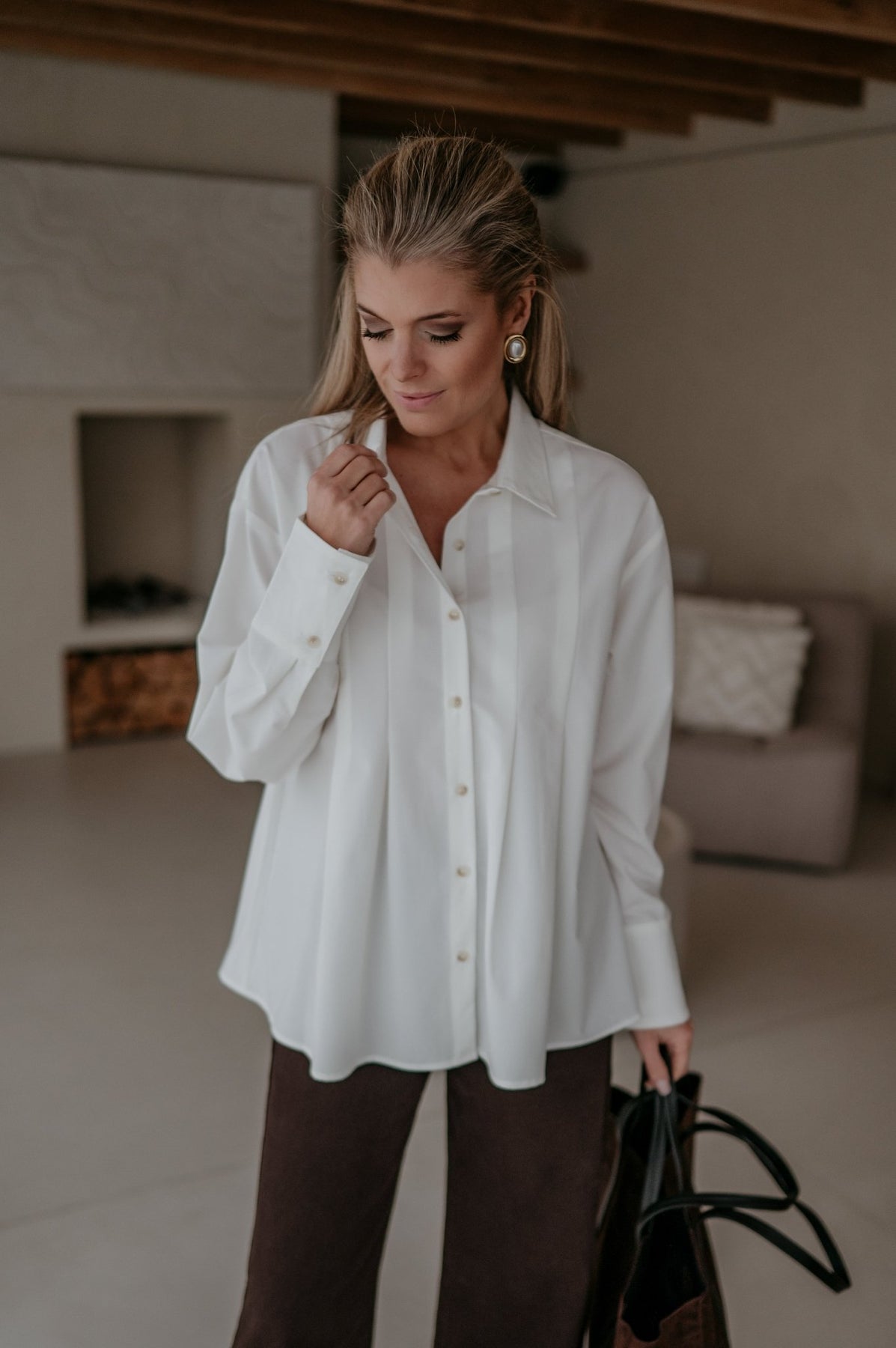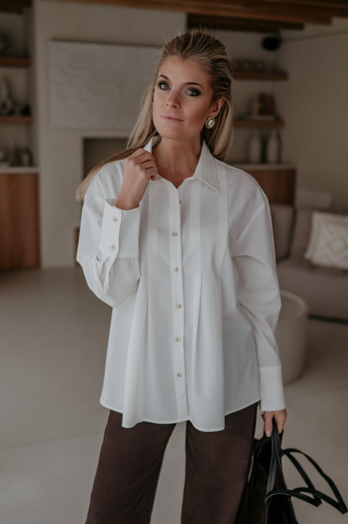 Prachtig wit bloesje met elegante plooitjes vooraan die zorgen voor een verfijnde en vrouwelijke look.