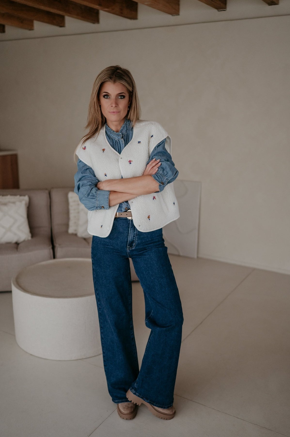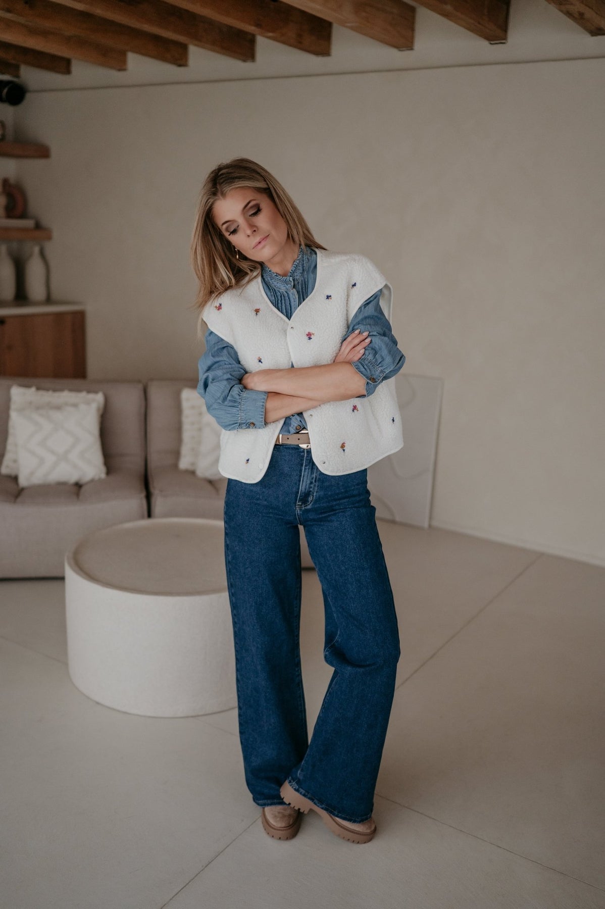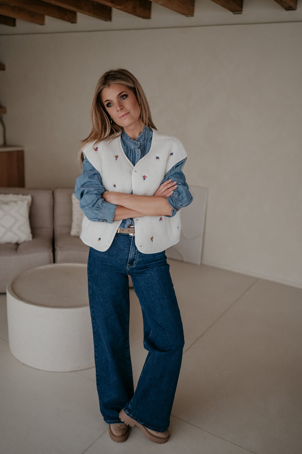 Zachte en gezellige gilet met fijne, geborduurde bloemetjes die zorgen voor een subtiele en romantische uitstraling.