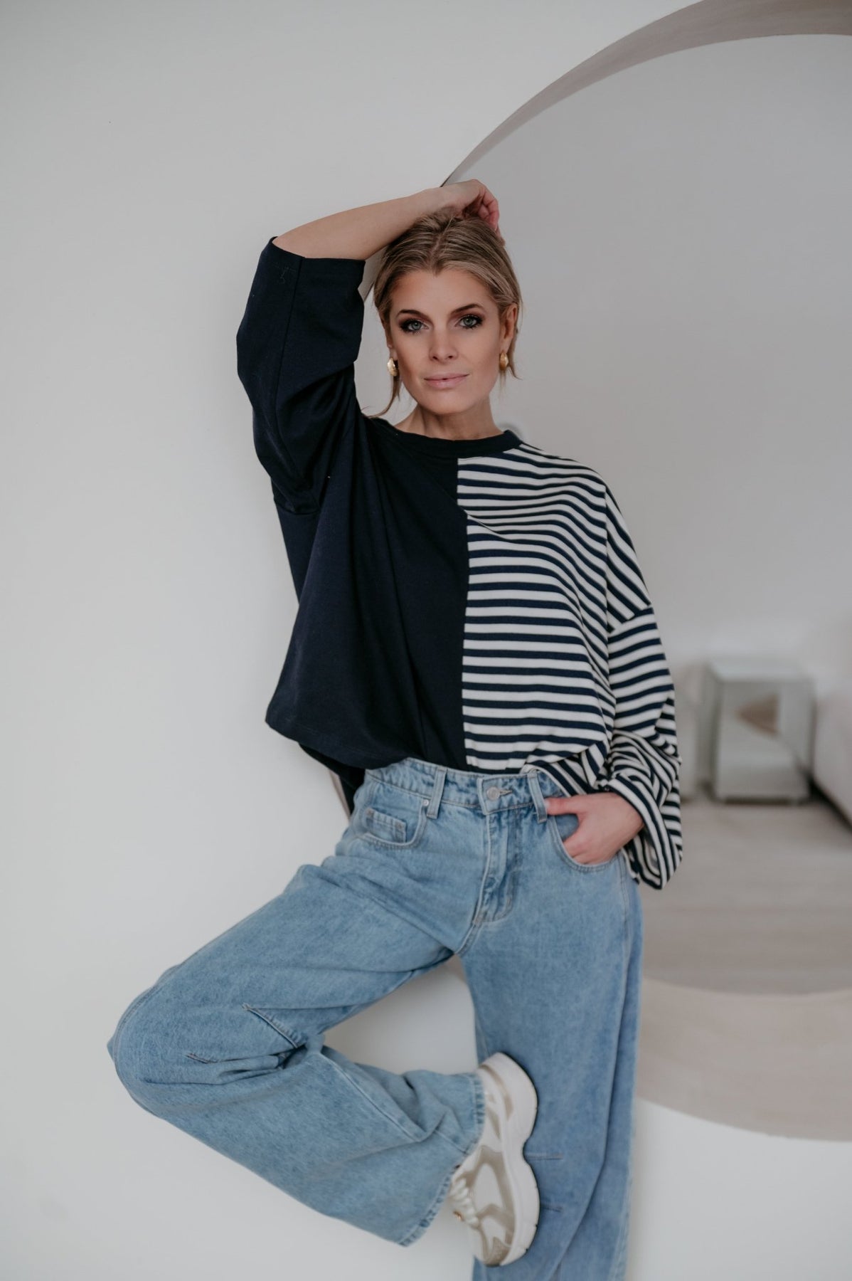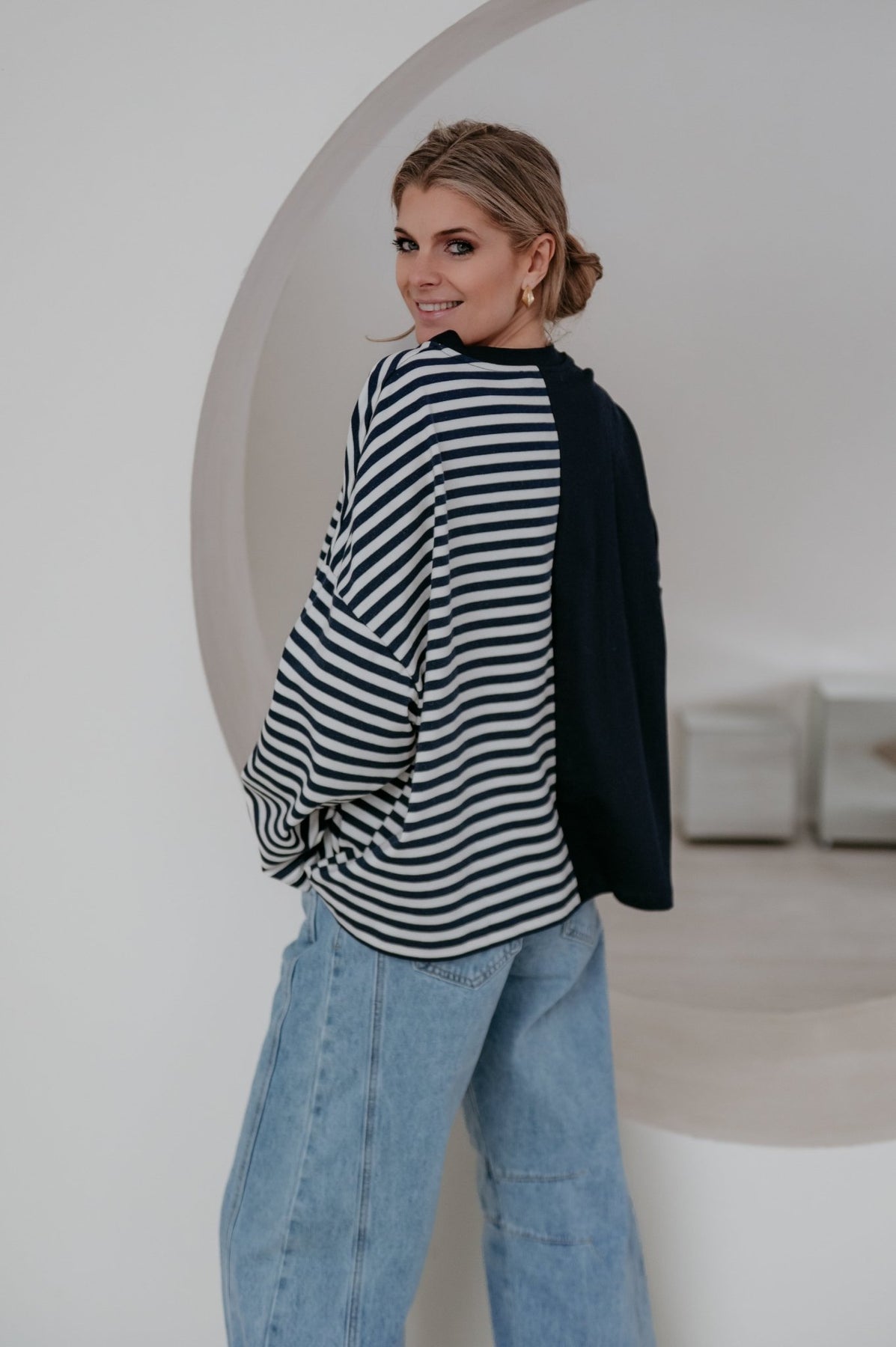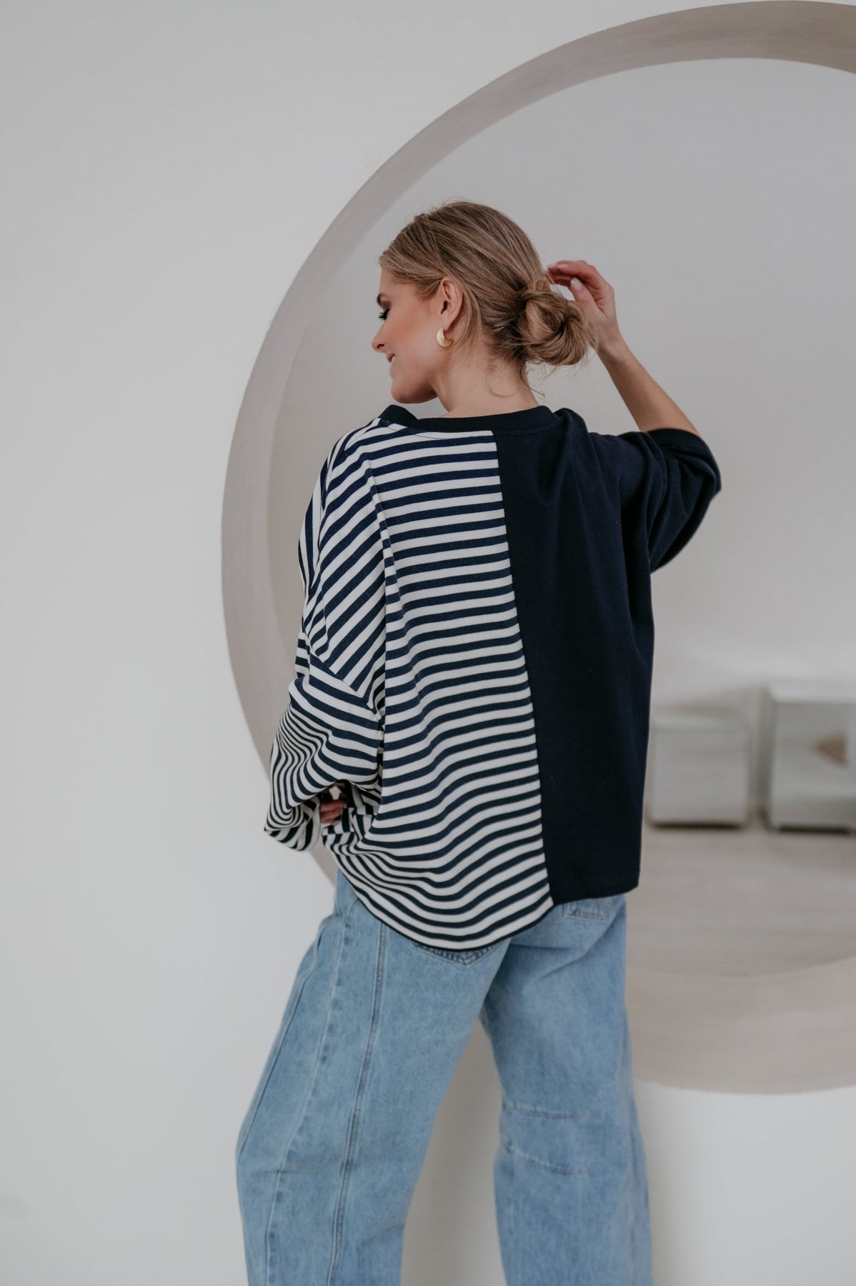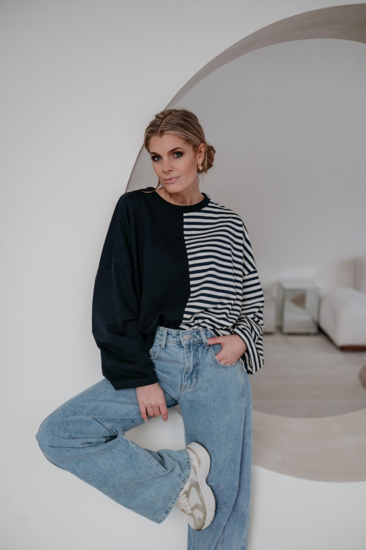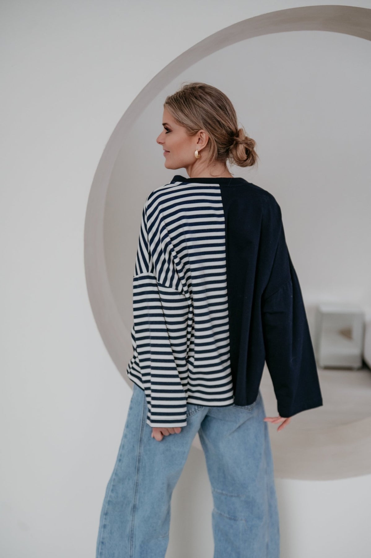 Deze longsleeve is echt iets bijzonders met langs de ene kant streepjes en langs de andere kant effen.