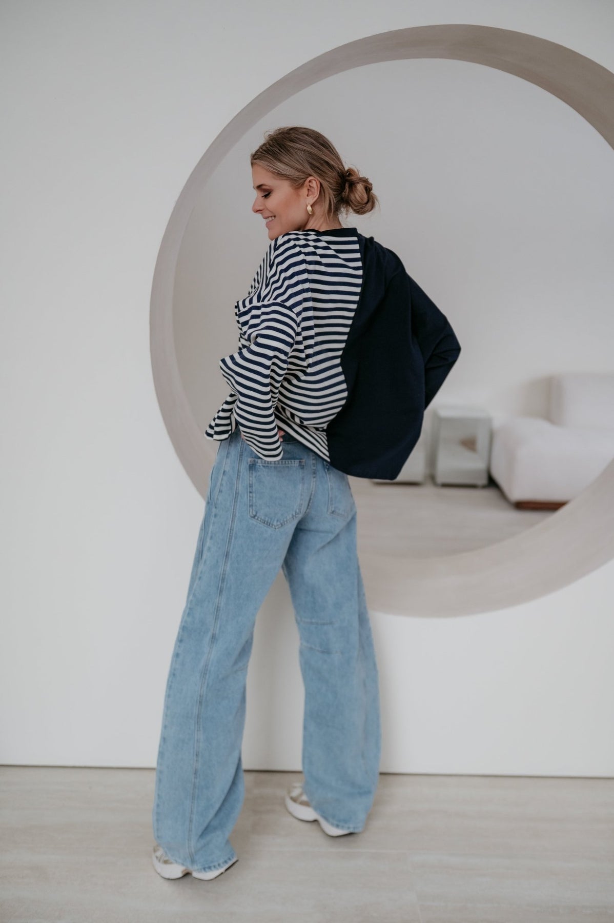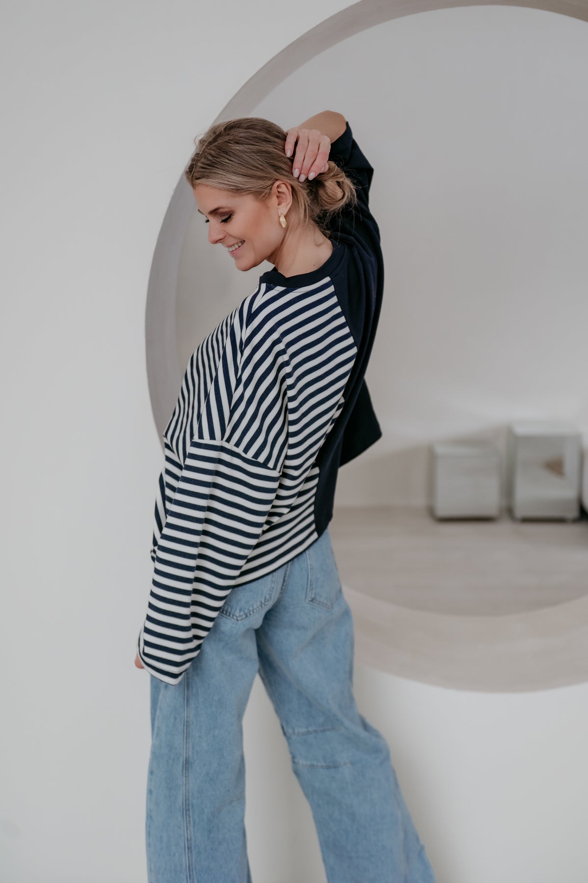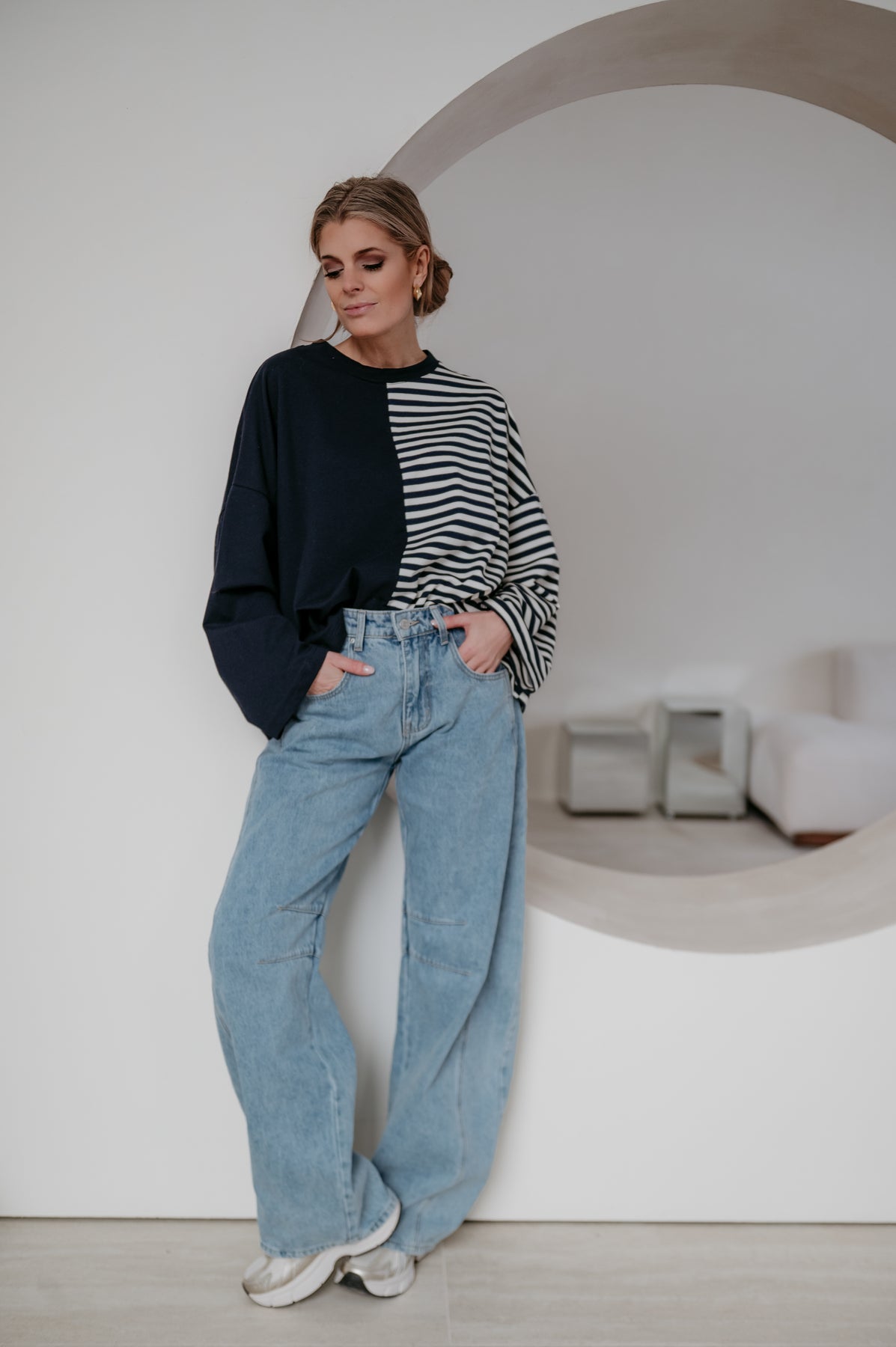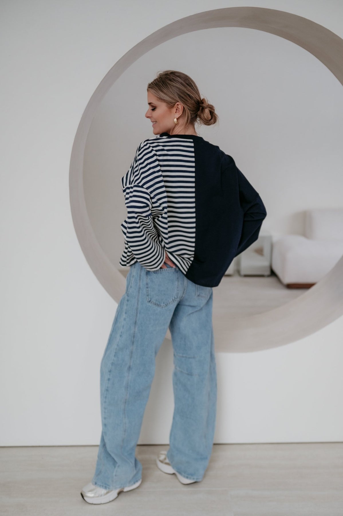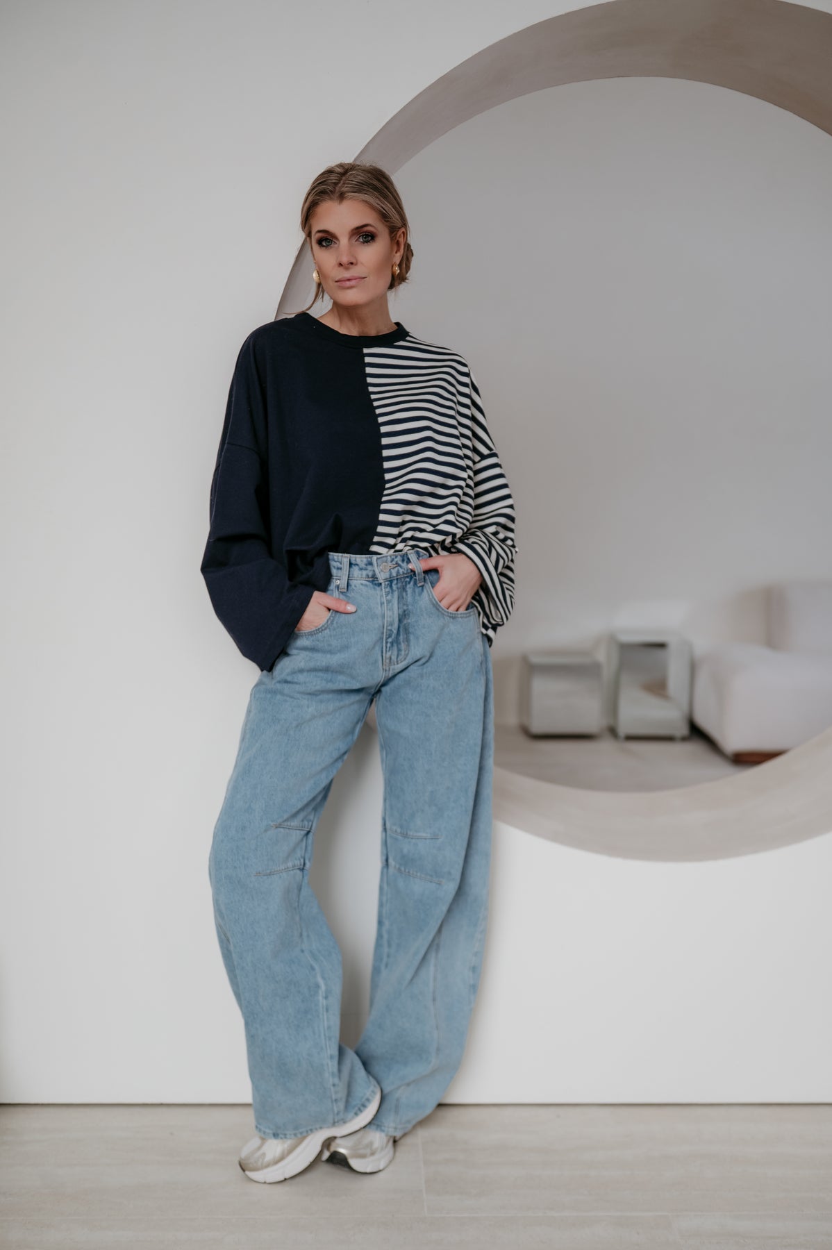 Deze longsleeve is echt iets bijzonders met langs de ene kant streepjes en langs de andere kant effen.
