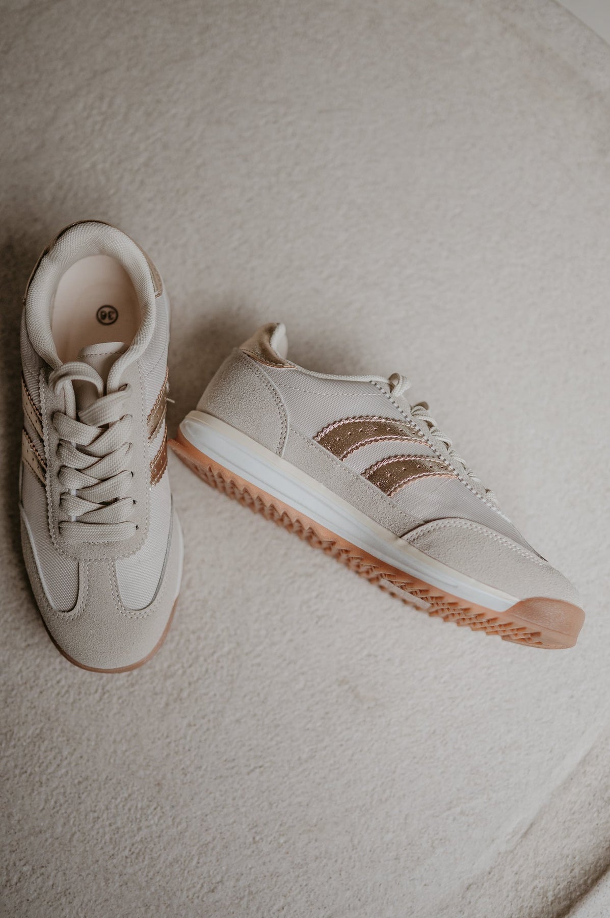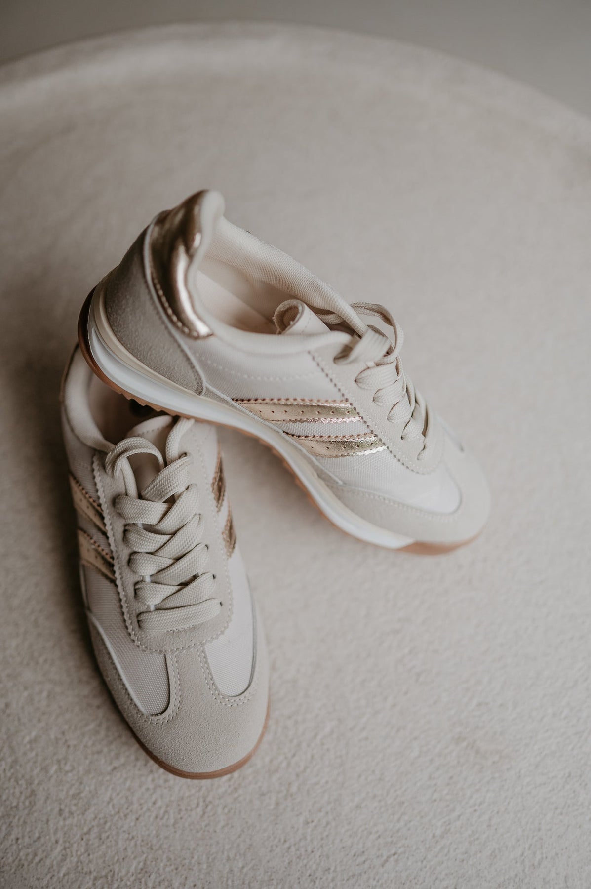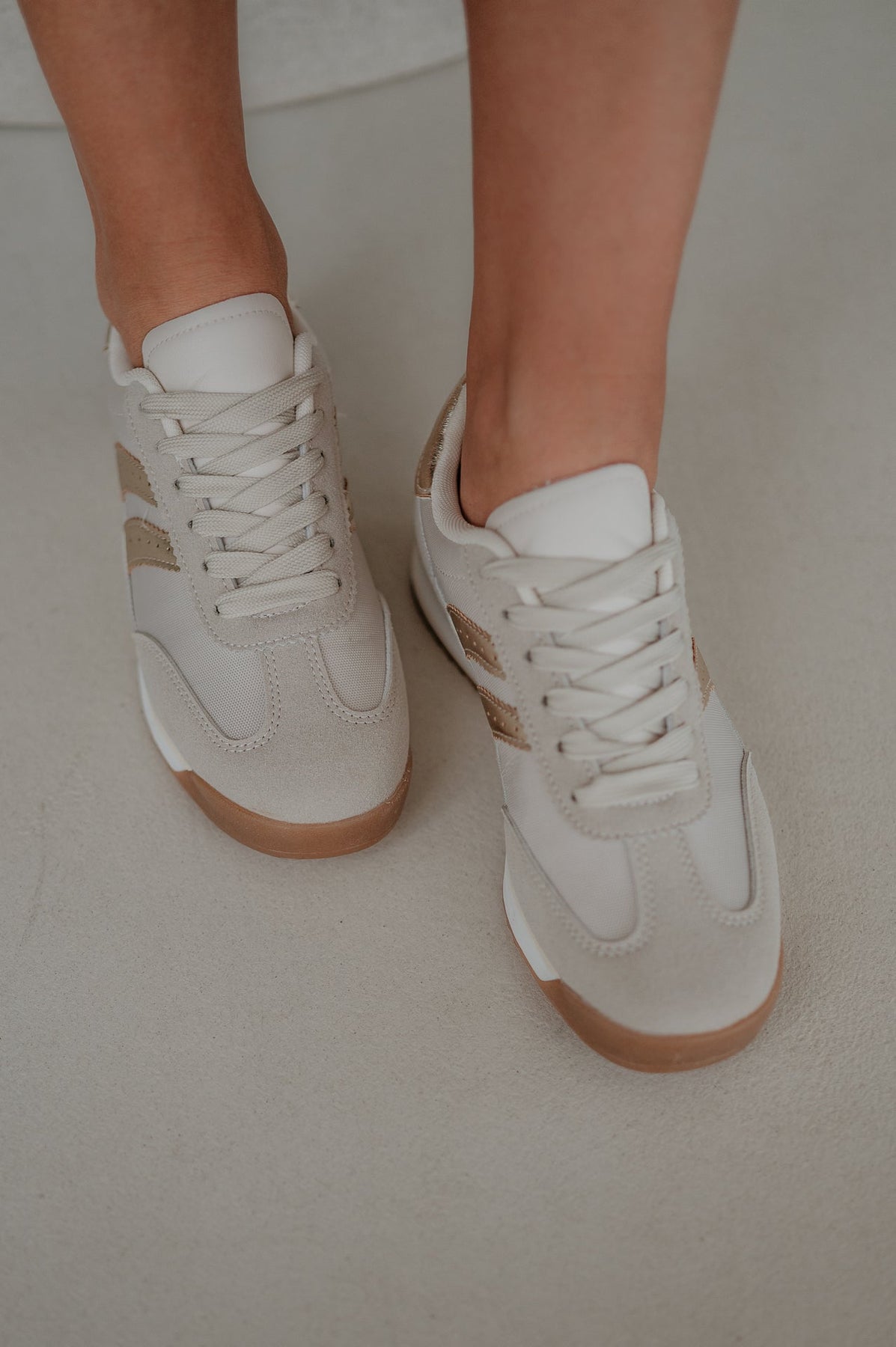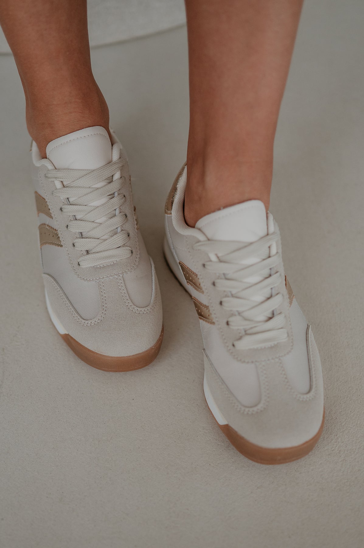 Deze beige sneakers met gouden details zijn de perfecte mix van comfort en fashionable flair.