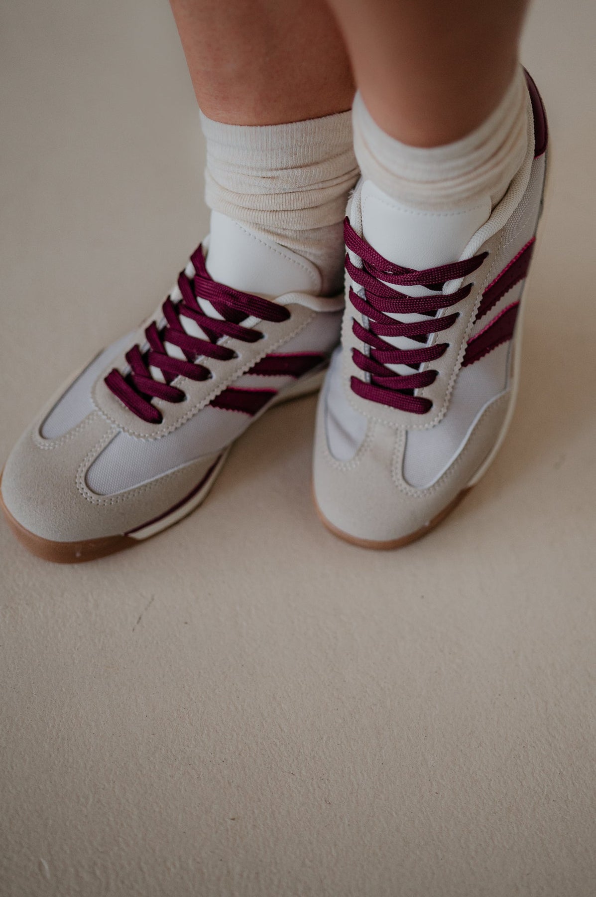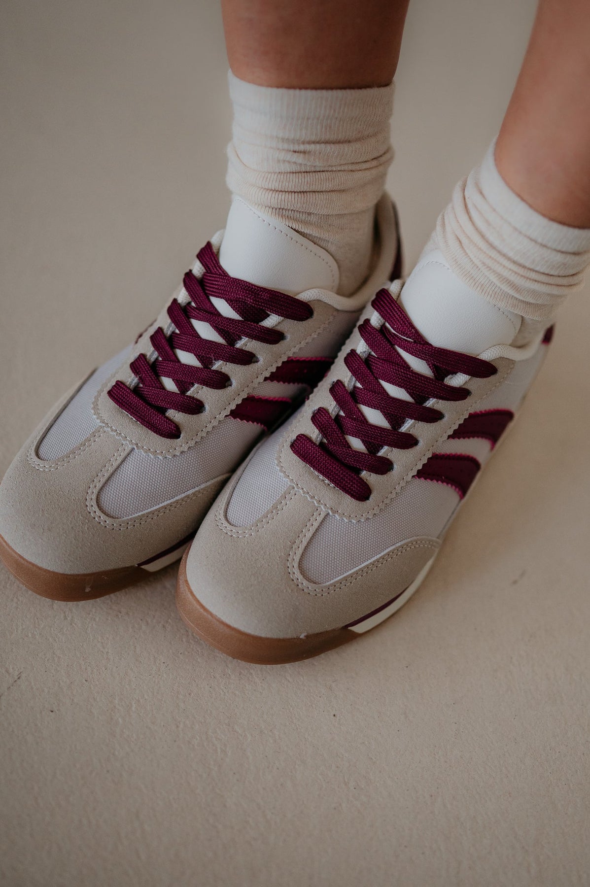 Deze heel toffe beige sneakers met burgundy veters en details geven je outfit direct een modieuze twist.