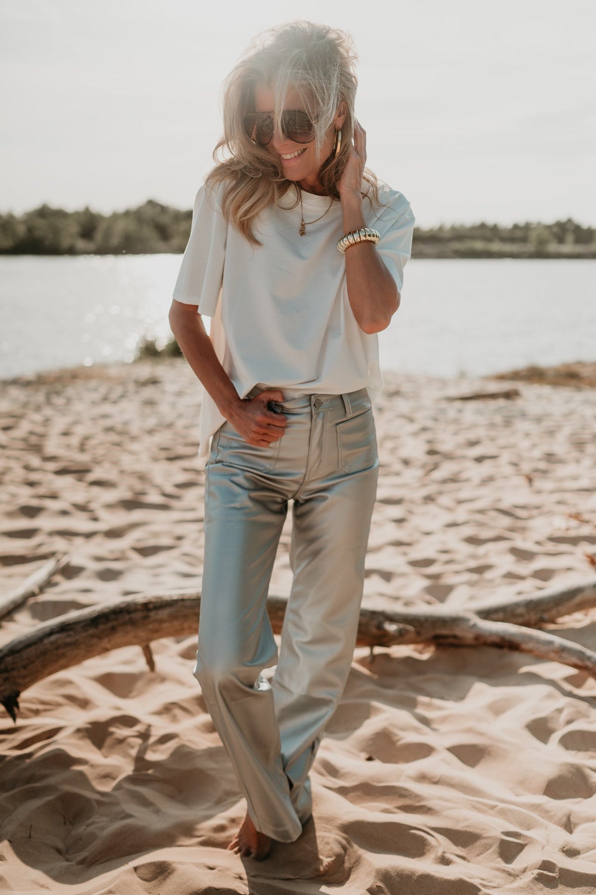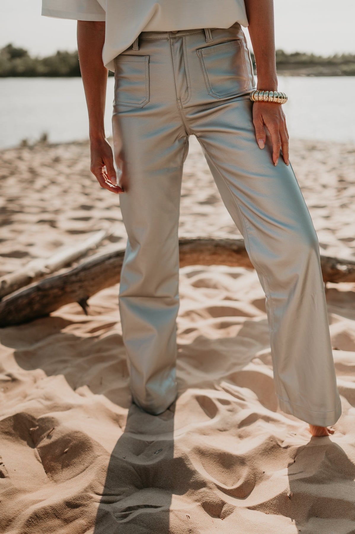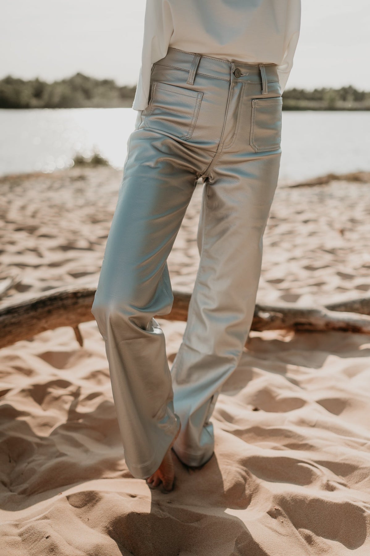 Deze zilveren broek is een gedurfde en futuristische toevoeging aan je garderobe.