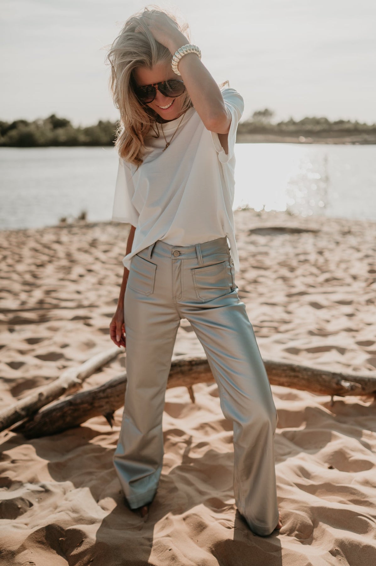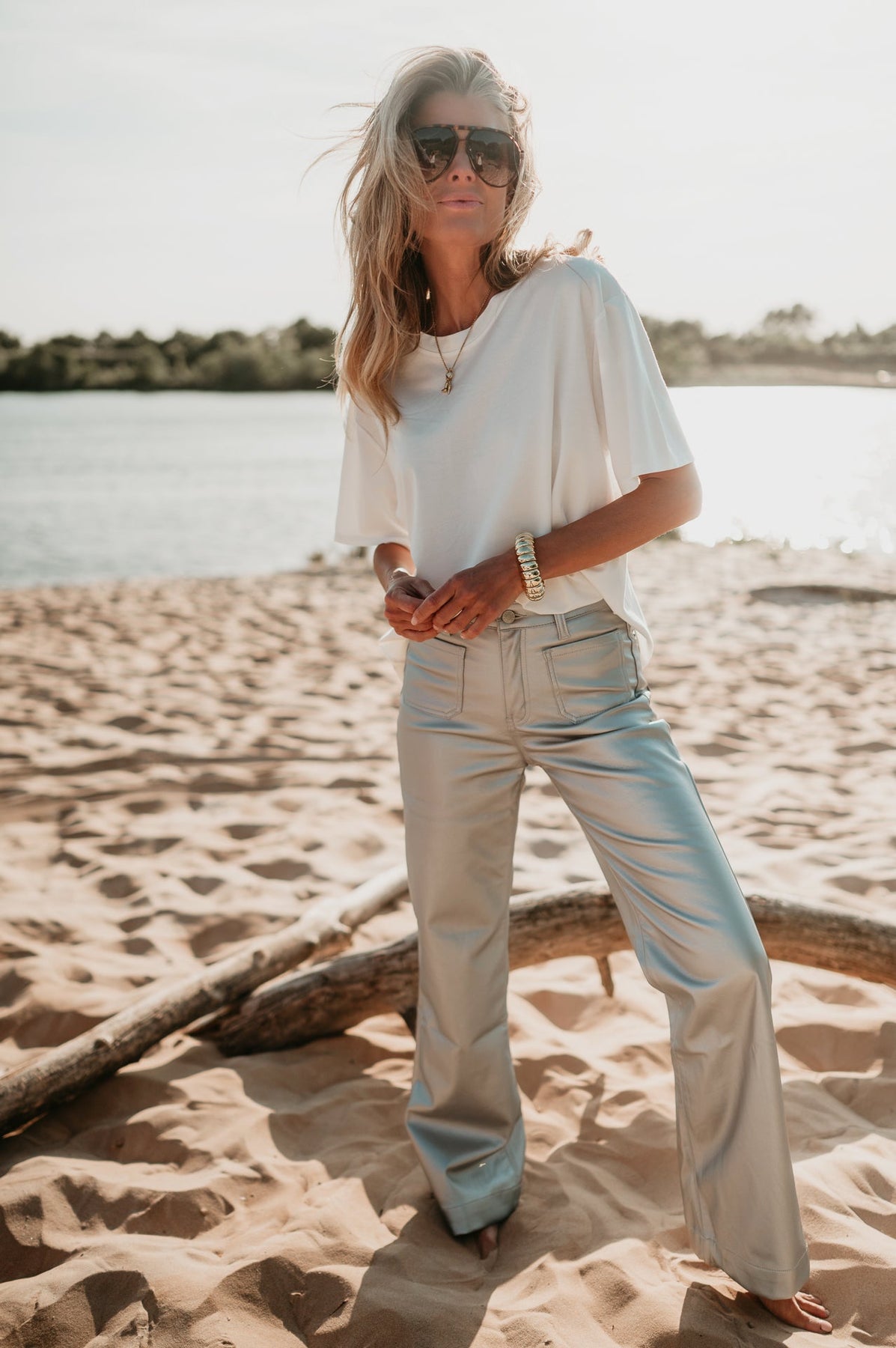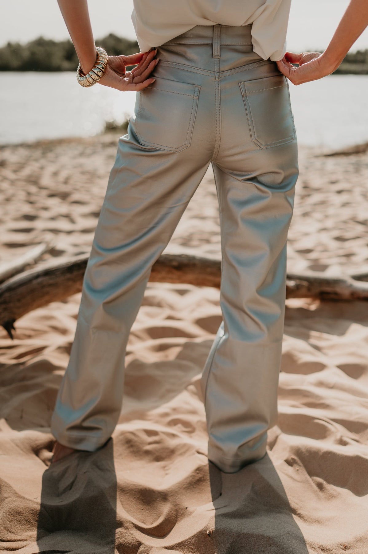 Deze zilveren broek is een gedurfde en futuristische toevoeging aan je garderobe.