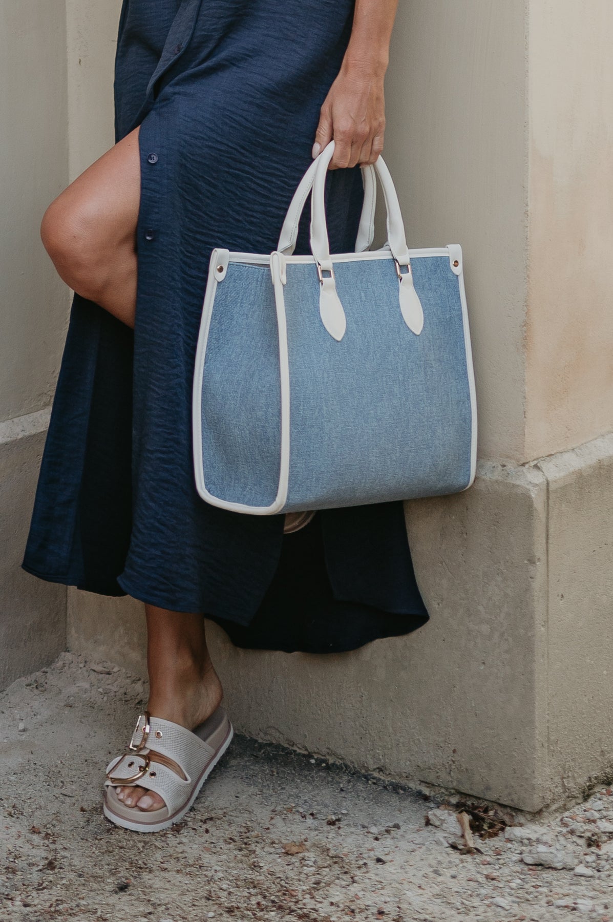 Blauwe handtas met ecru details, een elegante combinatie die overal bij past.