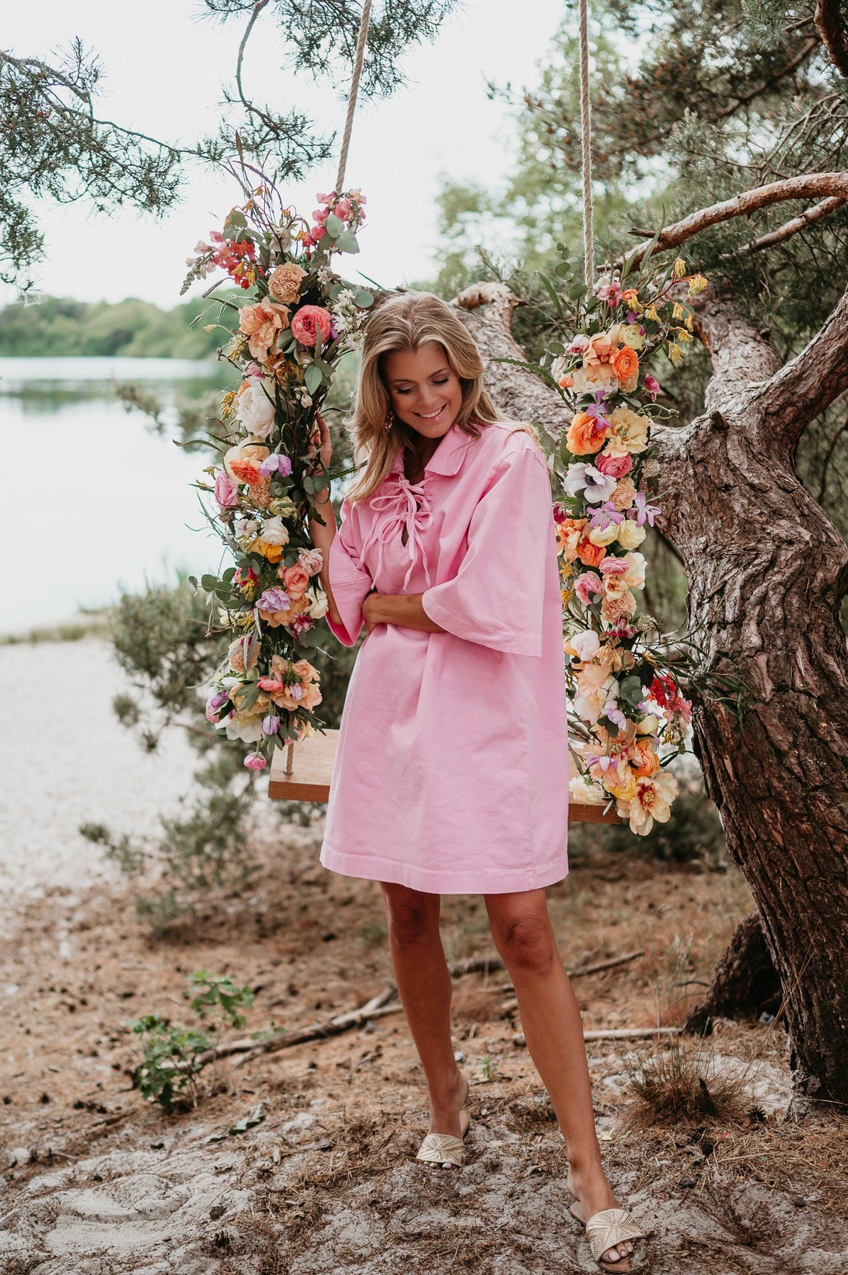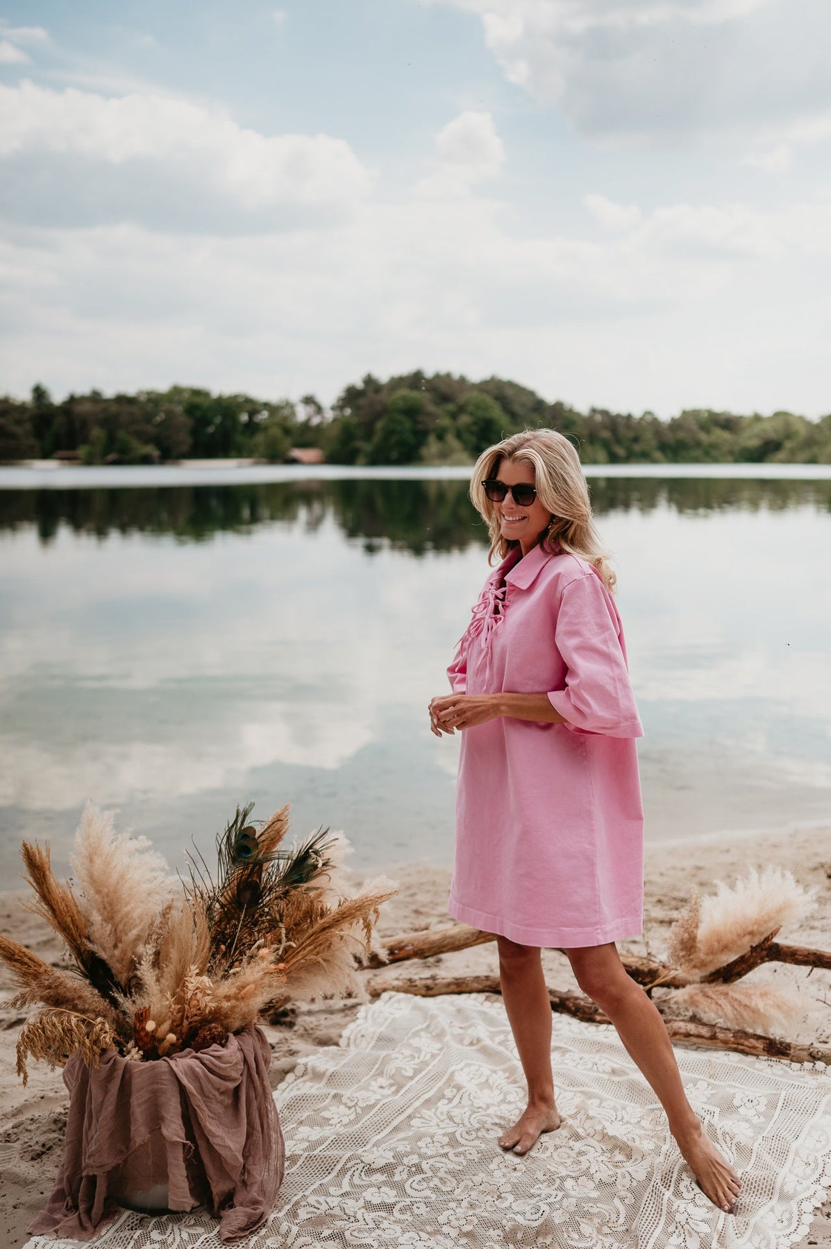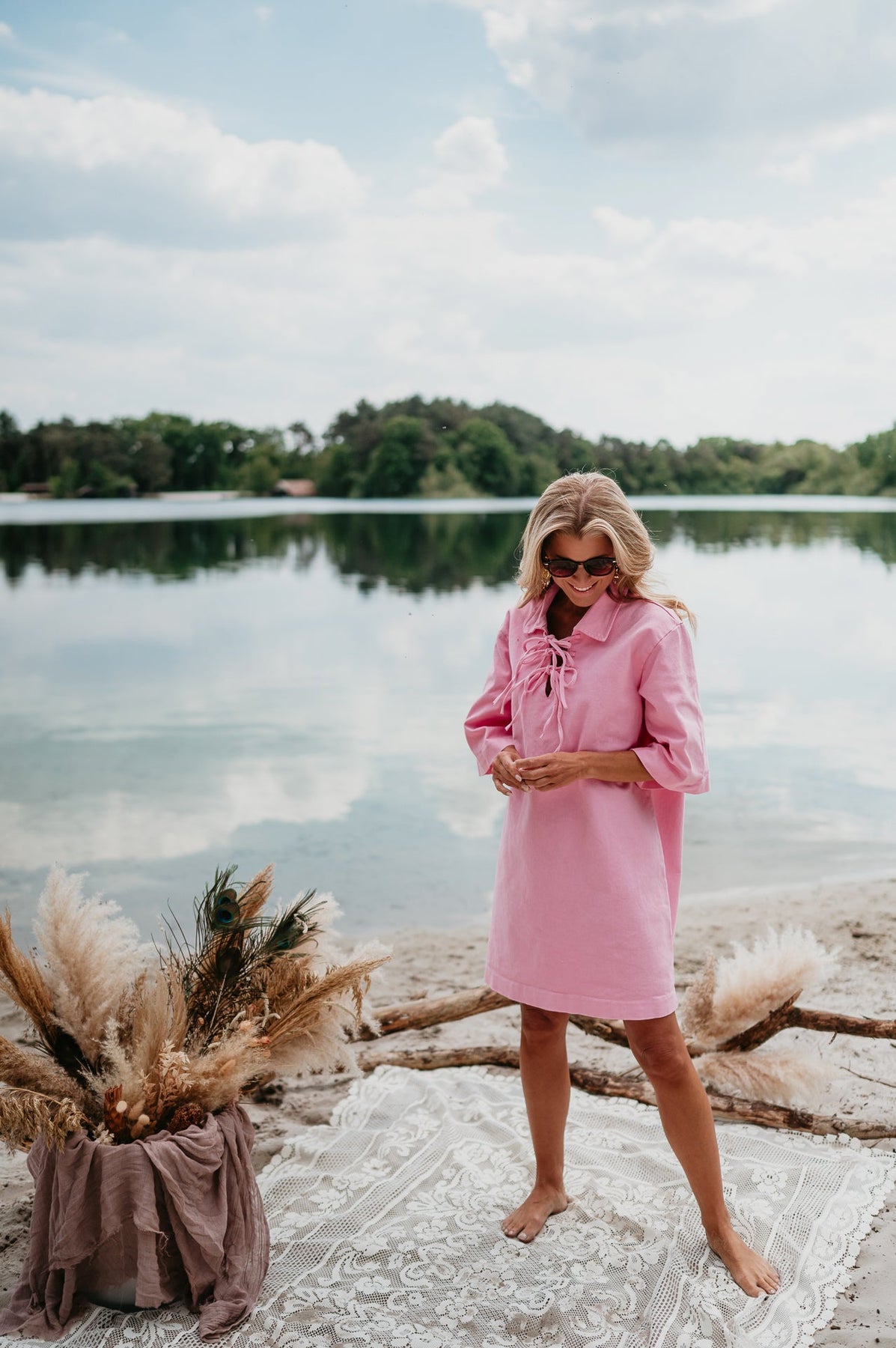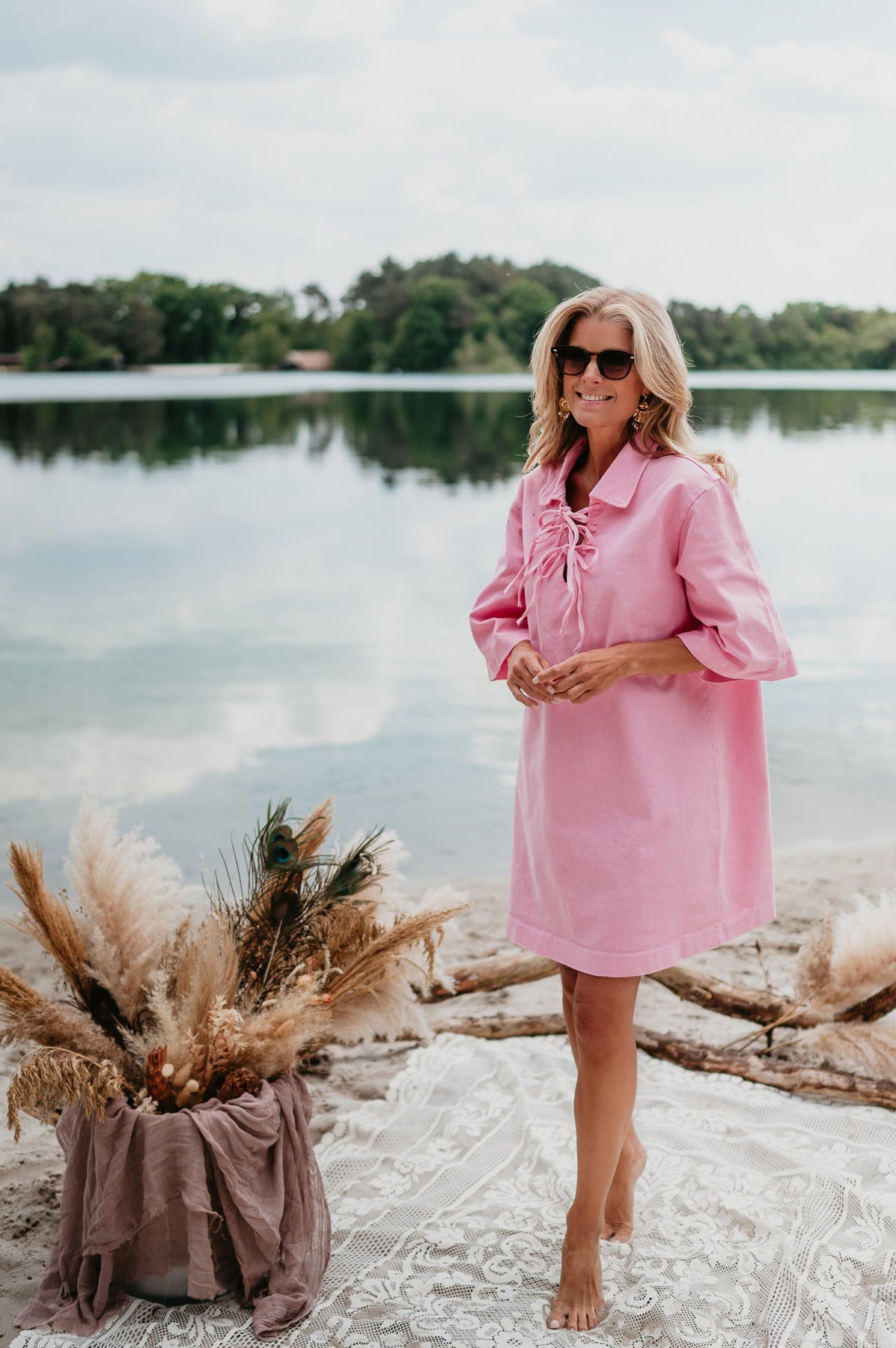 Heel leuk jeans kleedje met fijne strikjes vooraan die zorgen voor een speels en vrouwelijk detail.