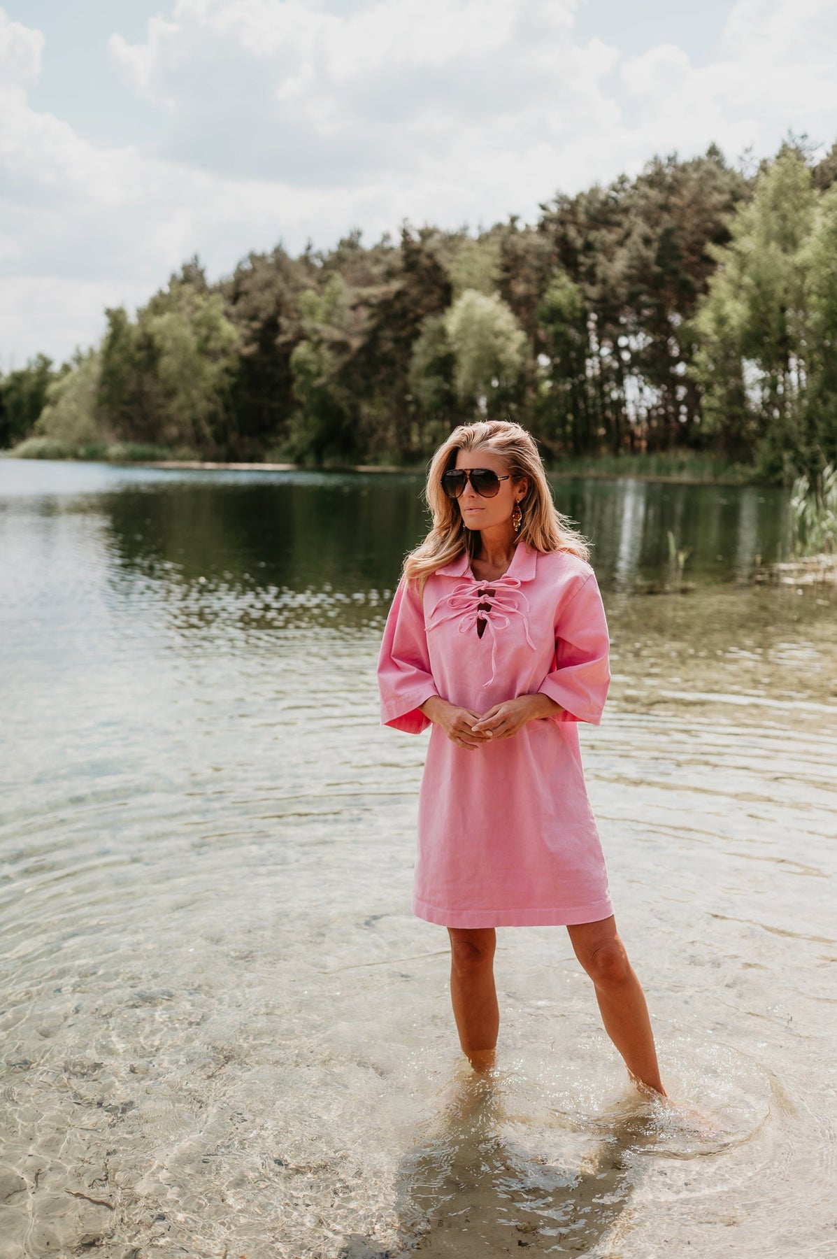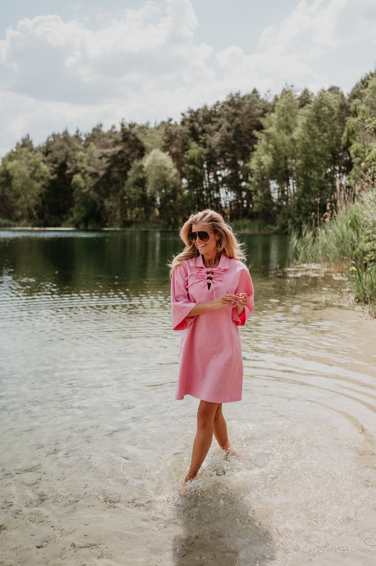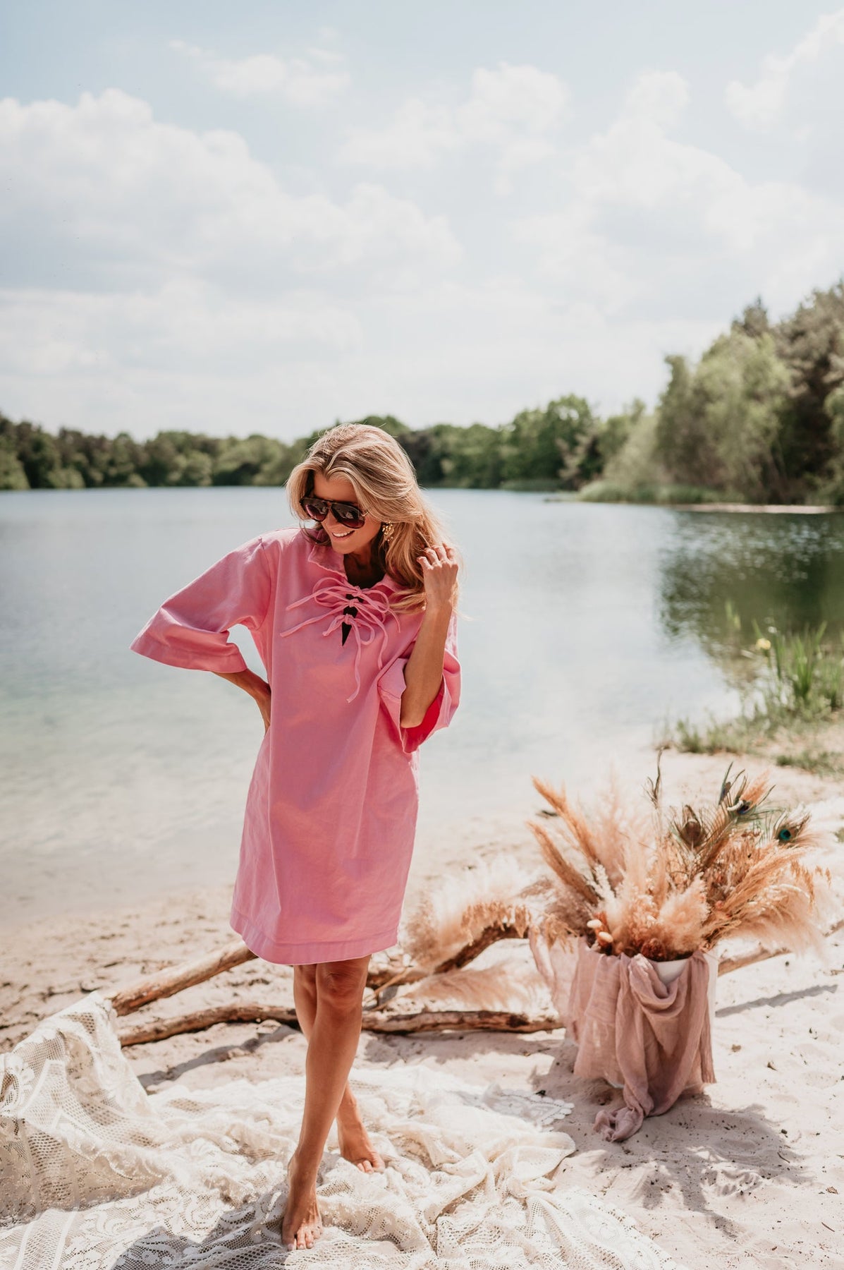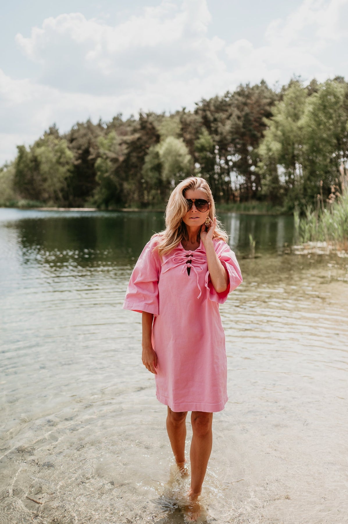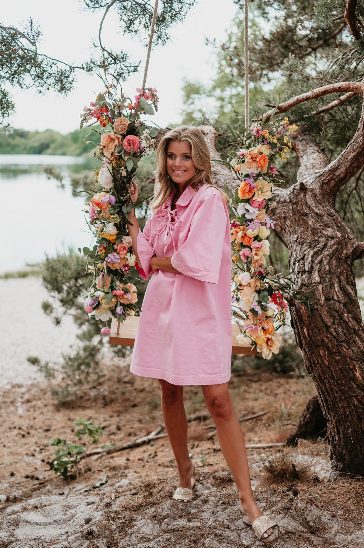 Heel leuk jeans kleedje met fijne strikjes vooraan die zorgen voor een speels en vrouwelijk detail.